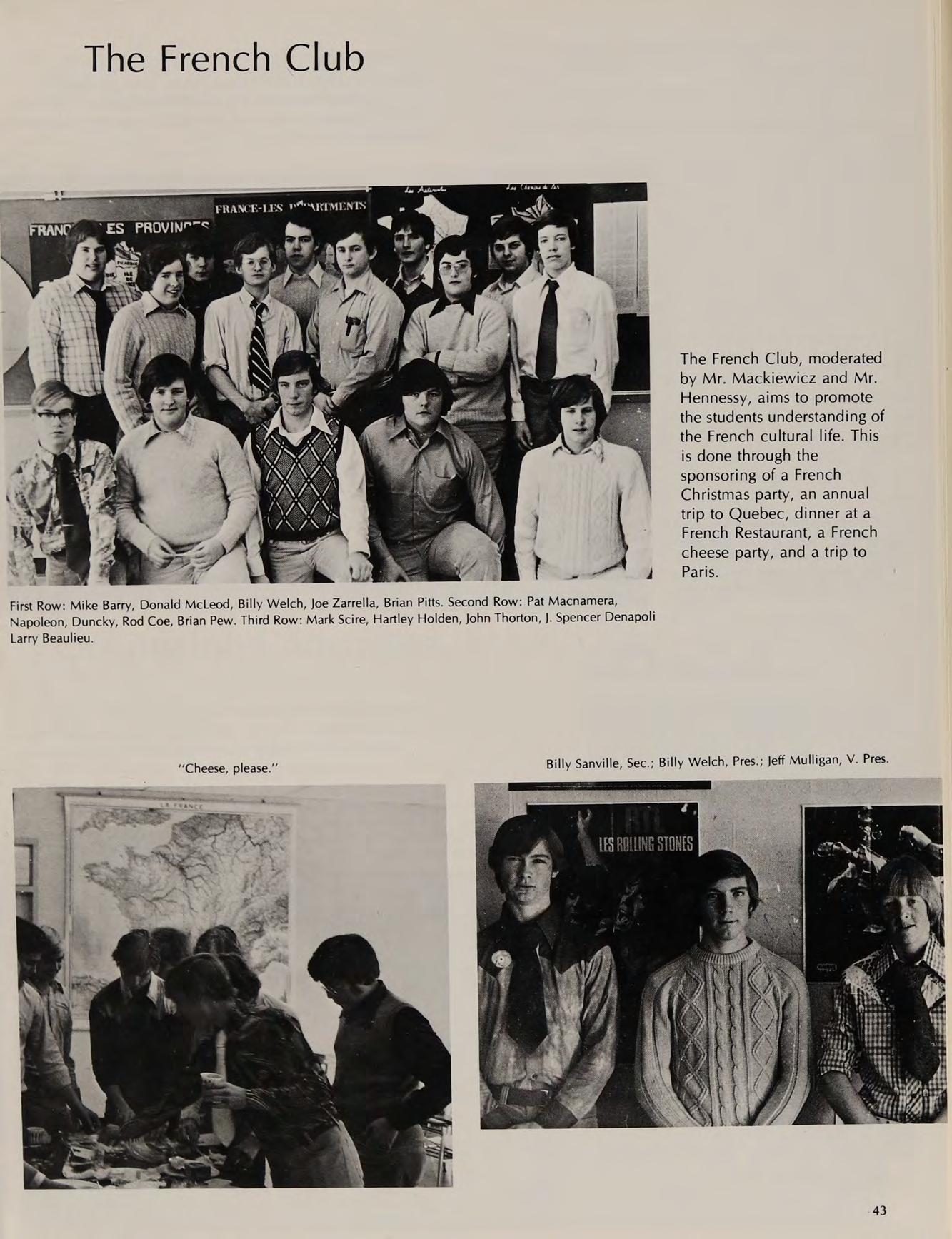 The French Club, moderated by Mr. Mackiewicz and Mr. Hennessy, aims to promote the students understanding of the French cultural life. This is done through the sponsoring of a French Christmas party, an annual trip to Quebec, dinner at a French Restaurant, a French cheese party, and a trip to Paris.