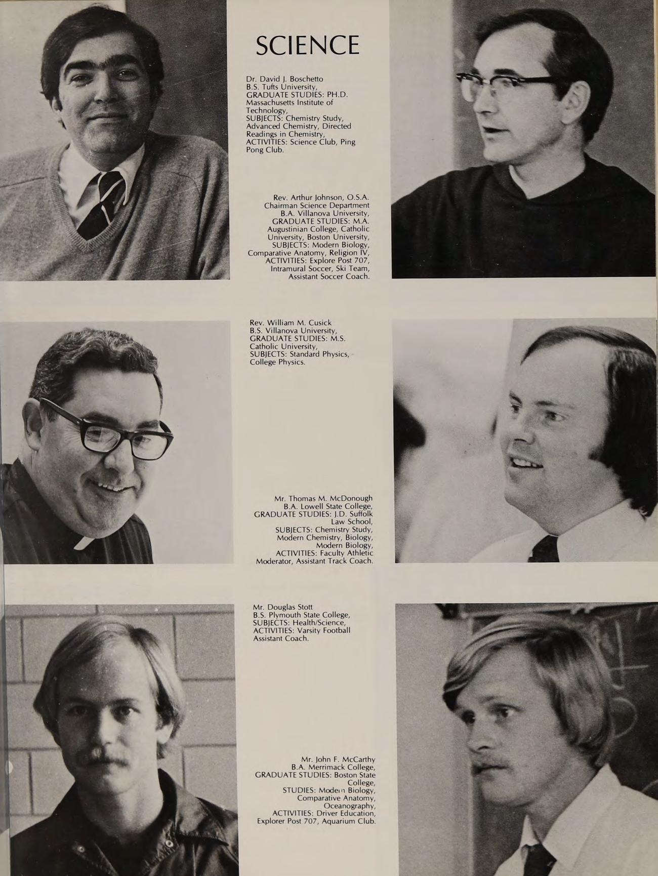 B.A. Villanova University, GRADUATE STUDIES: M.A. Augustinian College, Catholic University, Boston University, SUBJECTS: Modern Biology, Comparative Anatomy, Religion IV, ACTIVITIES: Explore Post 707, Intramural Soccer, Ski Team, Assistant Soccer Coach.
