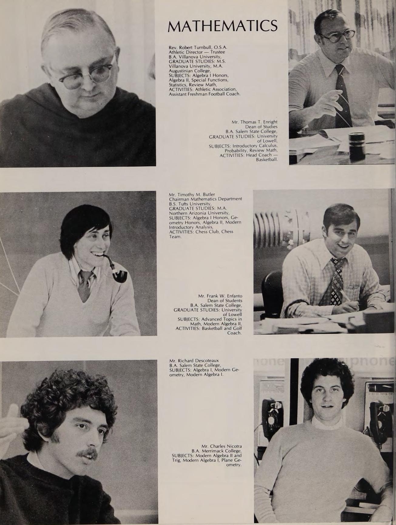 Chairman Mathematics Department B.S. Tufts University, GRADUATE STUDIES: M.A. Northern Arizonia University, SUBJECTS: Algebra Honors, Geometry Honors, Algebra Il, Modern Introductory Analysis, ACTIVITIES: Chess Club, Chess Team.