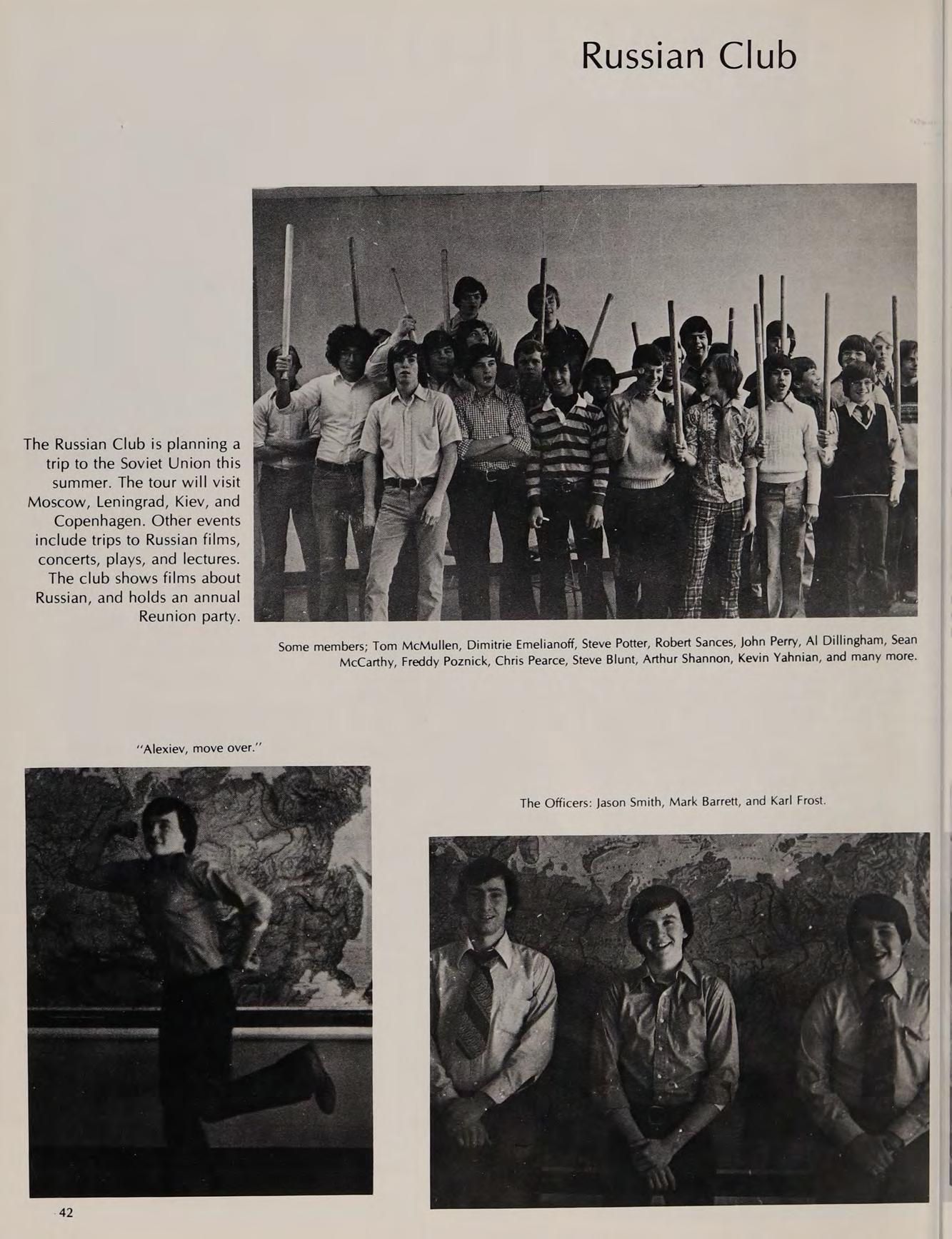 The Russian Club is planning a trip to the Soviet Union this summer. The tour will visit Moscow, Leningrad, Kiev, and Copenhagen. Other events include trips to Russian films, concerts, plays, and lectures. The club shows films about Russian, and holds an annual Reunion party.