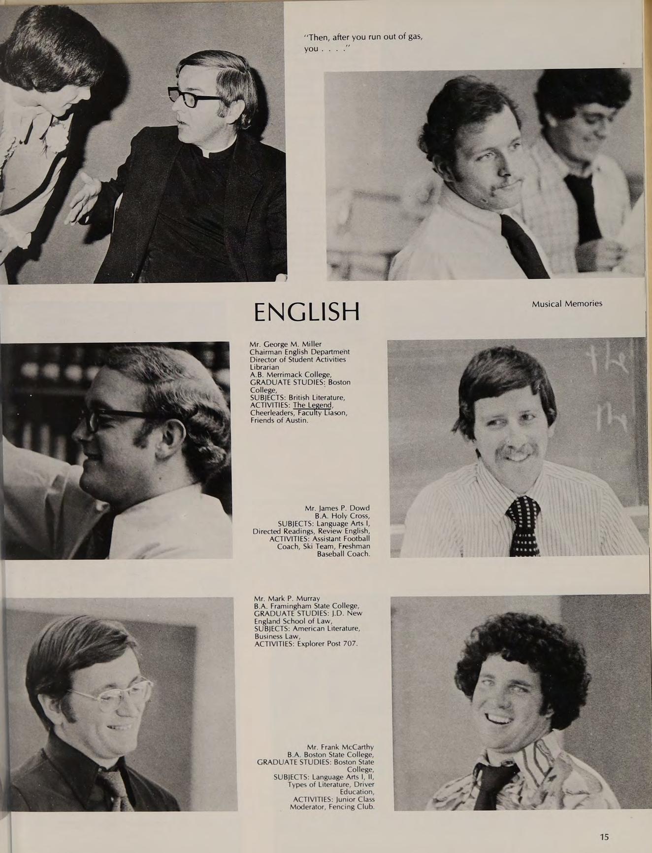 Mr. Charles L. McCarthy A.B. Boston College, GRADUATE STUDIES: M.Ed. Boston Teachers College, SUBJECTS: American Government, Ancient Mediveal History, French I, ACTIVITIES: Current Events Club.