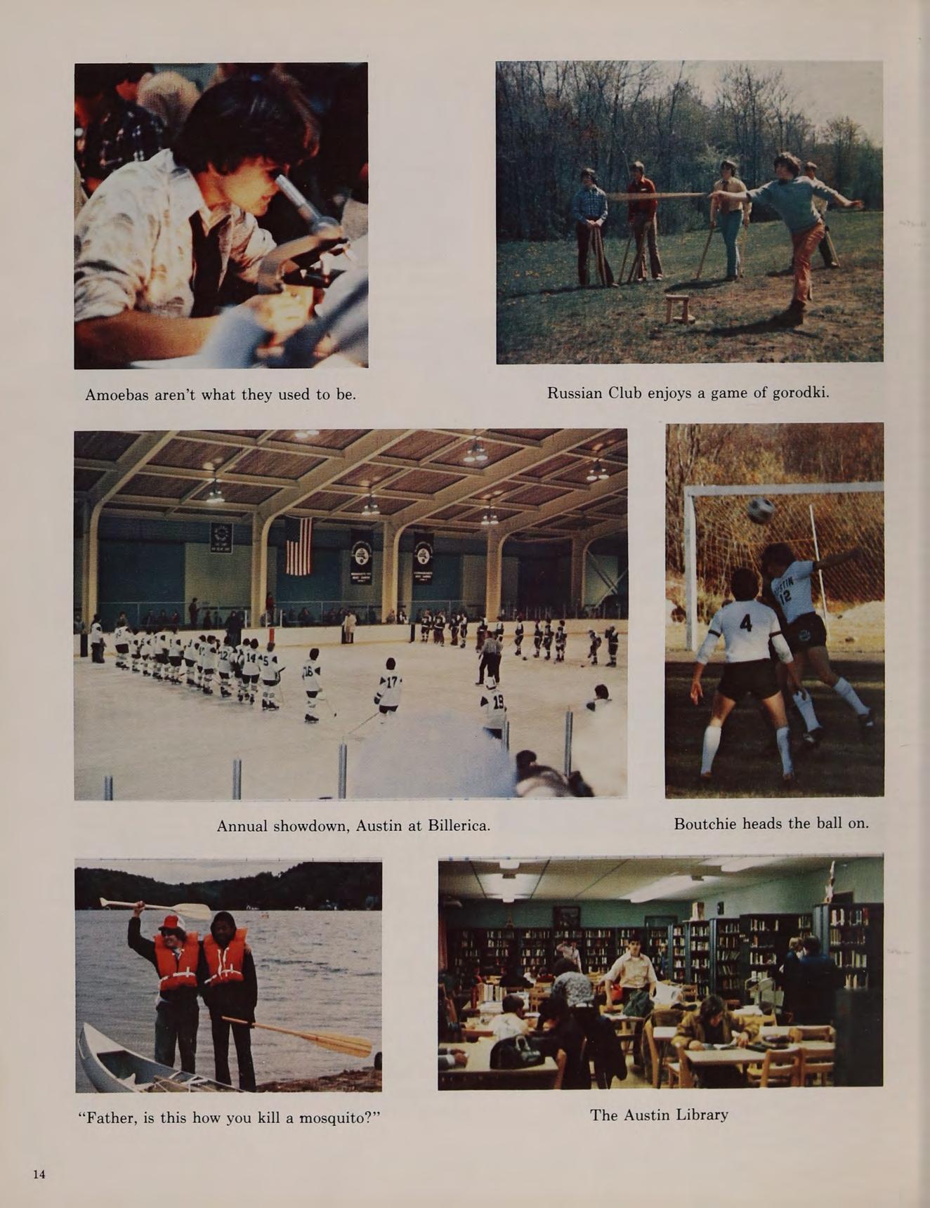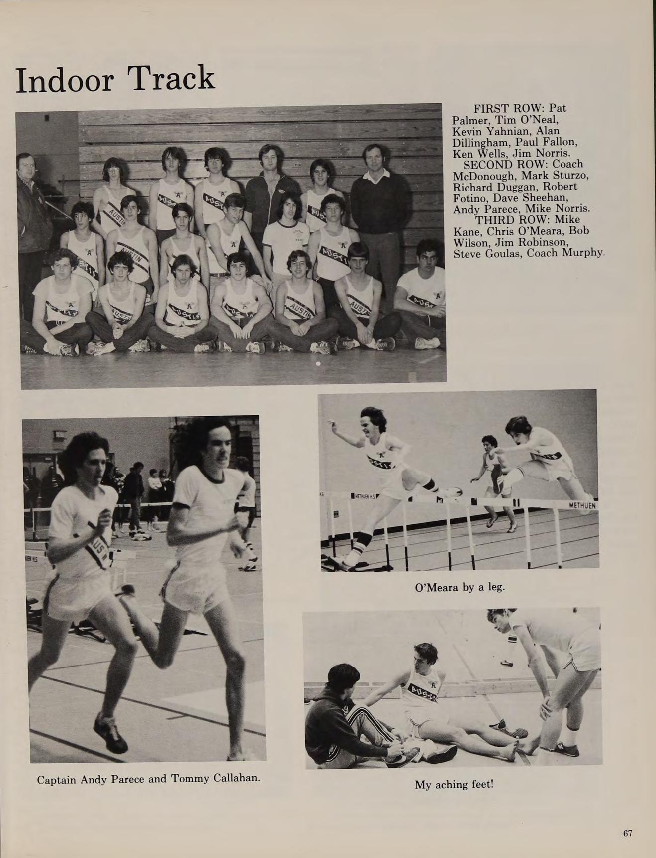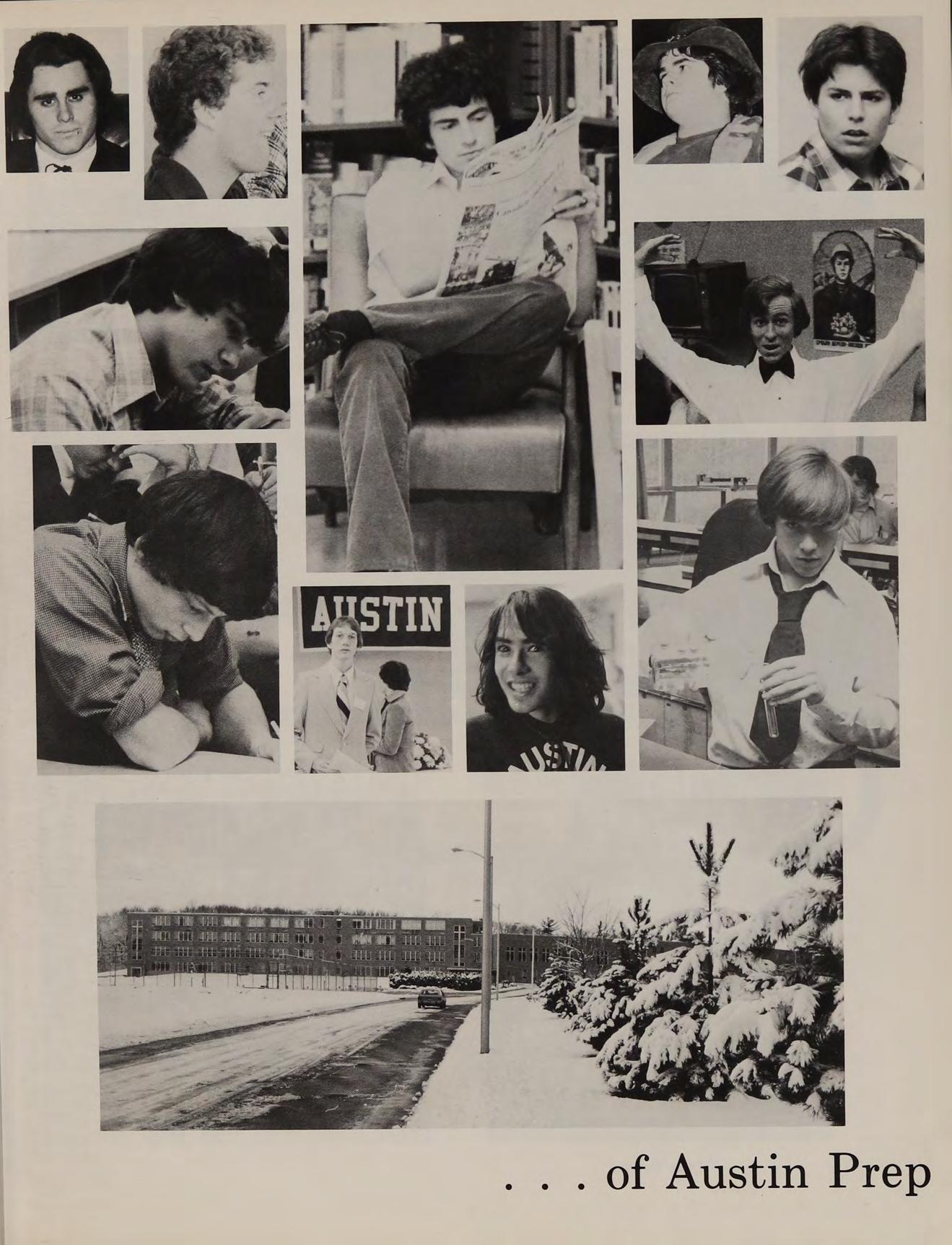 Winter months at Austin proved fruitful. The Blackfriars returned in December after many years of inactivity and presented a series of one-act plays. The hockey team was moved up into Division I and responded by working their way into the semi-finals of the State Championship. They lost in Boston to powerful Matingnon. The highlight of the season was an upset romp over second-seed Norword after having to push the school bus through a snowstorm. The maturing winter track team continued to improve. Their best season ever was an encouraging 5-3-1 record. Socially the school was active: many juniors and seniors attended the successful Winter Prom held in the school cafeteria. The storm of ’78 provided the students of Austin with an unscheduled week of vacation but upon returning to school we were brought back to reality by mid-year examinations.