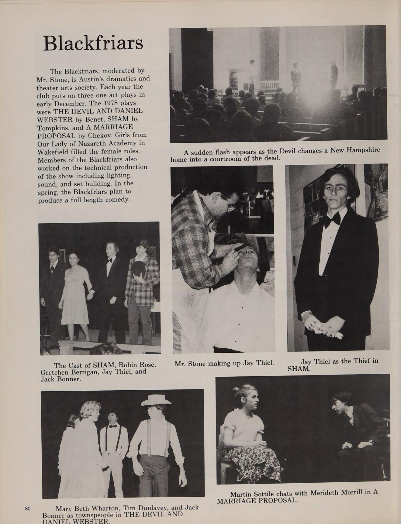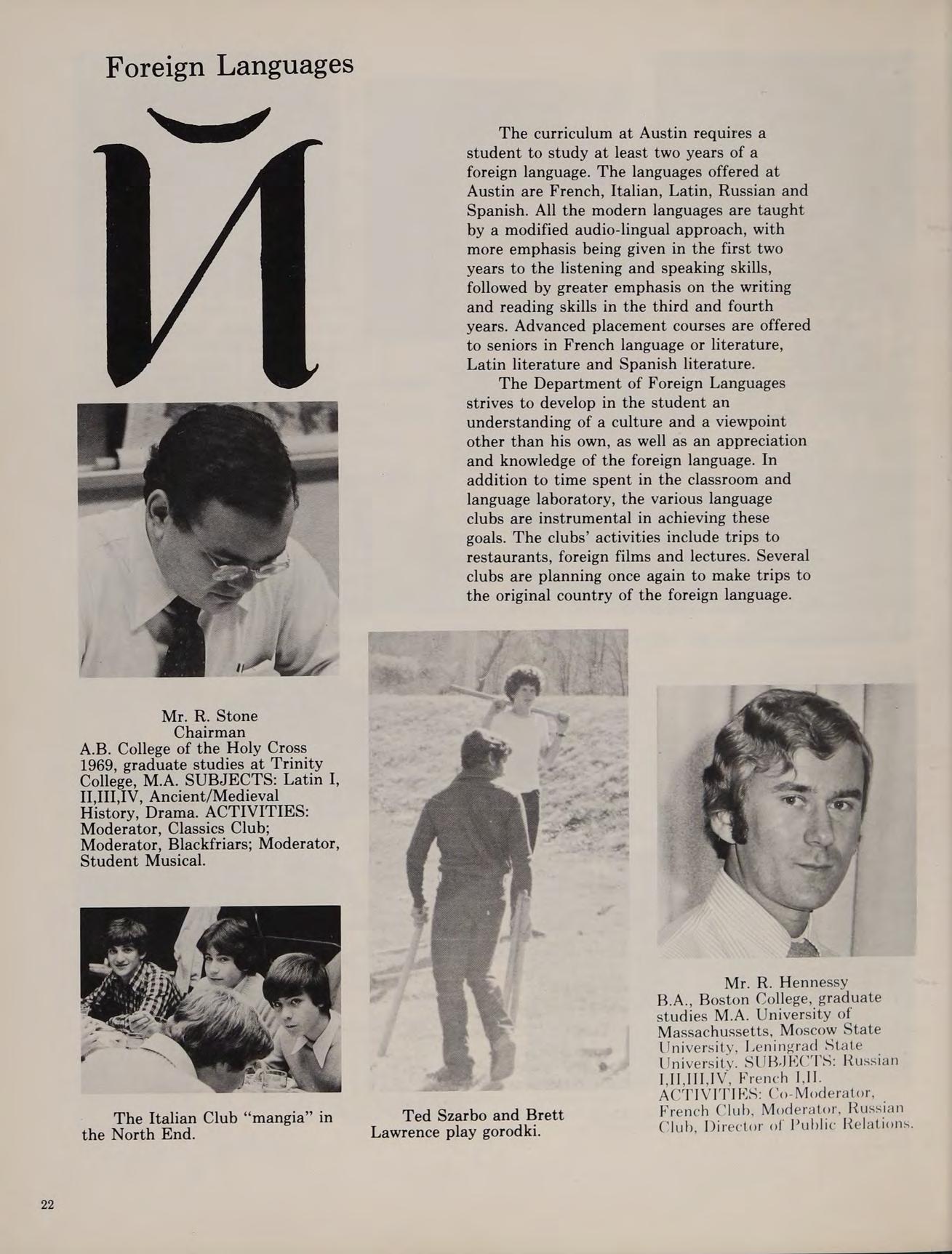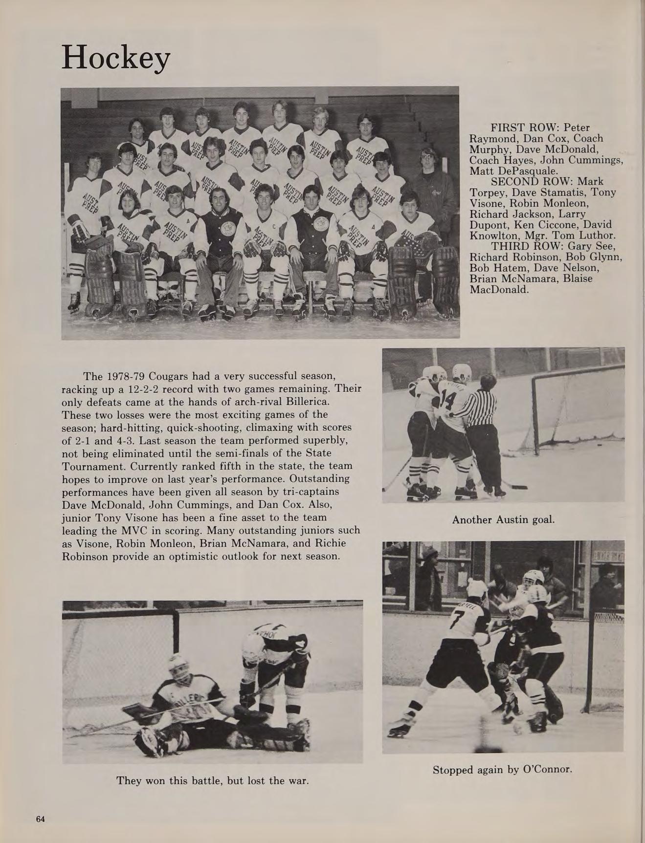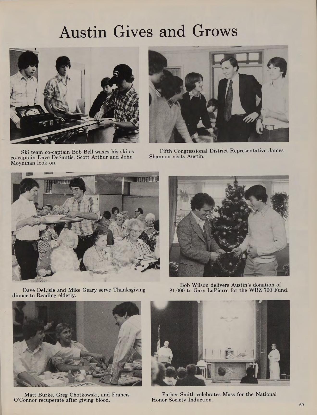 Winter months at Austin proved fruitful. The Blackfriars returned in December after many years of inactivity and presented a series of one-act plays. The hockey team was moved up into Division I and responded by working their way into the semi-finals of the State Championship. They lost in Boston to powerful Matingnon. The highlight of the season was an upset romp over second-seed Norword after having to push the school bus through a snowstorm. The maturing winter track team continued to improve. Their best season ever was an encouraging 5-3-1 record. Socially the school was active: many juniors and seniors attended the successful Winter Prom held in the school cafeteria. The storm of ’78 provided the students of Austin with an unscheduled week of vacation but upon returning to school we were brought back to reality by mid-year examinations.