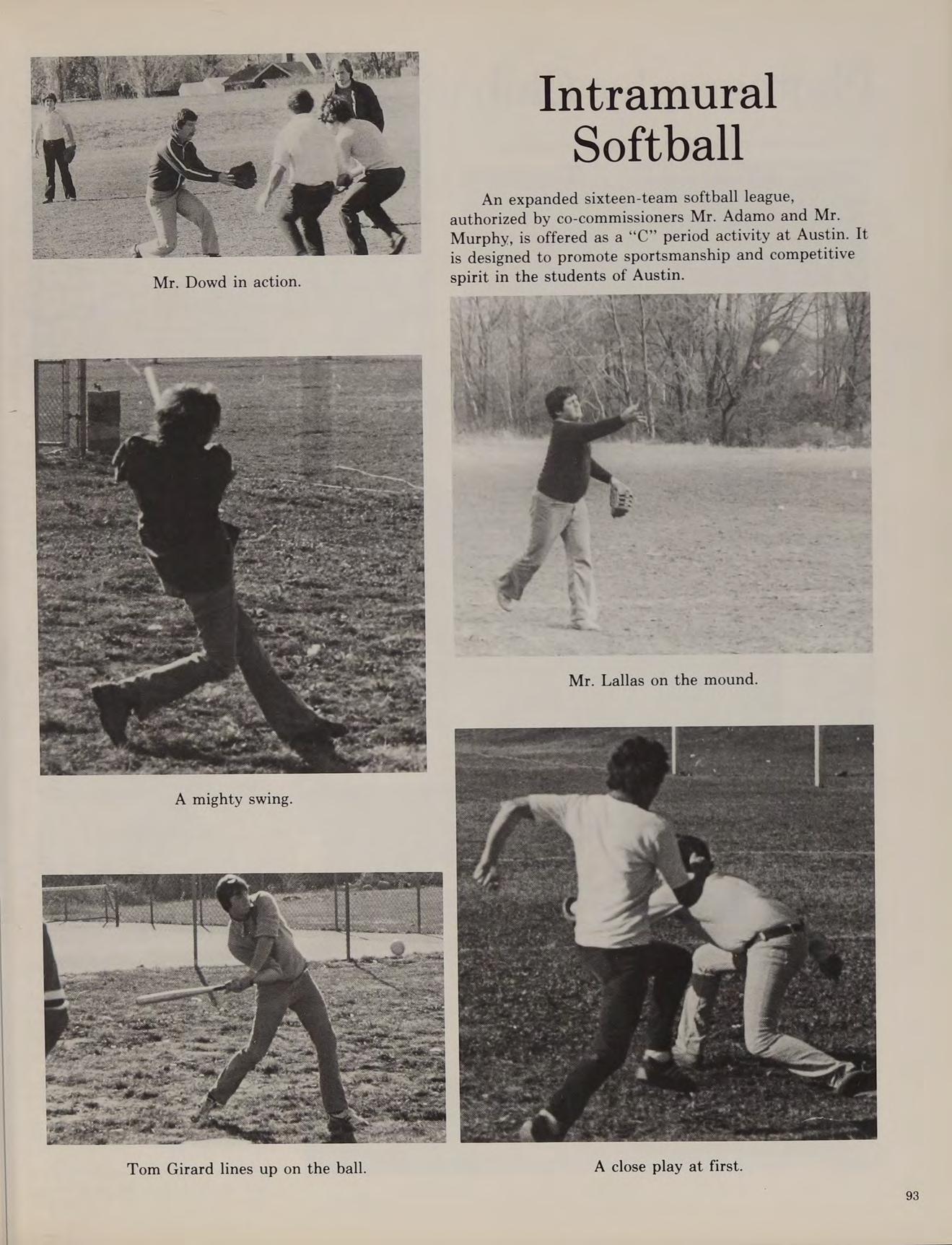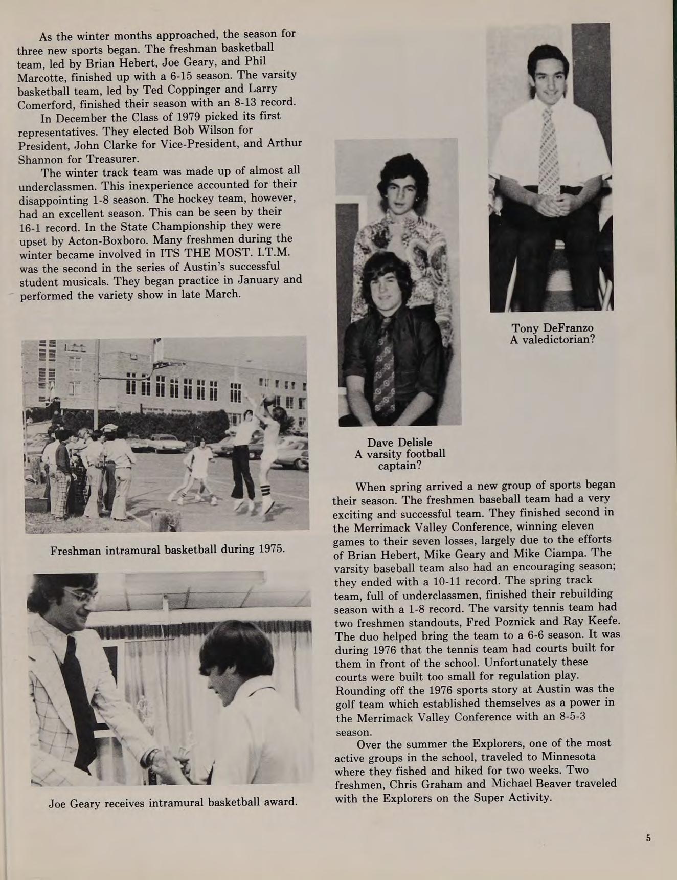 When spring arrived a new group of sports began their season. The freshmen baseball team had a very exciting and successful team. They finished second in the Merrimack Valley Conference, winning eleven games to their seven losses, largely due to the efforts of Brian Hebert, Mike Geary and Mike Ciampa. The varsity baseball team also had an encouraging season; they ended with a 10-11 record. The spring track team, full of underclassmen, finished their rebuilding season with a 1-8 record. The varsity tennis team had two freshmen standouts, Fred Poznick and Ray Keefe. The duo helped bring the team to a 6-6 season. It was during 1976 that the tennis team had courts built for them in front of the school. Unfortunately these courts were built too small for regulation play. Rounding off the 1976 sports story at Austin was the golf team which established themselves as a power in the Merrimack Valley Conference with an 8-5-3 season.