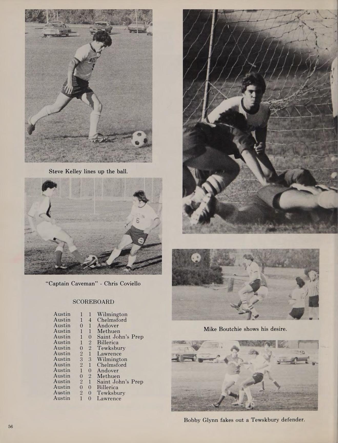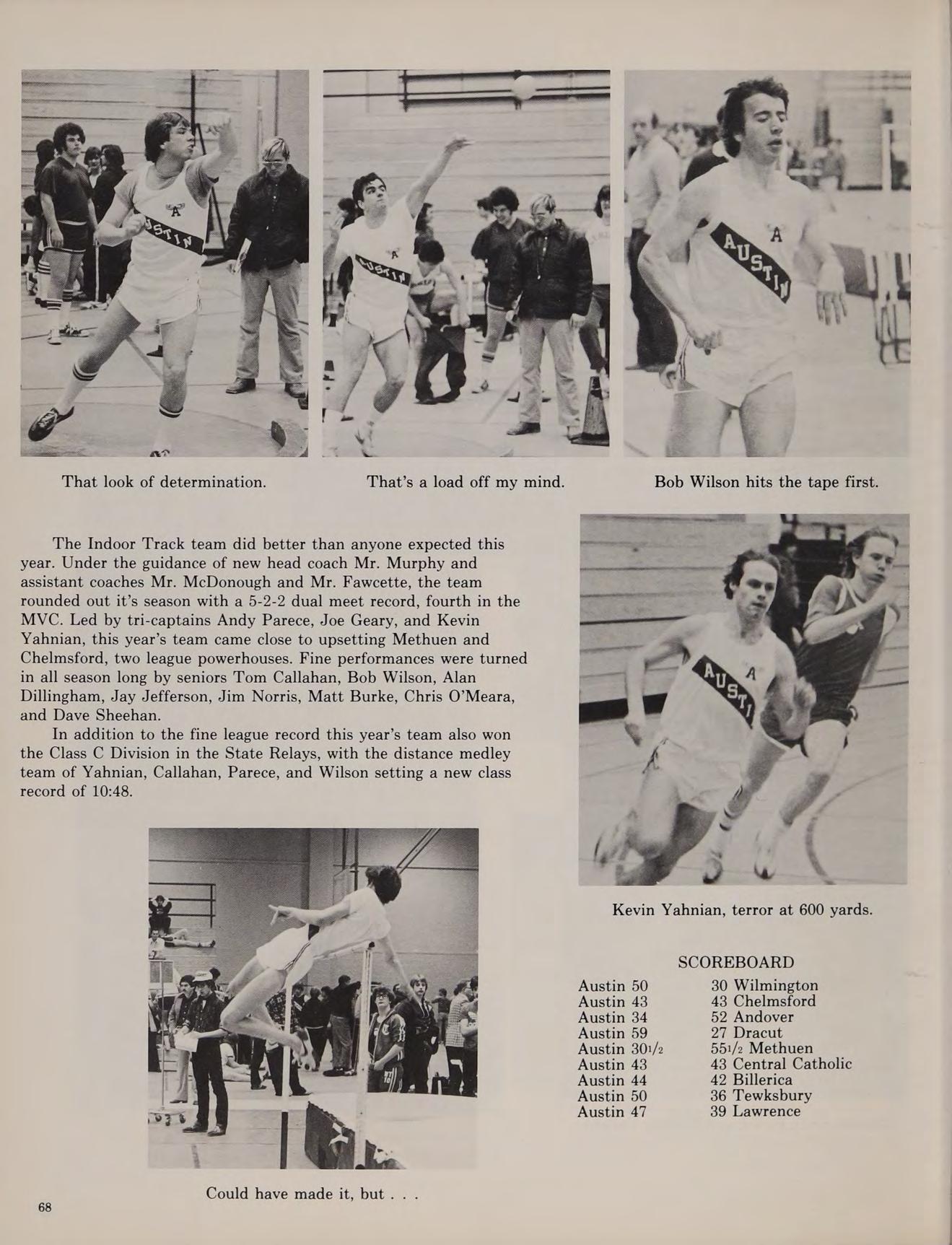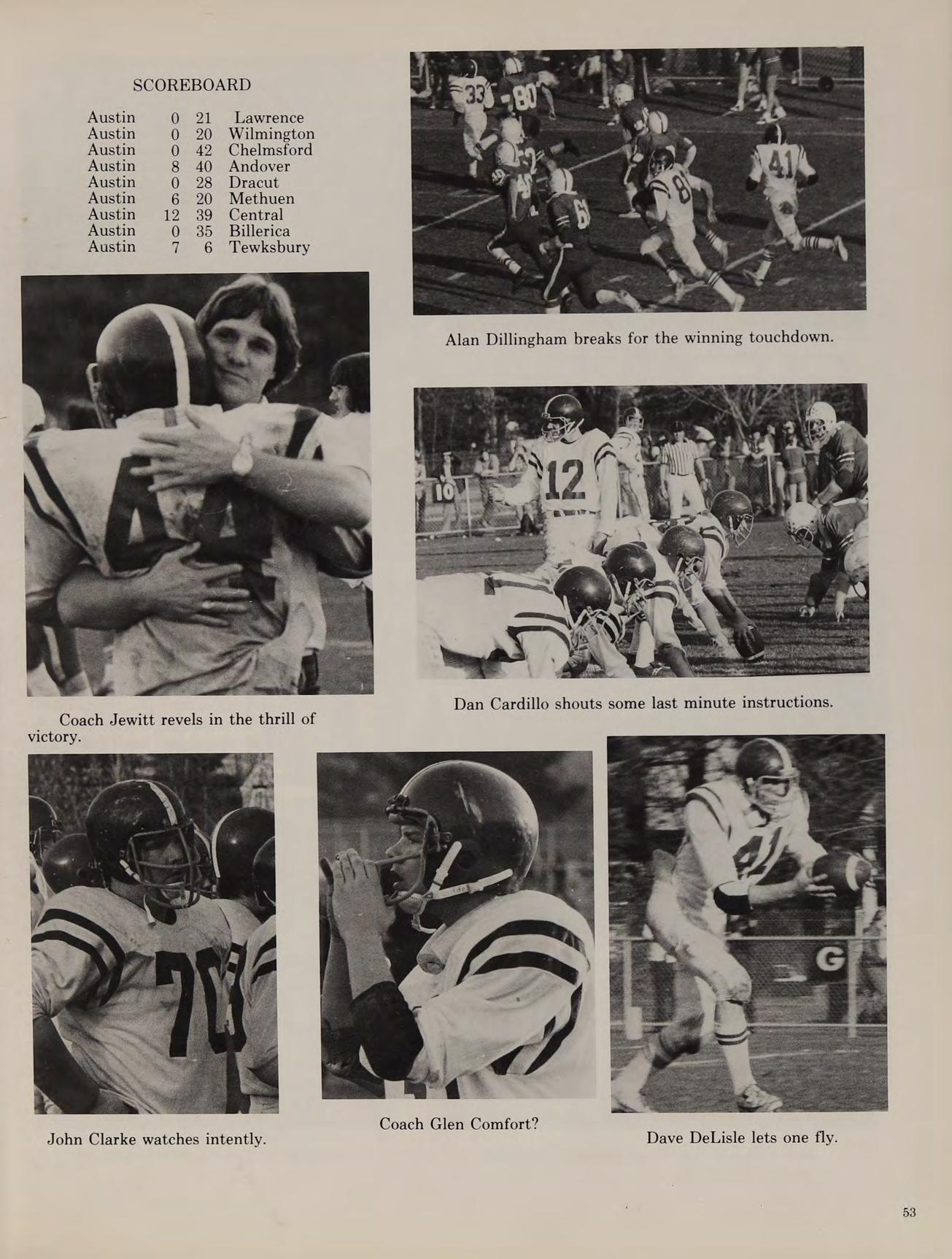 The cross-country team went on to win the Division IV State Championships and started a string of 19 consecutive dual-meet wins lasting well into our senior year. In the fall of 1976, Austin introduced on the varsity level a soccer team which made its debut in Merrimack Valley play, finishing with a 3-11-2 record. The 1976 football season was a long and trying one, as the team could only manage one victory.