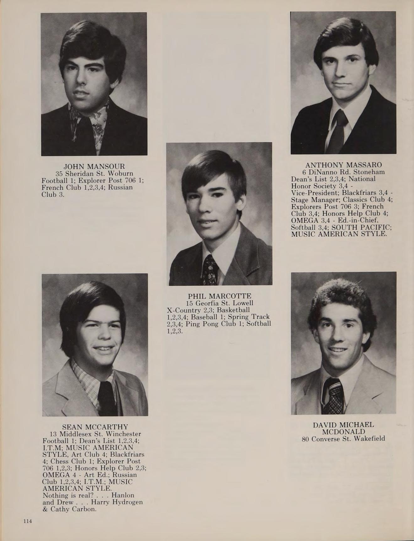 3 Stewart Rd. Reading Dean’s List 1,2,3,4; National Honor Society 3,4; Blackfriars 4; Classics Club 4 - President; French Club 1,2,3,4; Honors Help Club 1,2,3,4, OMEGA 3,4Photo Ed.; Photography Club 4; MUSIC AMERICAN STYLEAsst. Stage Manager.