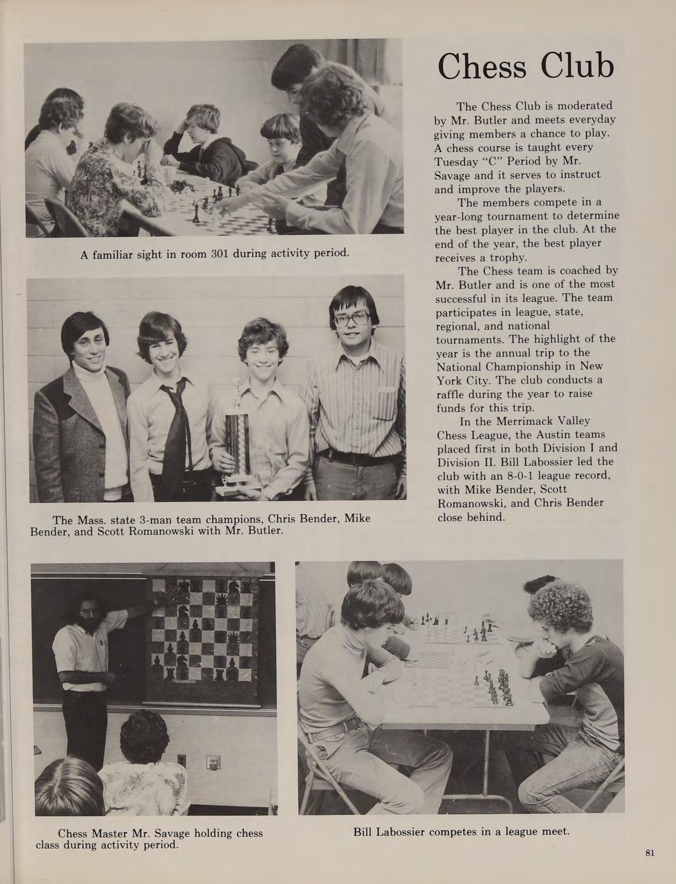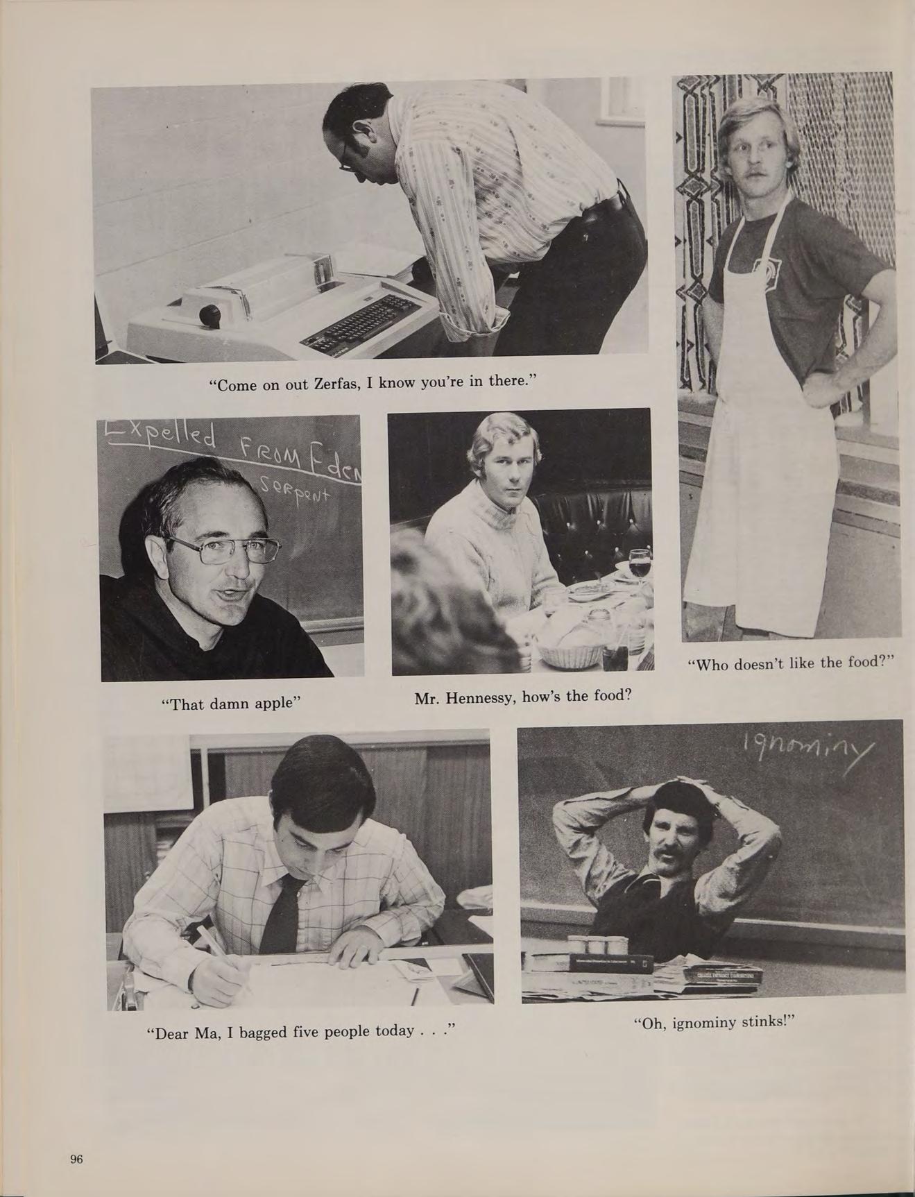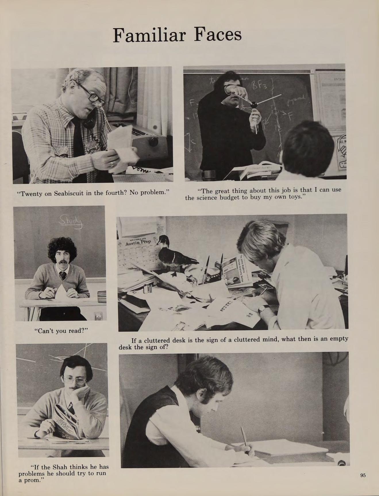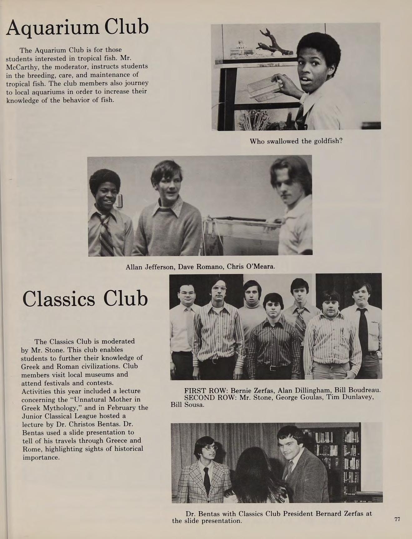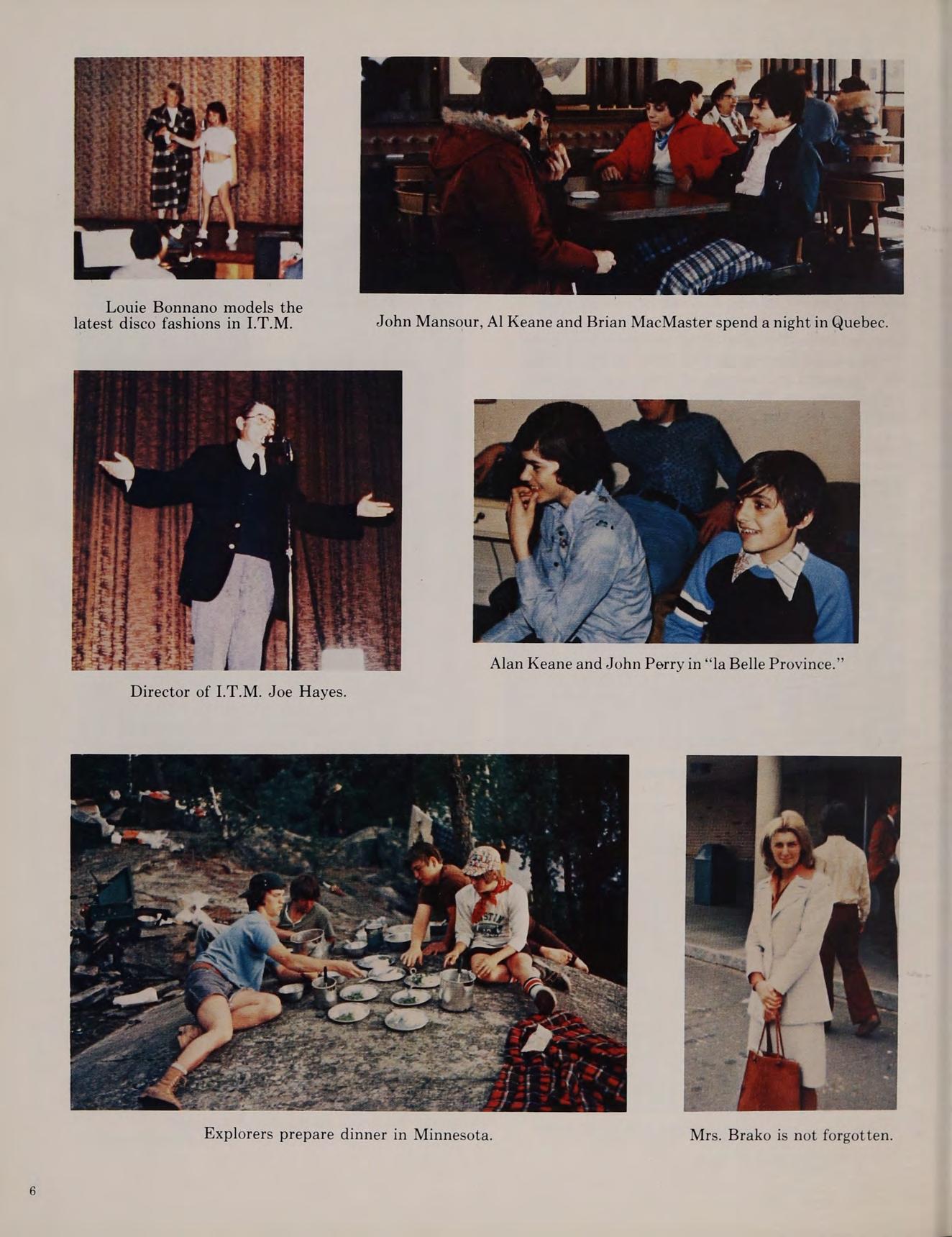 The spring of 1978 proved very successful for Austin sports. The varsity baseball team with a corps of juniors finished their season with a 5-15 record. The spring track team, led by co-captains Billy Welch and Barry Fitzgerald, had their best season ever, with the varsity team finishing with a 5-4 record. The golf team, led once again by Michael McAuliffe, became league Merrimack Valley and State Champions. The tennis team also became league champions and were not ousted until the semi-final round of the State Championship. Stars of the team included undefeated single player Steve Malanson and the undefeated doubles combination of Fred Poznick and Ray Keefe. The Explorers, during the summer went once again on a Super Activity, a two week excursion into Bob Wilson gives Mr. Stott the eye. upstate New York.