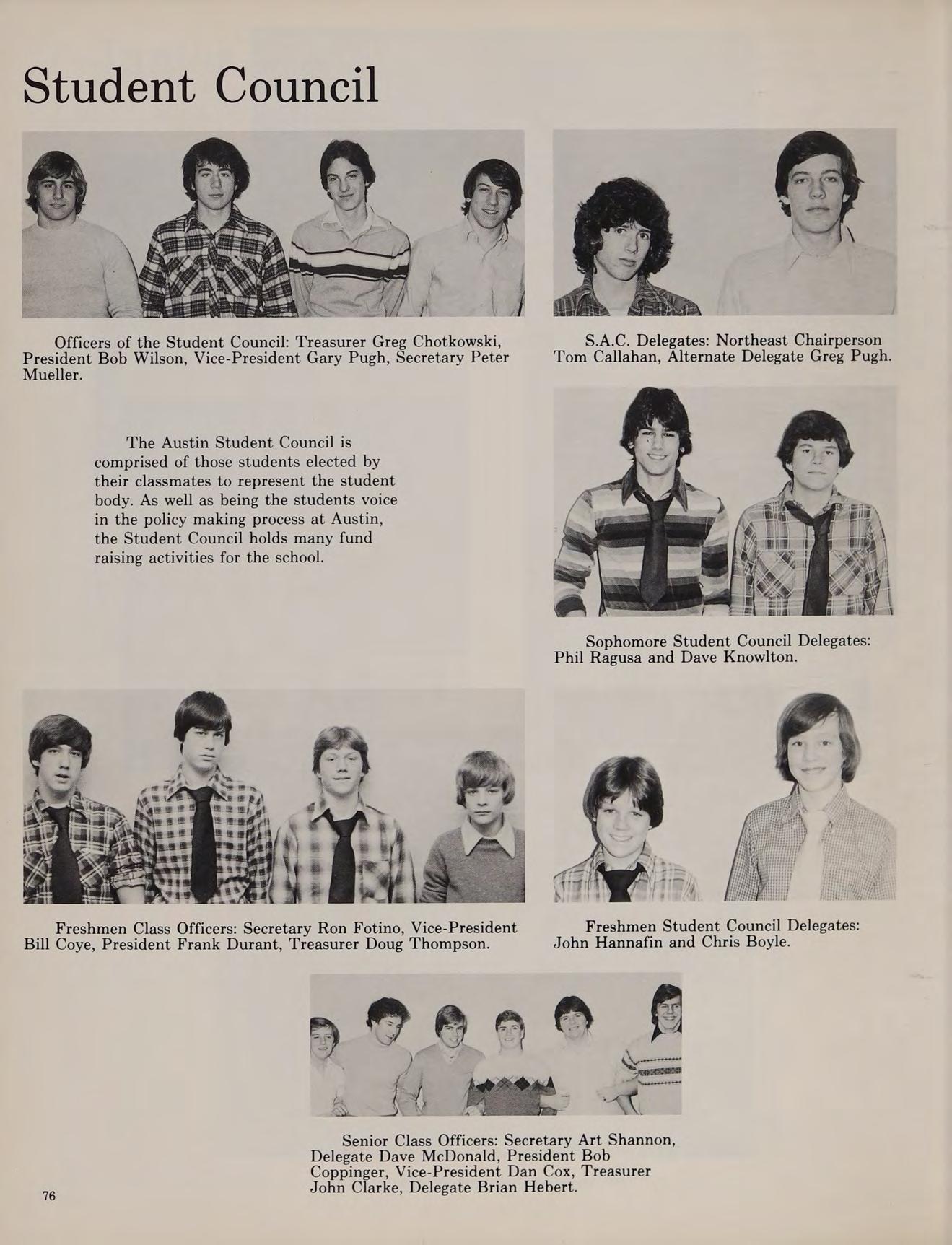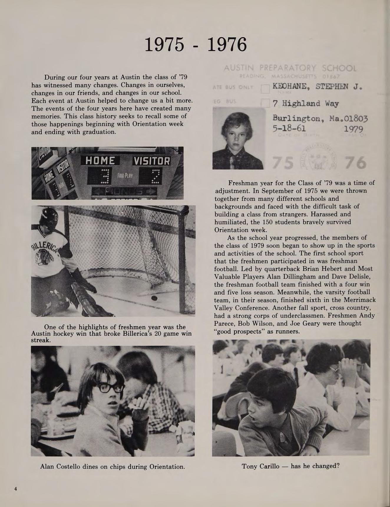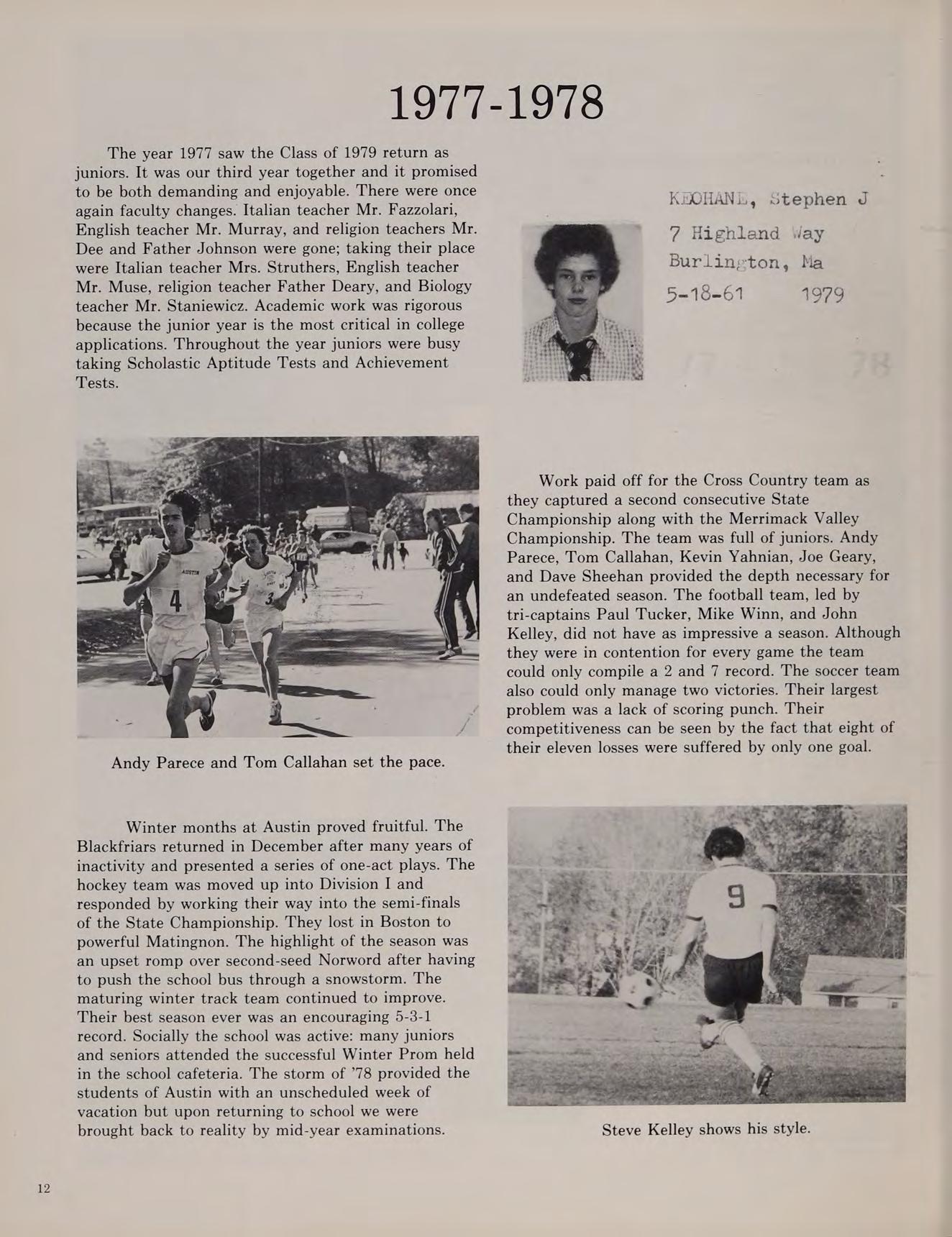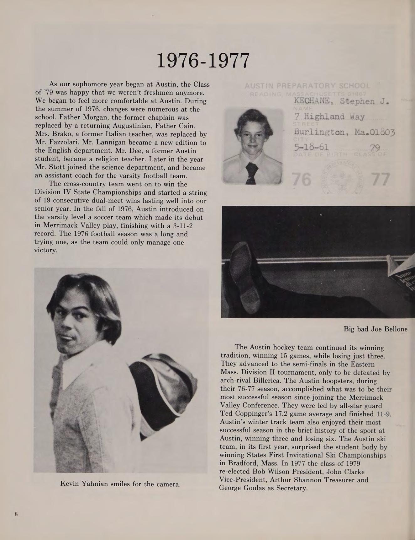 As our sophomore year began at Austin, the Class of ’79 was happy that we weren’t freshmen anymore. We began to feel more comfortable at Austin. During KBOHANE ephen J. the summer of 1976, changes were numerous at the school. Father Morgan, the former chaplain was replaced by a returning Augustinian, Father Cain. Mrs. Brako, a former Italian teacher, was replaced by Mr. Fazzolari. Mr. Lannigan became a new edition to the English department. Mr. Dee, a former Austin student, became a religion teacher. Later in the year Mr. Stott joined the science department, and became an assistant coach for the varsity football team.