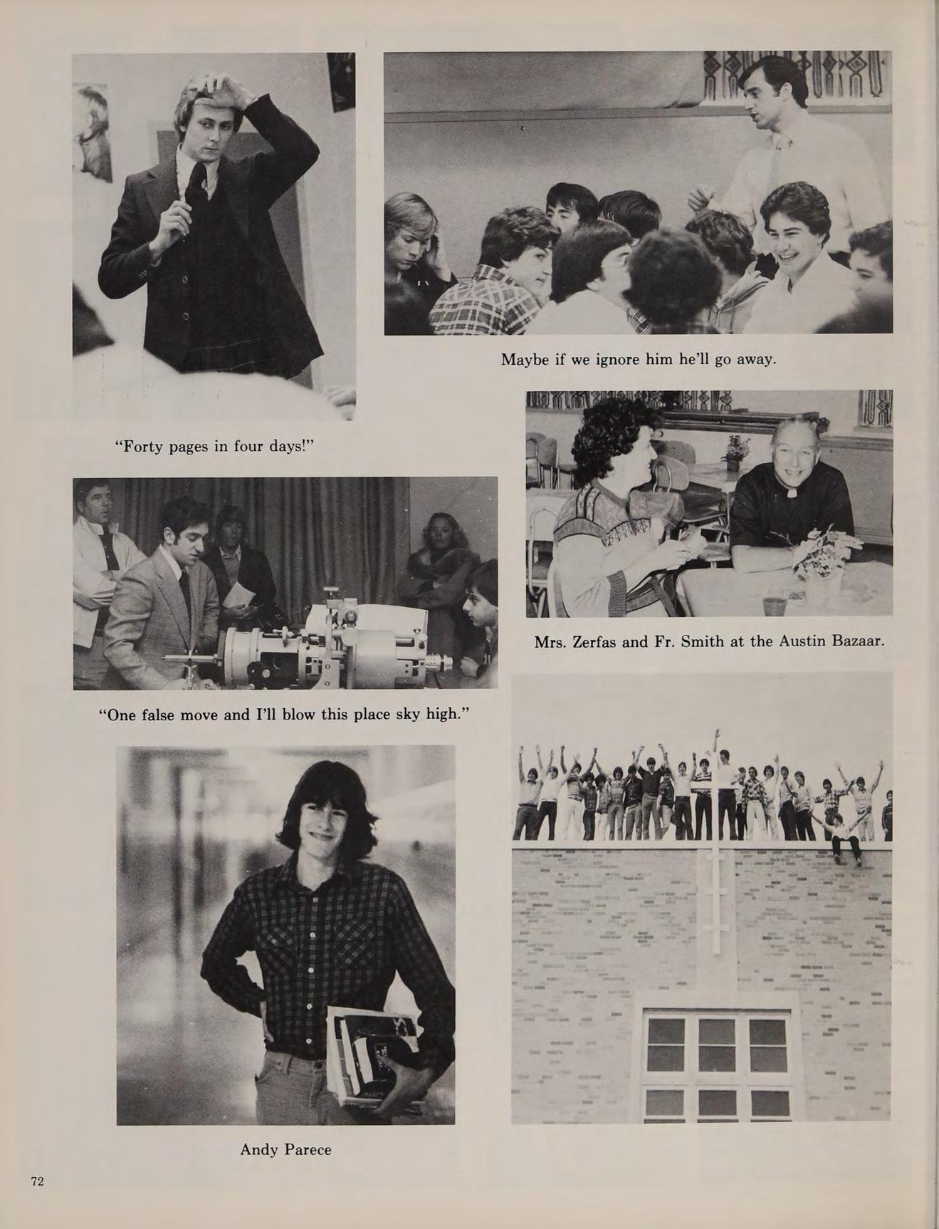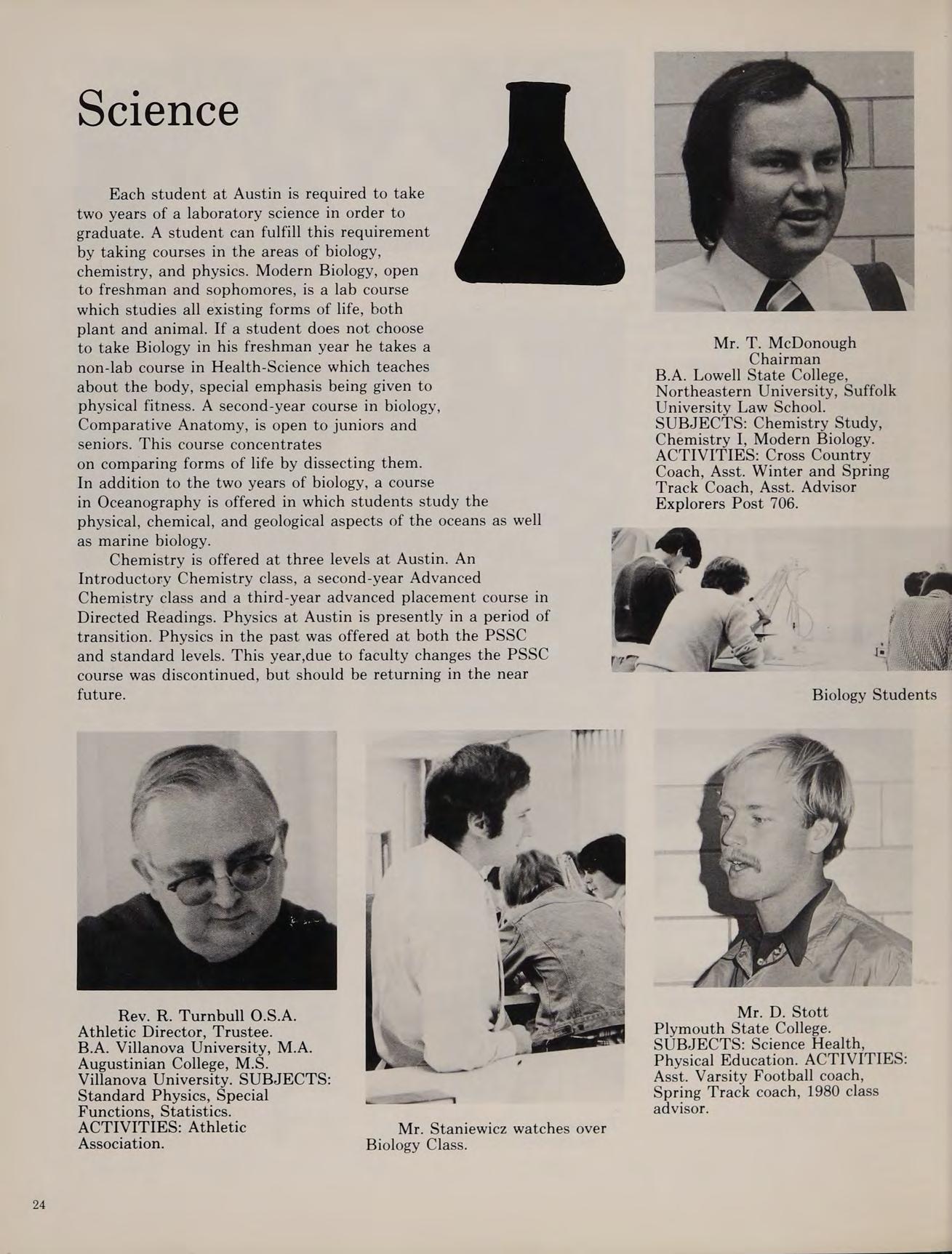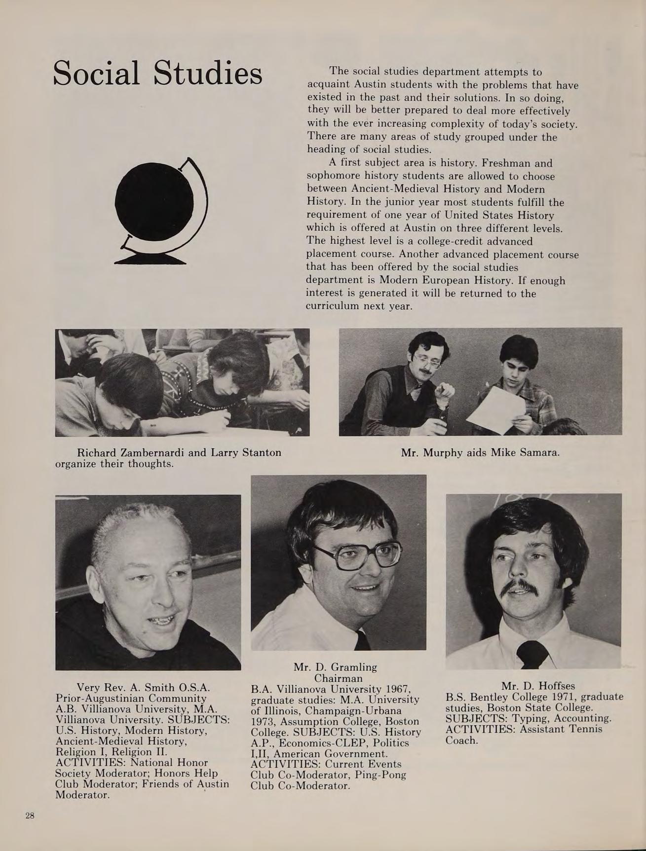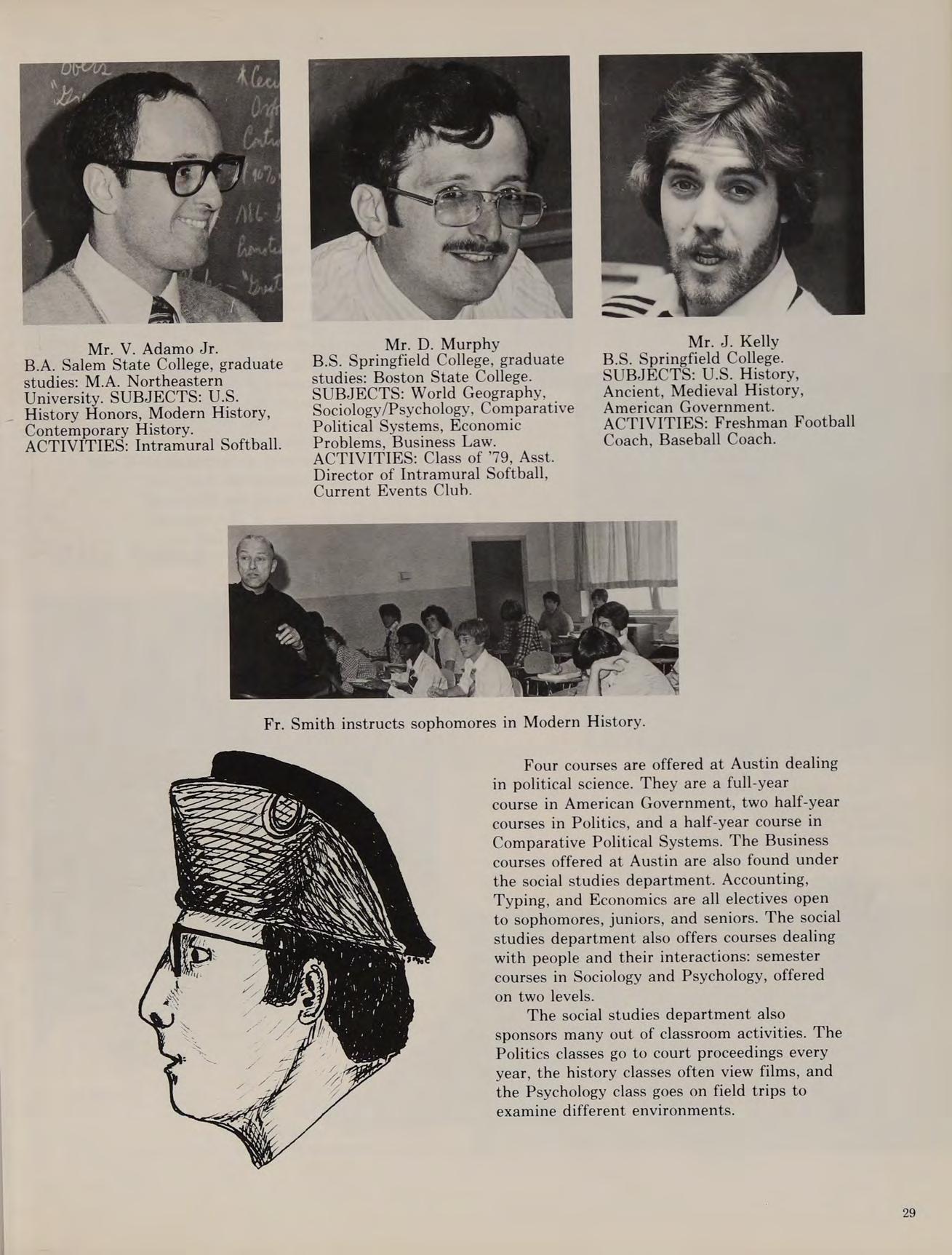 As our sophomore year began at Austin, the Class of ’79 was happy that we weren’t freshmen anymore. We began to feel more comfortable at Austin. During KBOHANE ephen J. the summer of 1976, changes were numerous at the school. Father Morgan, the former chaplain was replaced by a returning Augustinian, Father Cain. Mrs. Brako, a former Italian teacher, was replaced by Mr. Fazzolari. Mr. Lannigan became a new edition to the English department. Mr. Dee, a former Austin student, became a religion teacher. Later in the year Mr. Stott joined the science department, and became an assistant coach for the varsity football team.