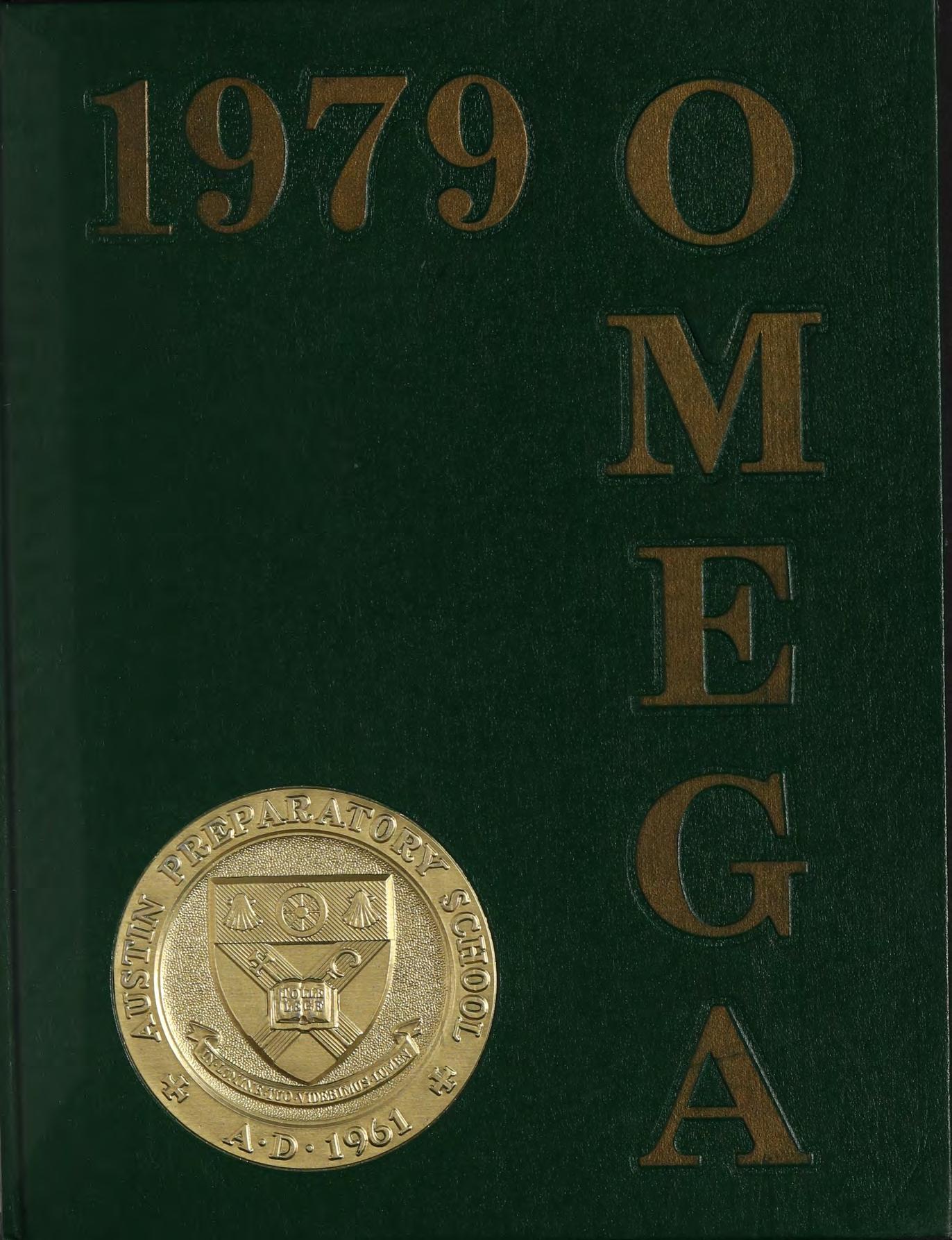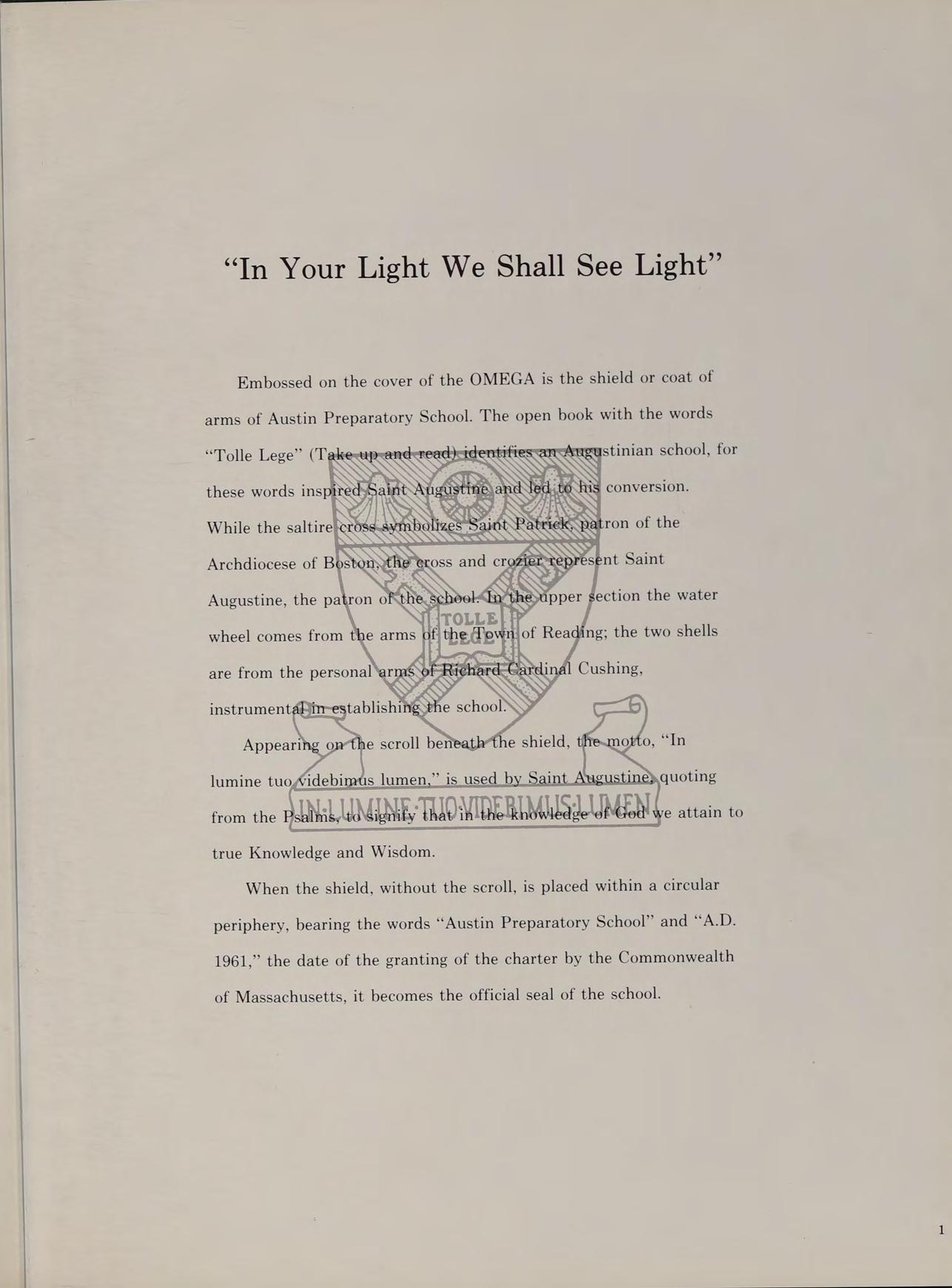 Embossed on the cover of the OMEGA is the shield or coat of arms of Austin Preparatory School. The open book with the words agustinian school, for SN as SS Augustine, the pat wheel comes from we attain to from the AIN:LUMINE- THO VIDERIMUSLUMEN true Knowledge and Wisdom.