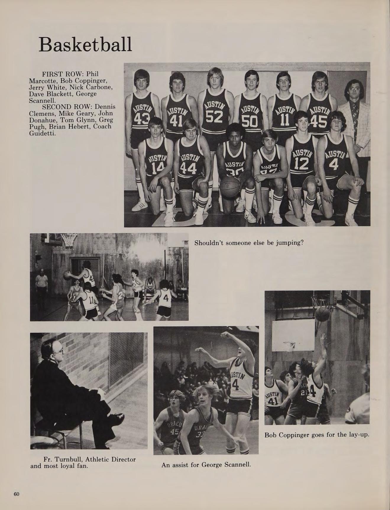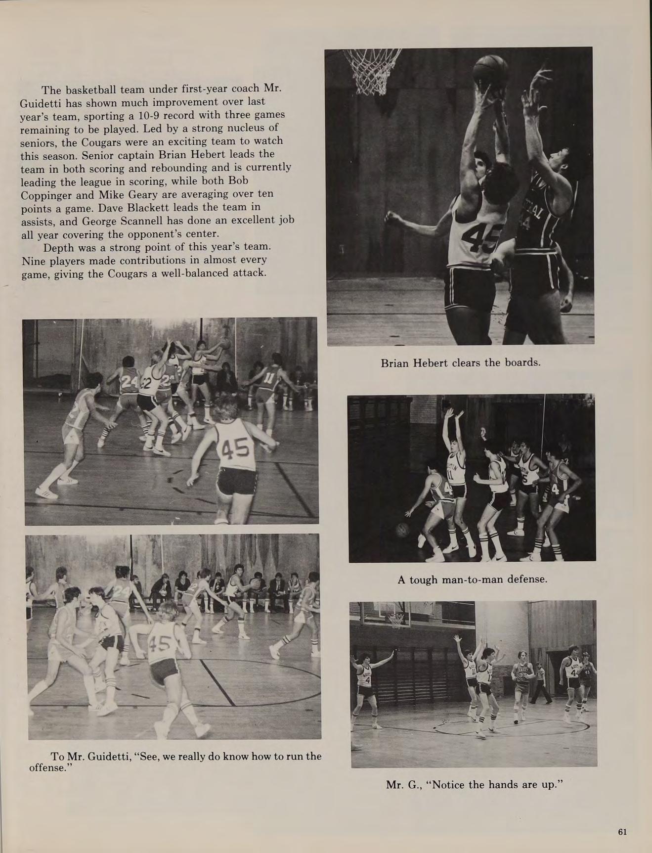 As the winter months approached, the season for three new sports began. The freshman basketball team, led by Brian Hebert, Joe Geary, and Phil Marcotte, finished up with a 6-15 season. The varsity basketball team, led by Ted Coppinger and Larry Comerford, finished their season with an 8-13 record.