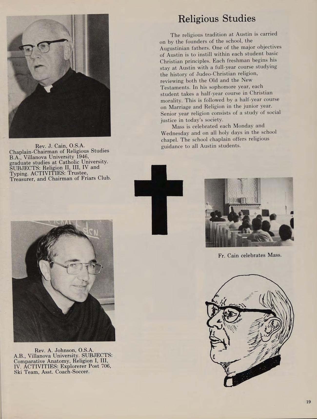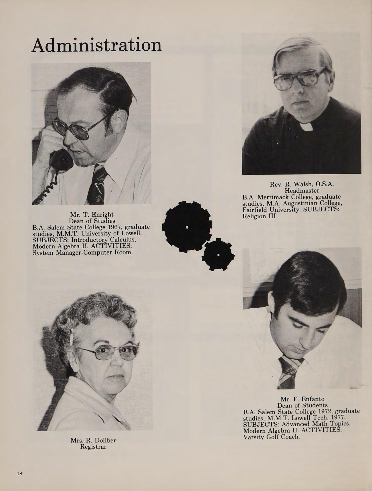 B.A., Villanova University 1946, graduate studies at Catholic University. SUBJECTS: Religion II, III, IV and Typing. ACTIVITIES: Trustee, Treasurer, and Chairman of Friars Club.