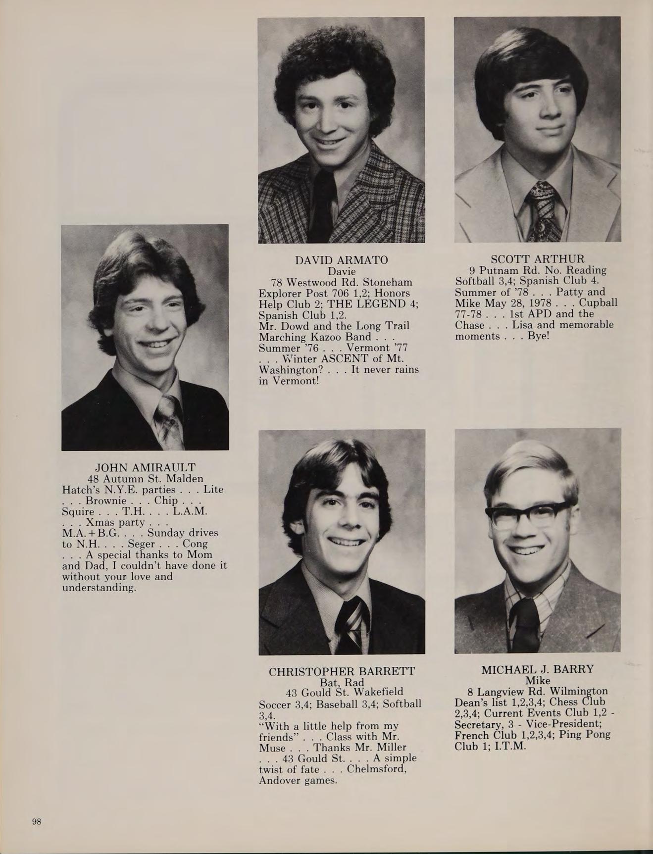61 John Carver Rd. Reading Post 706 1; Spanish Club 1,2; Soccer 2,3; Hockey 2,3,4; 1,T.M.; SOUTH PACIFIC; Baseball 2; Ping Pong Club 3; MUSIC AMERICAN STYLE. Softball 2,3,4.