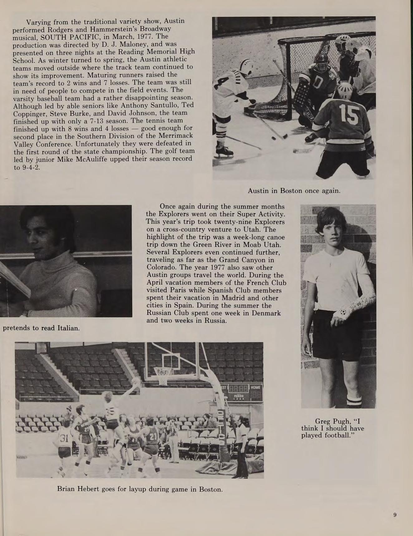 Varying from the traditional variety show, Austin performed Rodgers and Hammerstein’s Broadway musical, SOUTH PACIFIC, in March, 1977. The production was directed by D. J. Maloney, and was presented on three nights at the Reading Memorial High School. As winter turned to spring, the Austin athletic teams moved outside where the track team continued to show its improvement. Maturing runners raised the team’s record to 2 wins and 7 losses. The team was still in need of people to compete in the field events. The varsity baseball team had a rather disappointing season. Although led by able seniors like Anthony Santullo, Ted Coppinger, Steve Burke, and David Johnson, the team finished up with only a 7-13 season. The tennis team finished up with 8 wins and 4 losses — good enough for second place in the Southern Division of the Merrimack Valley Conference. Unfortunately they were defeated in the first round of the state championship. The golf team led by junior Mike McAuliffe upped their season record to 9-4-2.