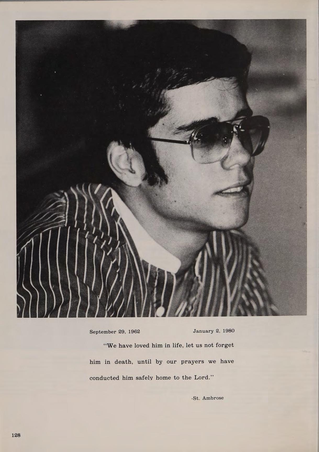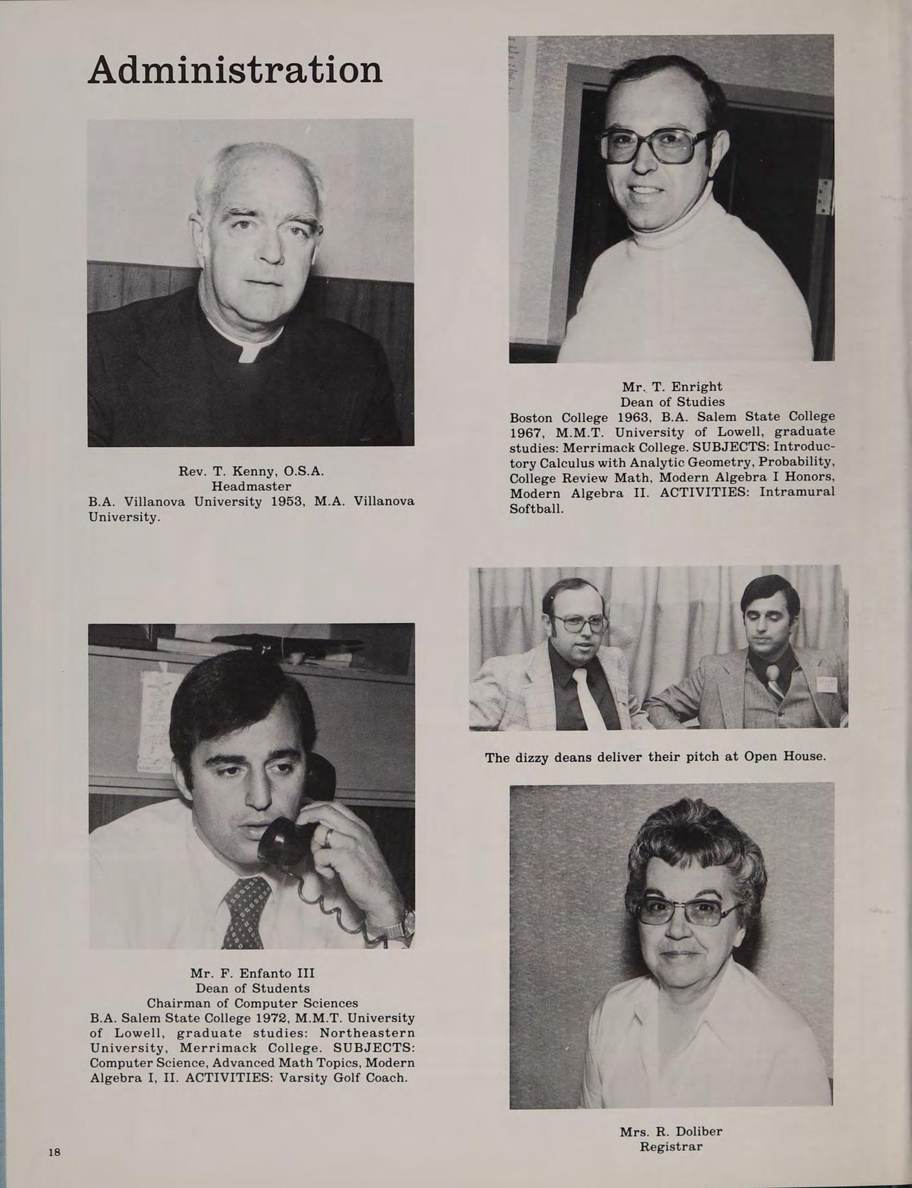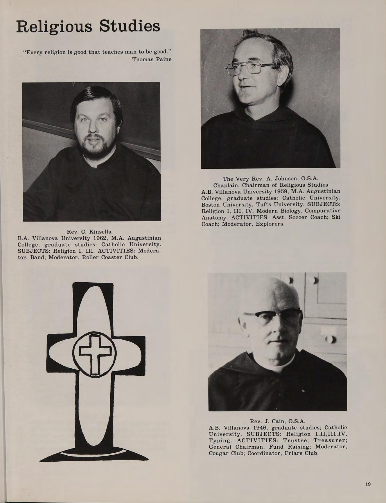 B.A. Villanova University 1962, M.A. Augustinian College, graduate studies: Catholic University. SUBJECTS: Religion I, III. ACTIVITIES: Moderator, Band; Moderator, Roller Coaster Club.