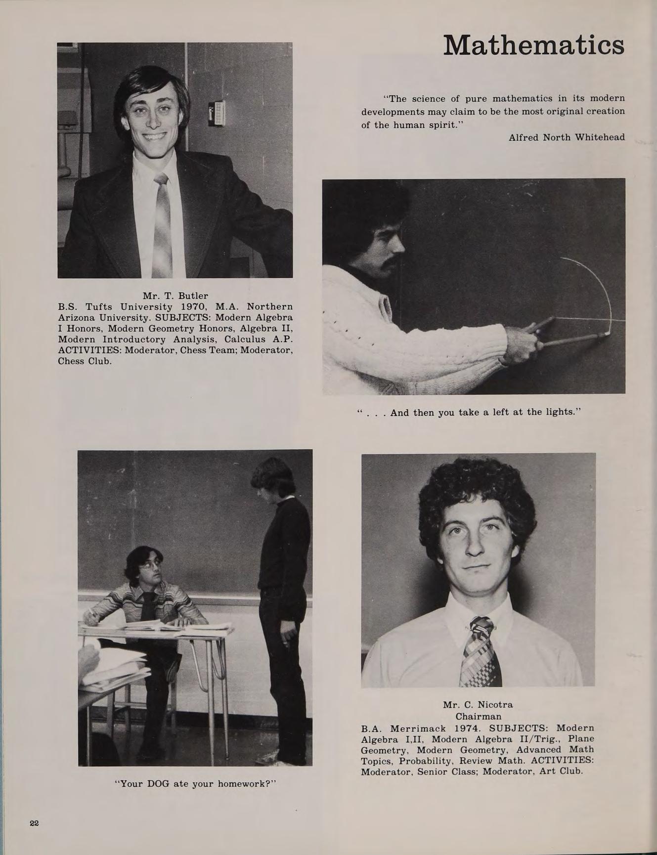 B.S. Tufts University 1970, M.A. Northern Arizona University. SUBJECTS: Modern Algebra I Honors, Modern Geometry Honors, Algebra II, Modern Introductory Analysis, Calculus A.P. ACTIVITIES: Moderator, Chess Team; Moderator, Chess Club.
