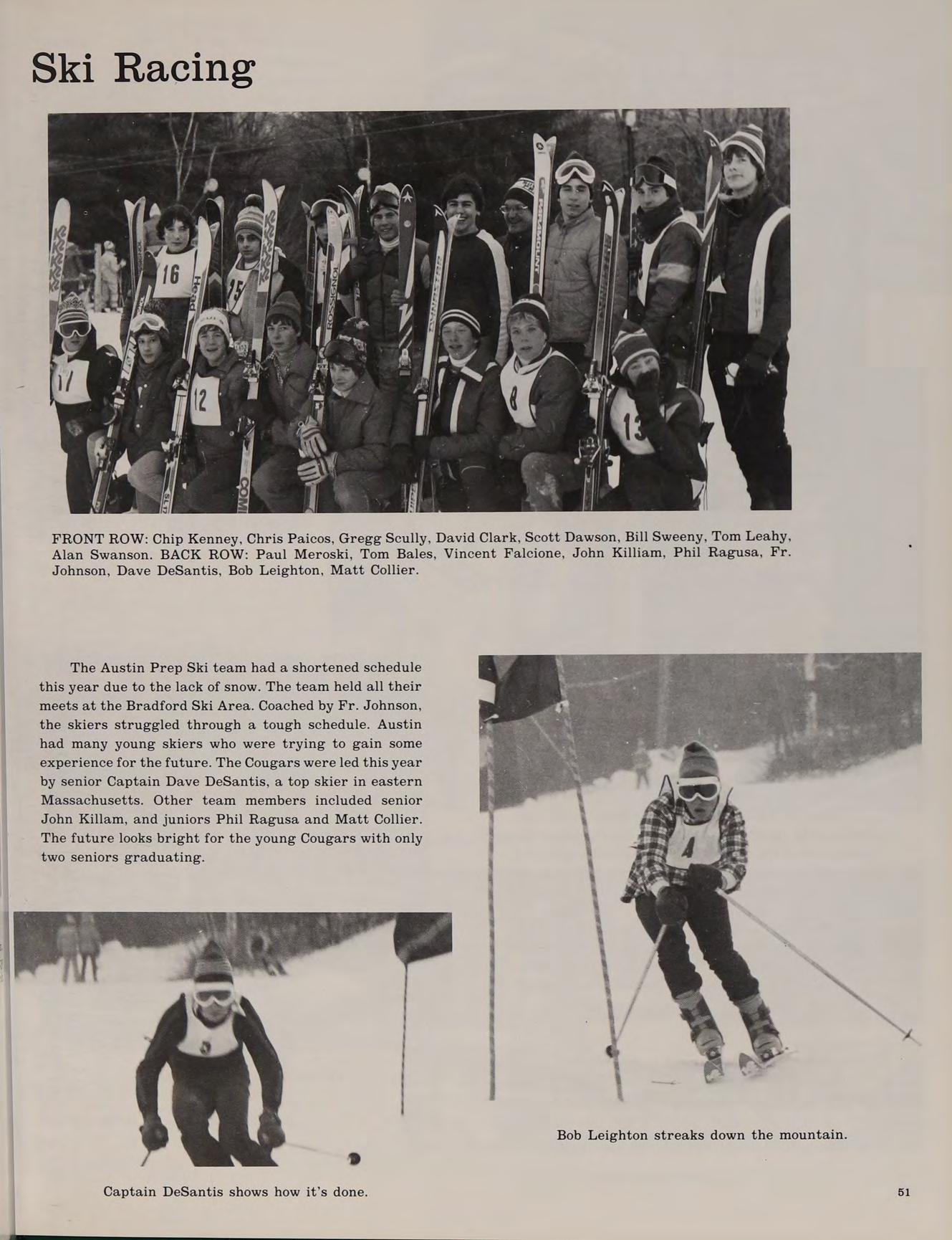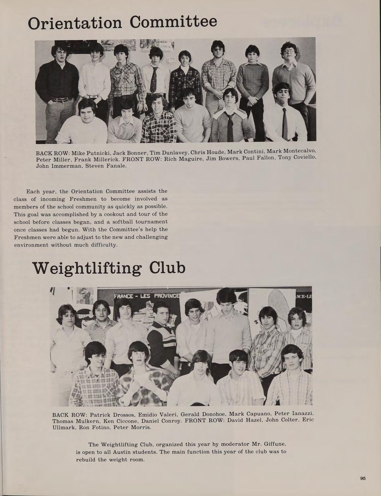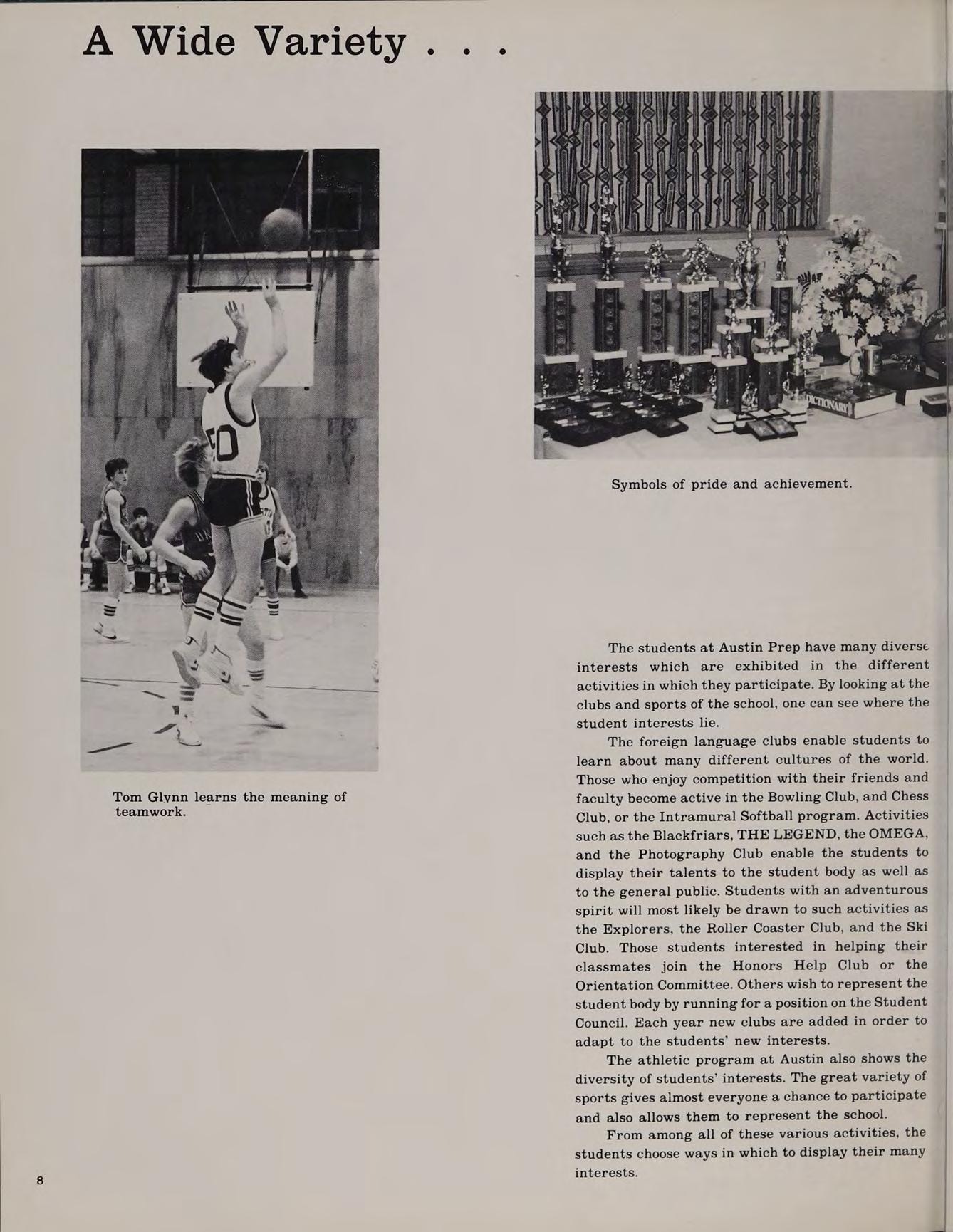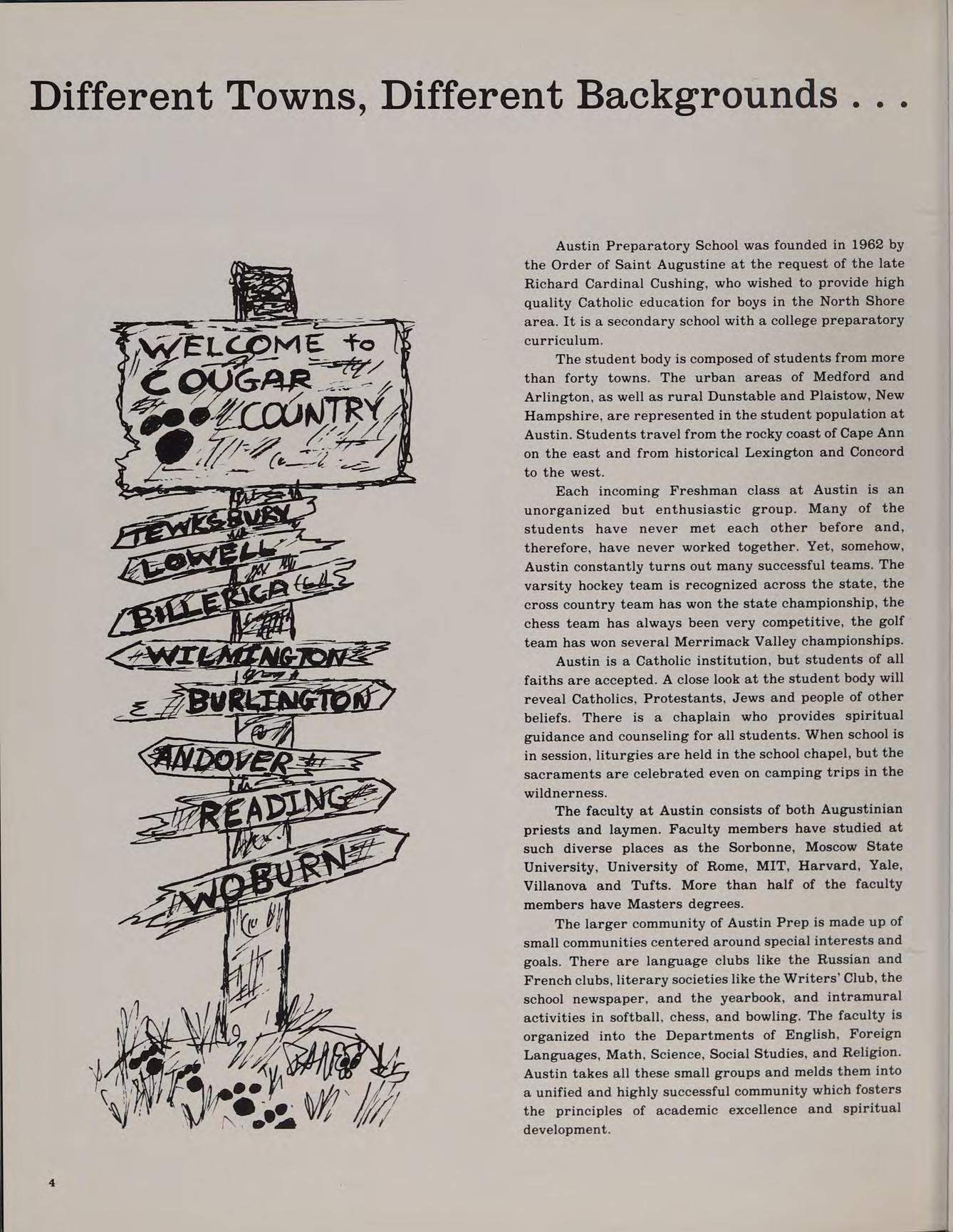 Each incoming Freshman class at Austin is an unorganized but enthusiastic group. Many of the students have never met each other before and, therefore, have never worked together. Yet, somehow, Austin constantly turns out many successful teams. The varsity hockey team is recognized across the state, the cross country team has won the state championship, the chess team has always been very competitive, the golf team has won several Merrimack Valley championships. Austin is a Catholic institution, but students of all faiths are accepted. A close look at the student body will reveal Catholics, Protestants, Jews and people of other beliefs. There is a chaplain who provides spiritual guidance and counseling for all students. When school is in session, liturgies are held in the school chapel, but the sacraments are celebrated even on camping trips in the wildnerness.