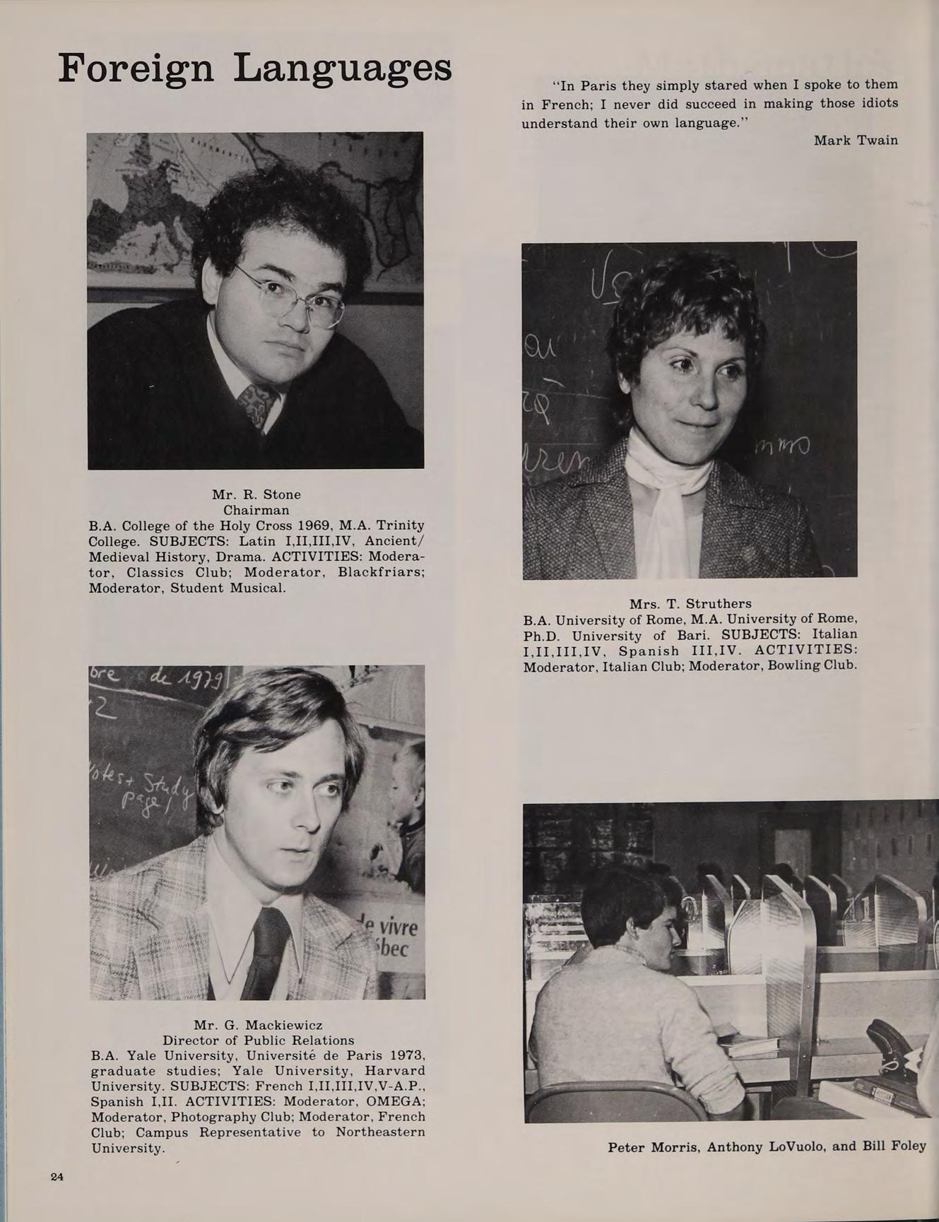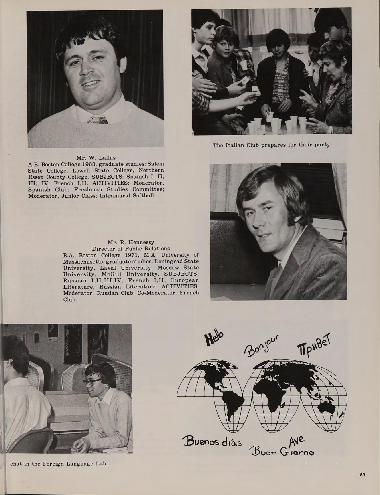 B.A. Boston College 1971, M.A. University of Massachusetts, graduate studies: Leningrad State University, Laval University, Moscow State University, McGill University. SUBJECTS: Russian I,II,III,IV, French I,II, Literature, Russian Literature. ACTIVITIES: Moderator, Russian Club; Co-Moderator, French Club.