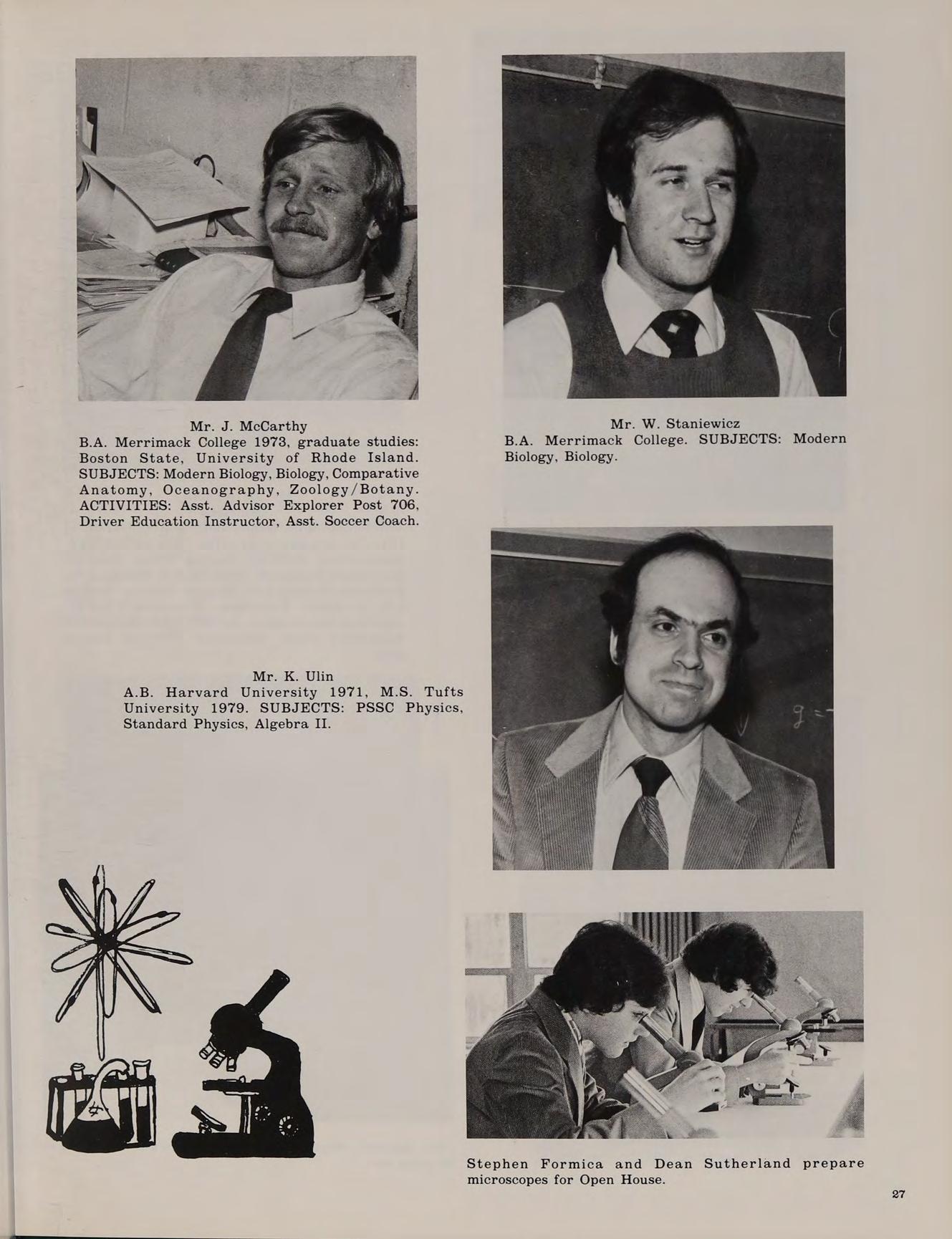Boston College 1968, B.A. Salem State College 1967, M.M.T. University of Lowell, graduate studies: Merrimack College. SUBJECTS: Introductory Calculus with Analytic Geometry, Probability, College Review Math, Modern Algebra I Honors, Modern Algebra II. ACTIVITIES: Intramural Softball.