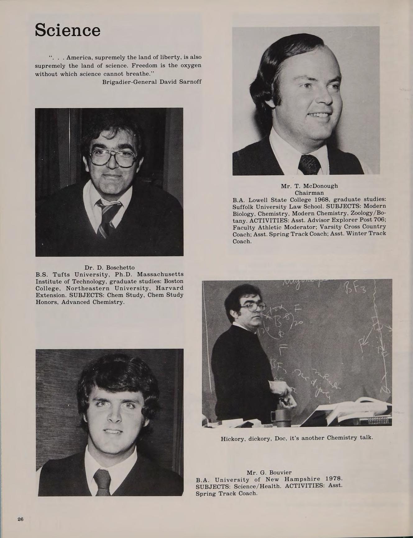 B.A. Lowell State College 1968, graduate studies: Suffolk University Law School. SUBJECTS: Modern Biology, Chemistry, Modern Chemistry, Zoology /Botany. ACTIVITIES: Asst. Advisor Explorer Post 706; Faculty Athletic Moderator; Varsity Cross Country Coach; Asst. Spring Track Coach; Asst. Winter Track Coach.