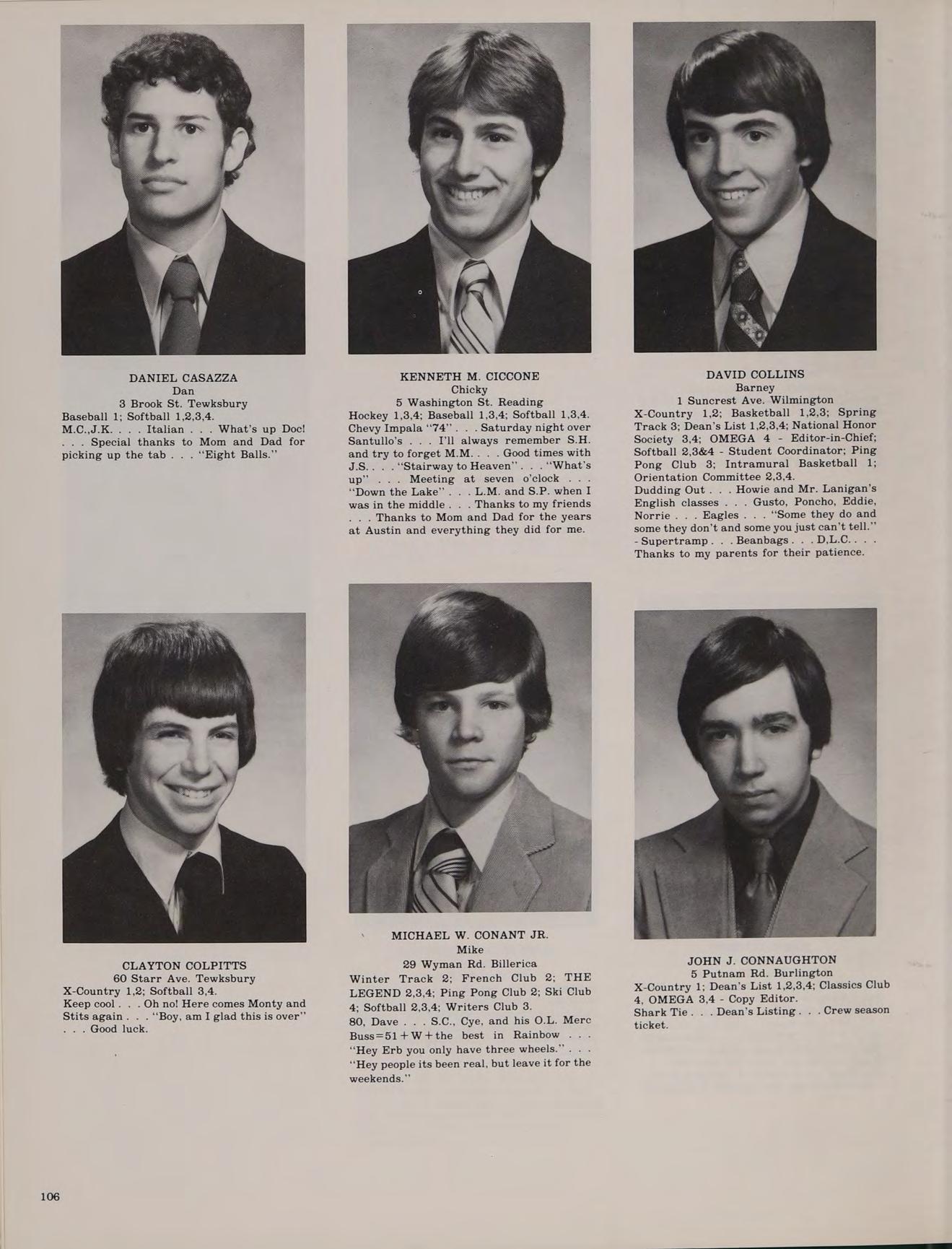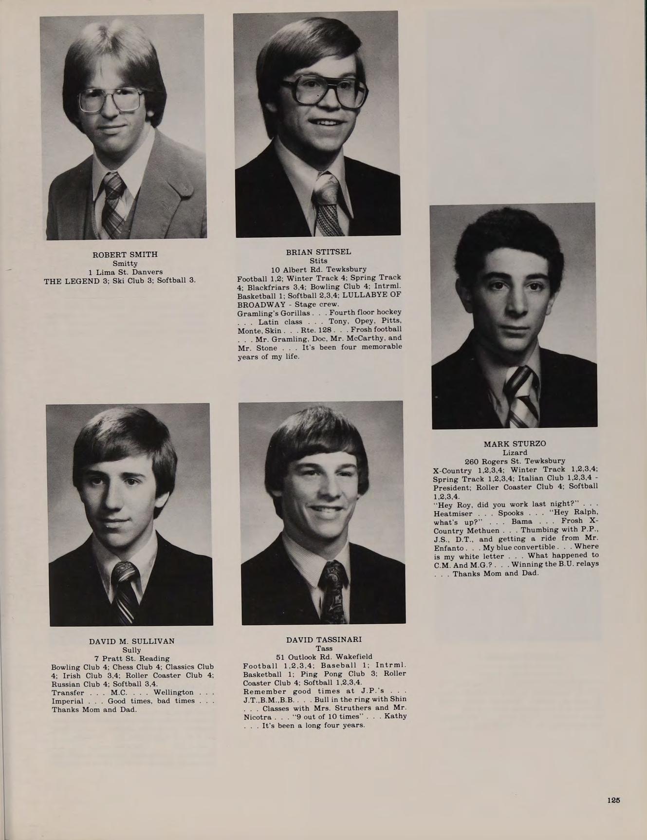 260 Rogers St. Tewksbury X-Country 1,2,3,4; Winter Track 1,2,3,4; Spring Track 1,2,3,4; Italian Club 1,2,3,4President; Roller Coaster Club 4; Softball 1,2,3,4.