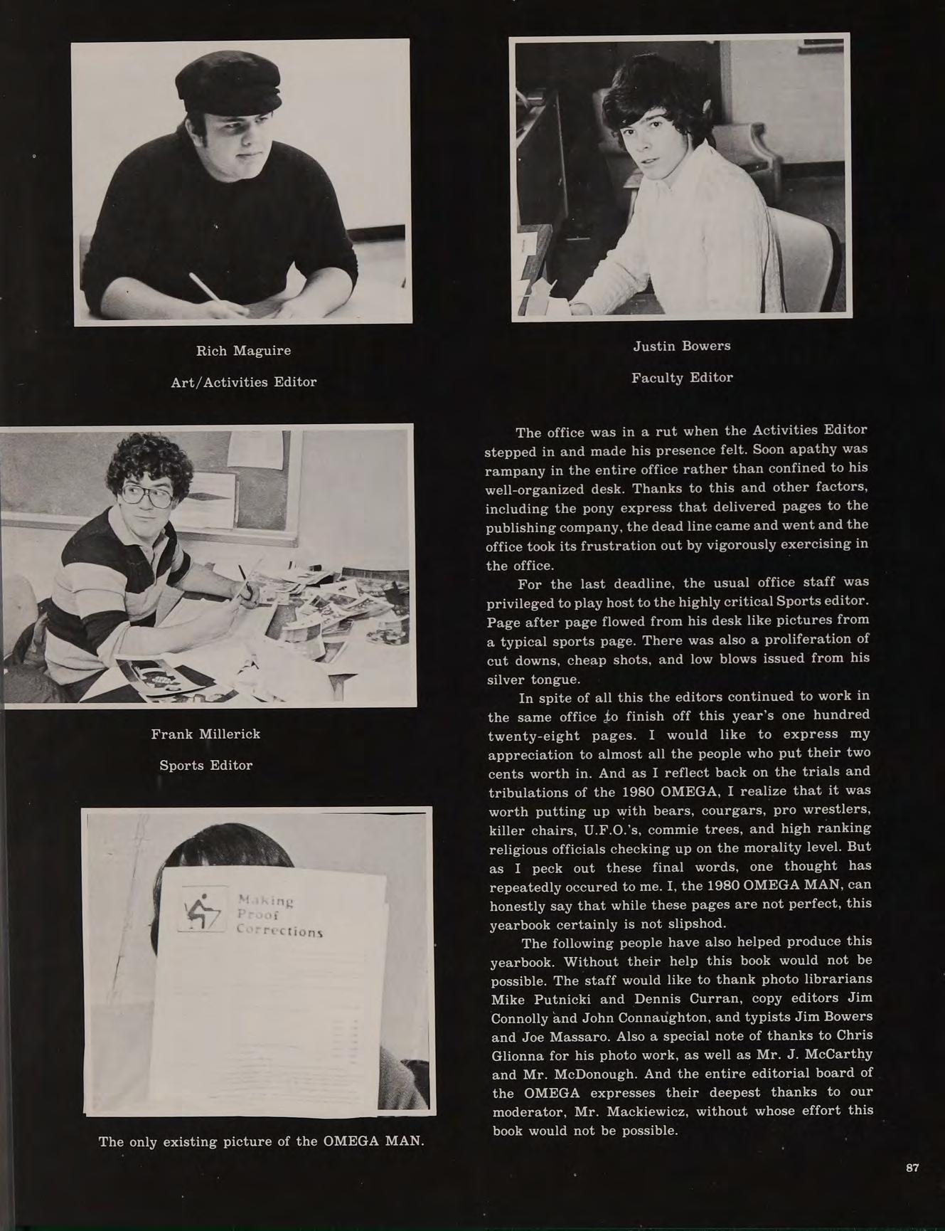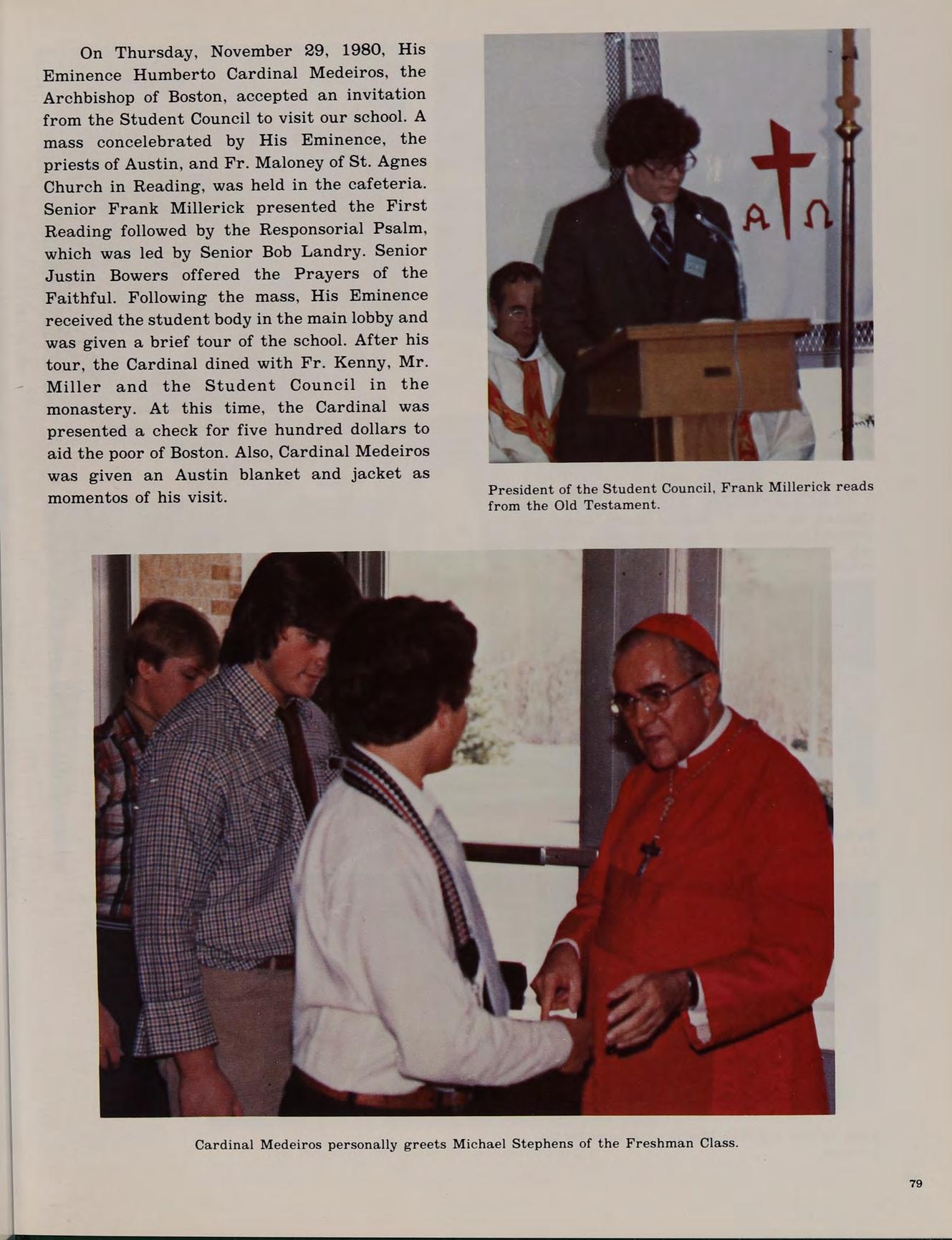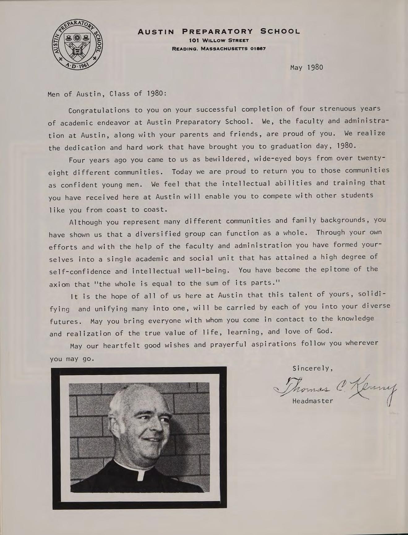 Rev. Robert A. Walsh, a man truly dedicated to the advancement of youth, leaves Austin Preparatory School after eight years of loyal service. The Class of 1980 would like to express its most sincere appreciation for his outstanding leadership, wisdom and guidance during our first three years at Austin; in gratitude, we warmly dedicate the 1980 OMEGA to Father Walsh.