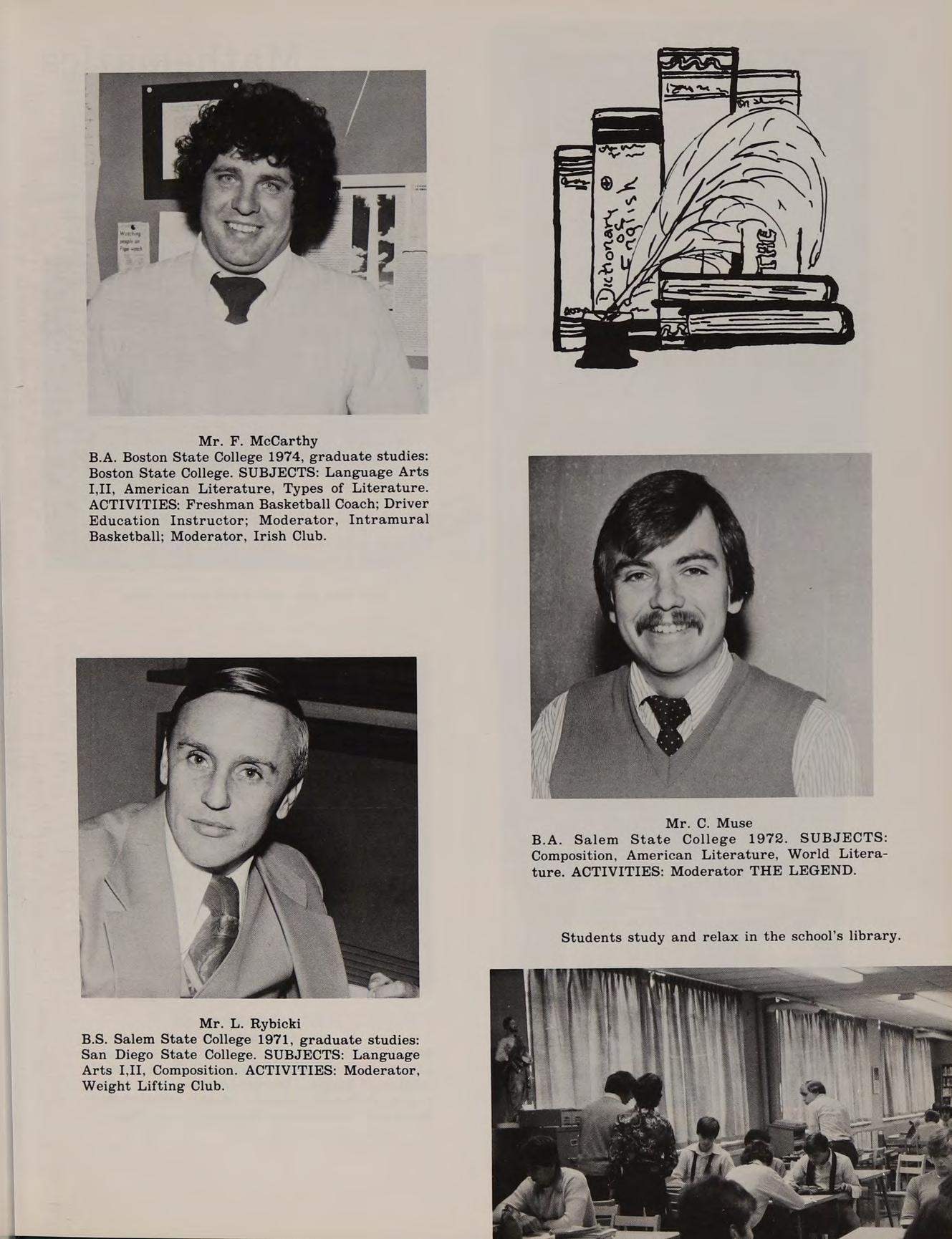 B.A. Salem State College 1972. SUBJECTS: Composition, American Literature, World Literature. ACTIVITIES: Moderator THE LEGEND.
