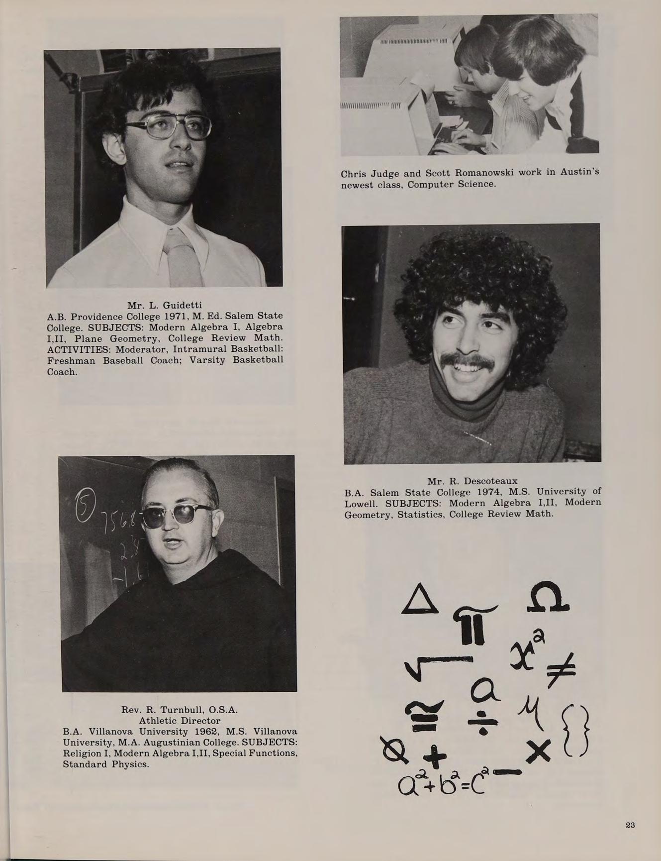A.B. Providence College 1971, M. Ed. Salem State College. SUBJECTS: Modern Algebra I, Algebra I,II, Plane Geometry, College Review Math. ACTIVITIES: Moderator, Intramural Basketball: Freshman Baseball Coach; Varsity Basketball Coach.