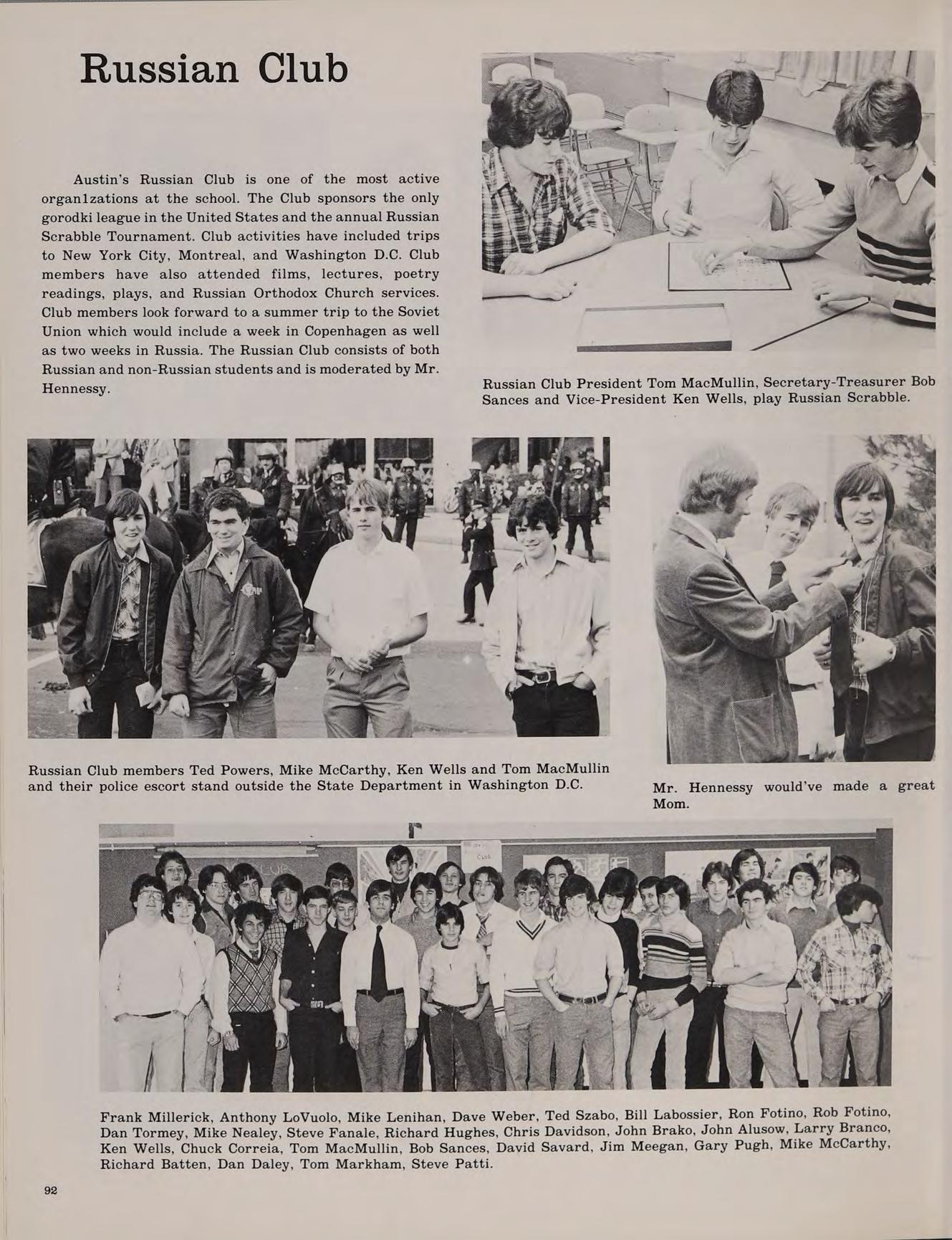 The larger community of Austin Prep is made up of small communities centered around special interests and goals. There are language clubs like the Russian and French clubs, literary societies like the Writers’ Club, the school newspaper, and the yearbook, and intramural activities in softball, chess, and bowling. The faculty is organized into the Departments of English, Foreign Languages, Math, Science, Social Studies, and Religion. Austin takes all these small groups and melds them into a unified and highly successful community which fosters the principles of academic excellence and spiritual development.