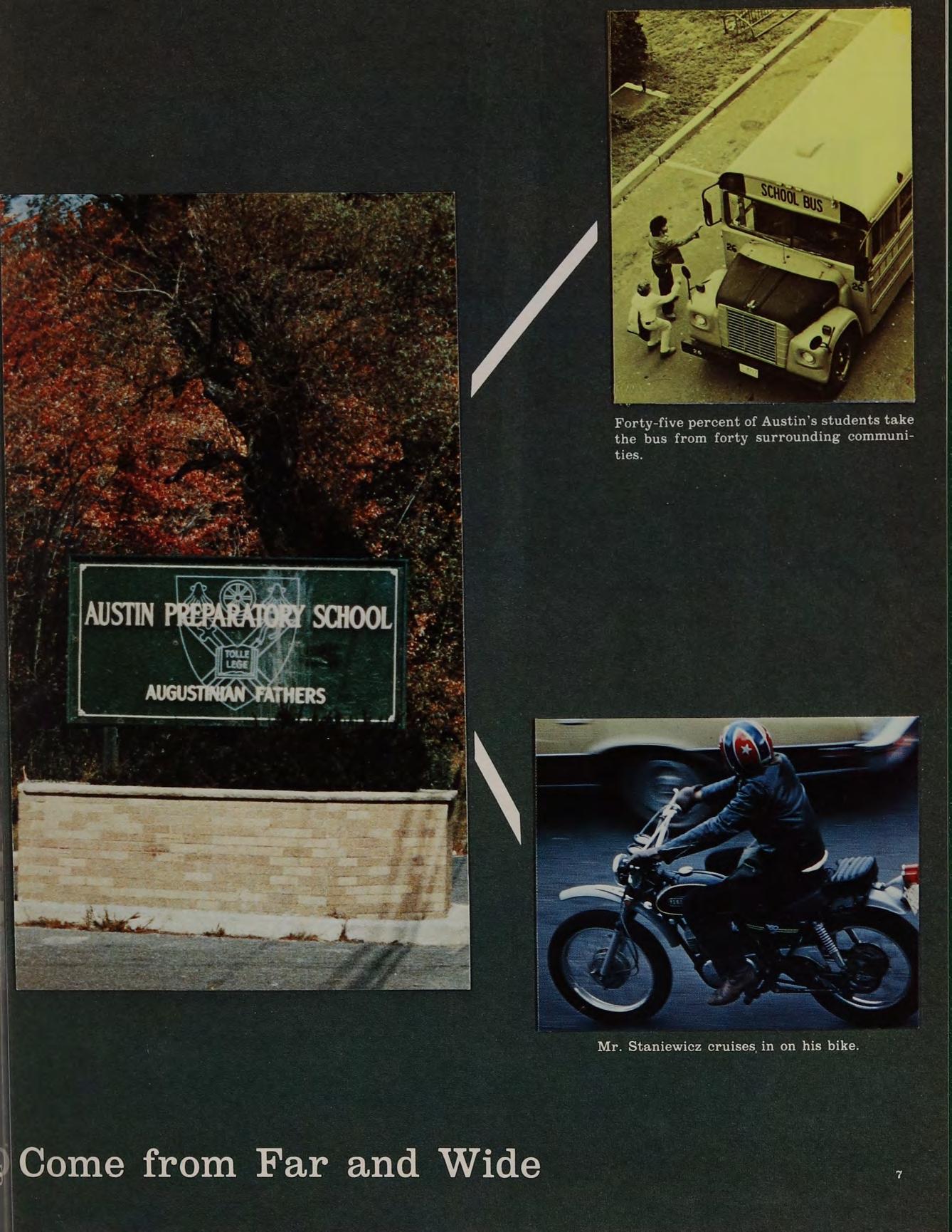 Forty-five percent of Austin’s students take the bus from forty surrounding communities. See Mr. Staniewicz cruises in on his bike. -