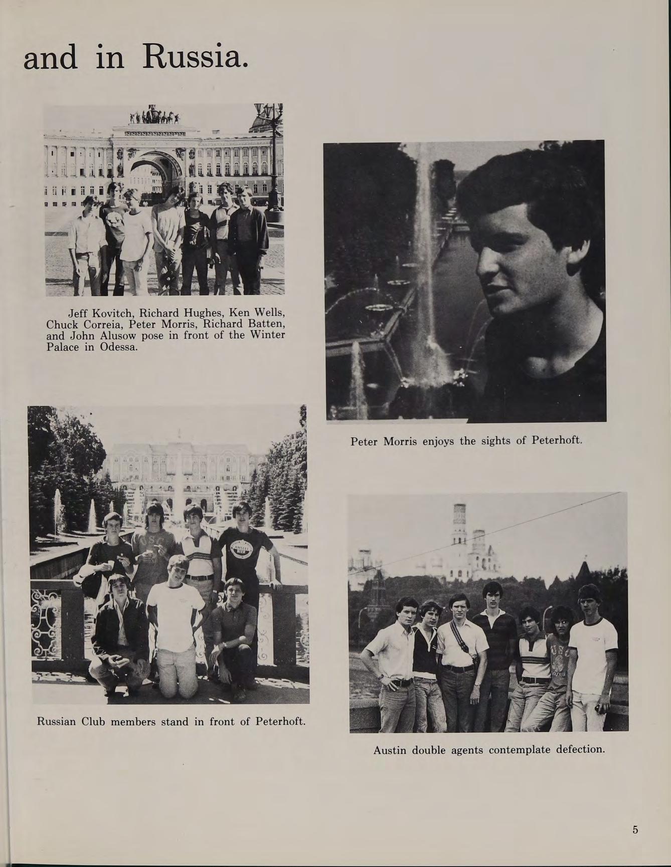 Russian Club members stand in front of Peterhoft. Austin double agents contemplate defection.