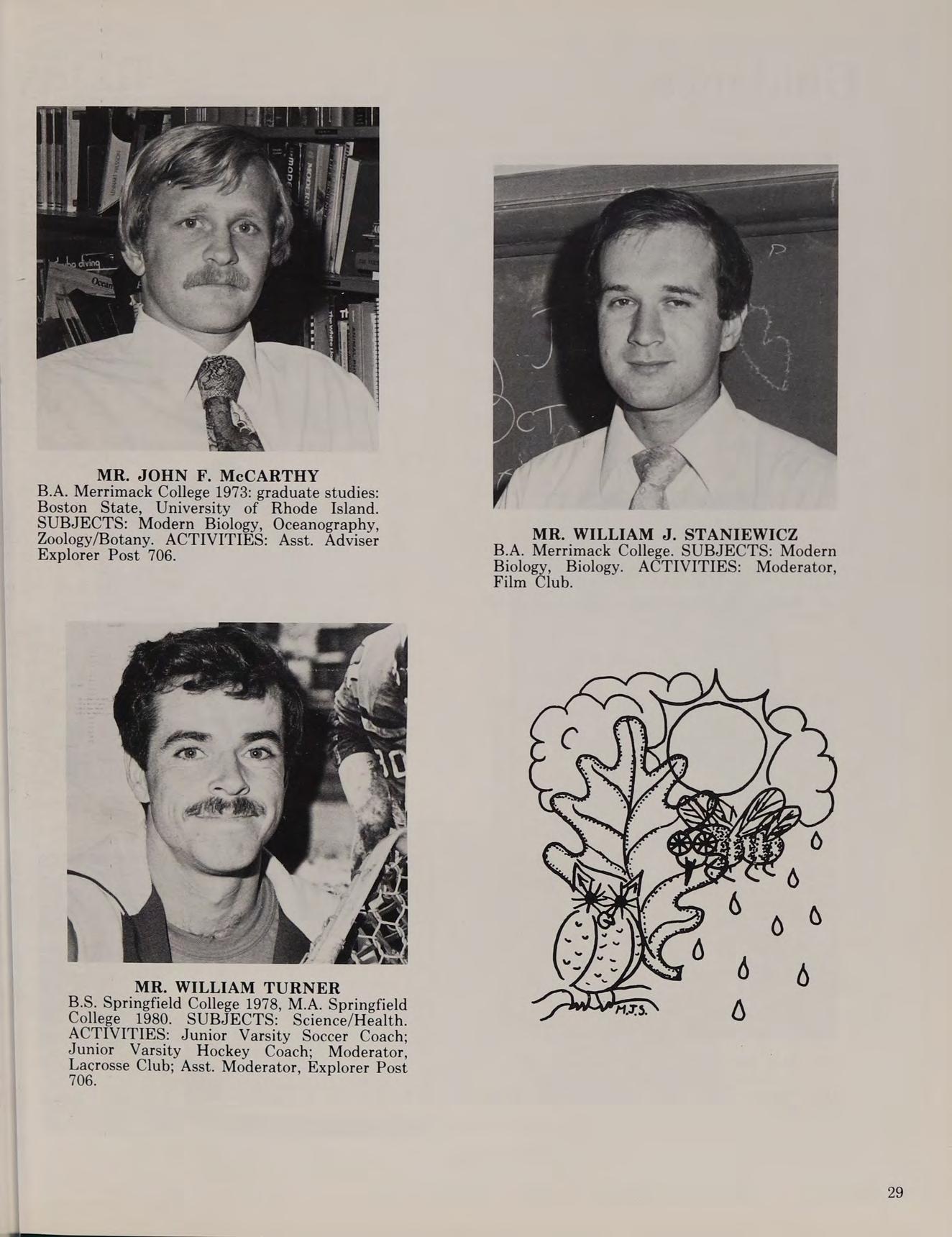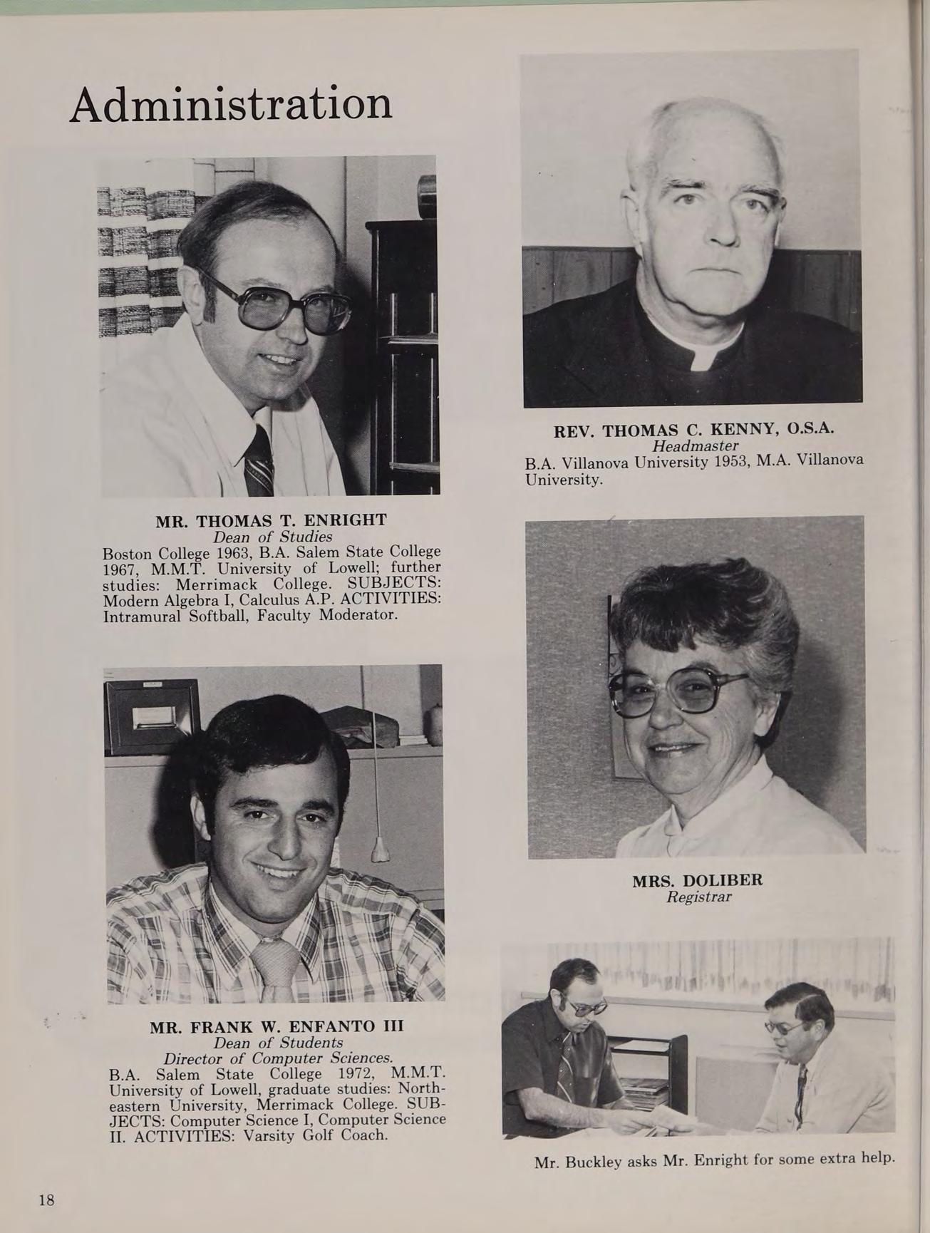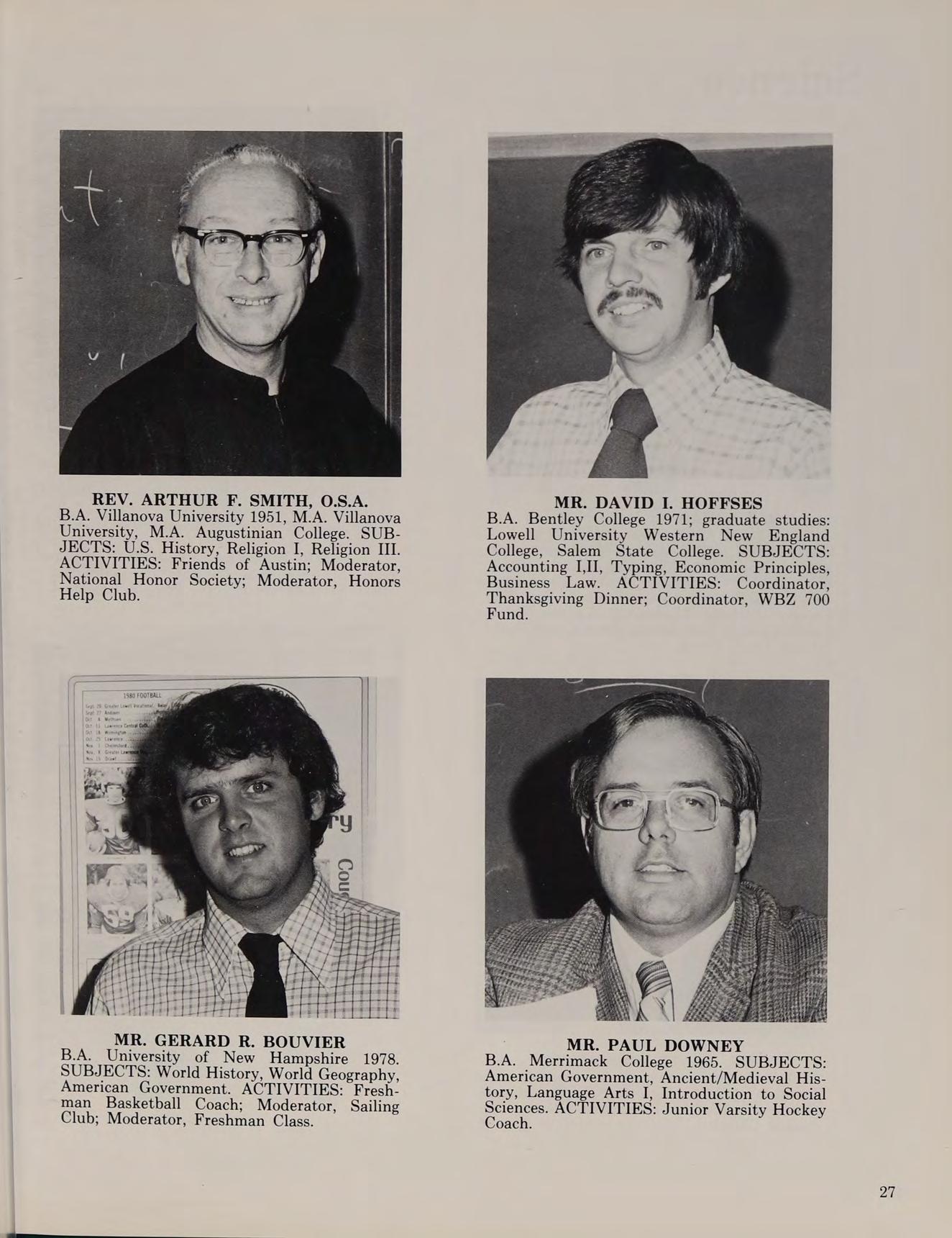 A.B. Villanova University 1959, M.A. Augustinian College; graduate studies: Catholic University, Boston University, Tufts University. SUBJECTS: Religion IV, Modern Biology, Comparative Anatomy. ACTIVITIES: Asst. Soccer Coach; Ski Coach; Moderator, Explorers.