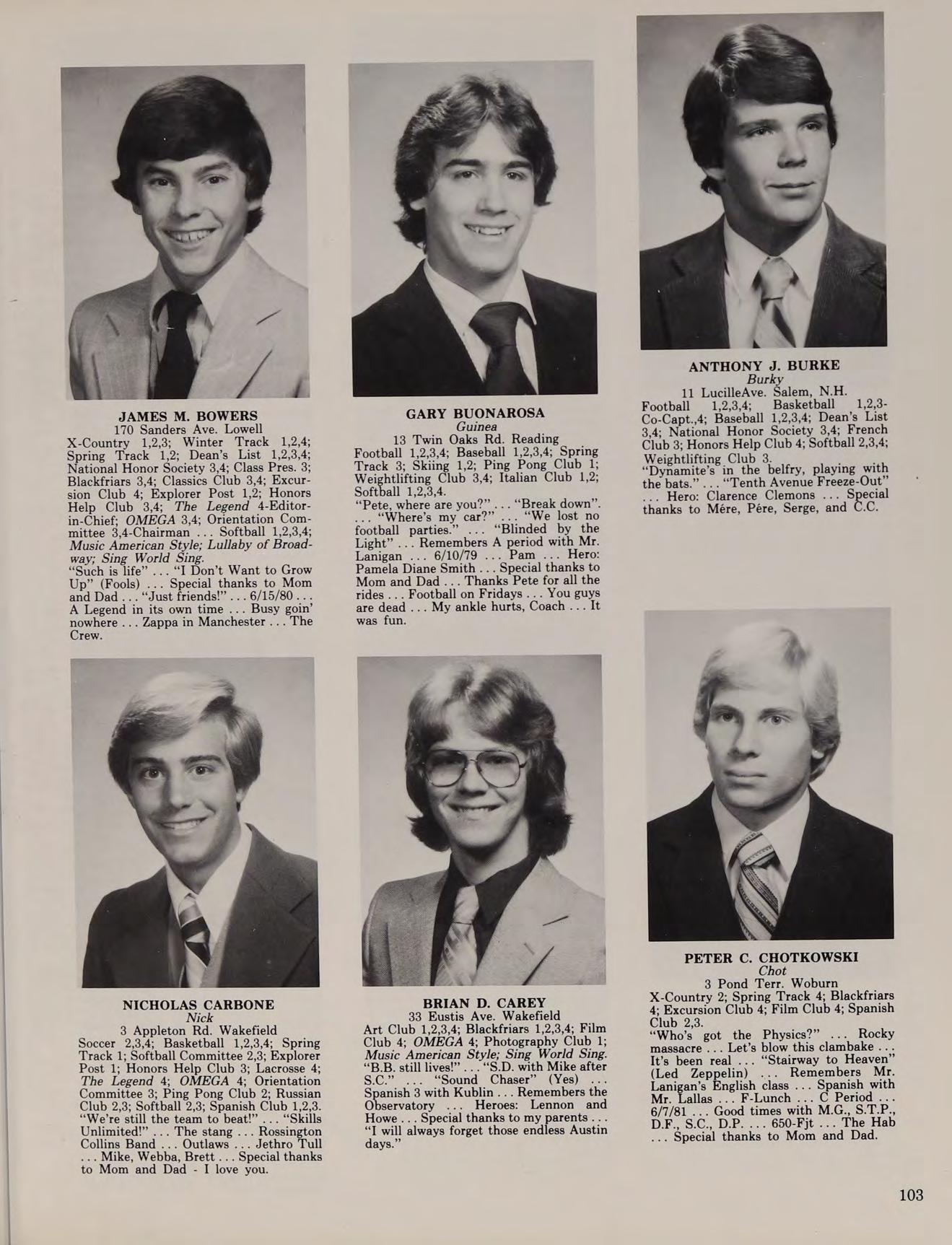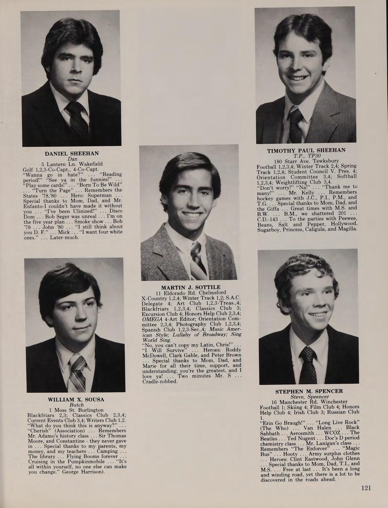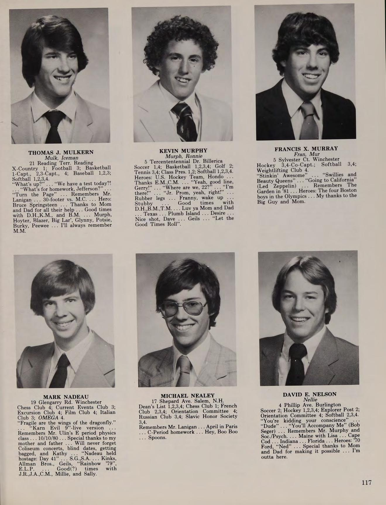 5 Lantern Ln. Wakefield Golf 1,2,3-Co-Capt., 4-Co-Capt. “Wanna go in_ hate?” “Reading period!” “See ya in the funnies!” ... “Play some cards!” “Born To Be Wild” ... “Turn the Page” ... Remembers the States ’78,80 ... Hero: Superman ... Special thanks to Mom, Dad, and Mr. Enfanto-I couldn’t have made it without you ... “I’ve been Ulinized!” ... Disco Dom ... Bob Seger was unreal ... I’m on the five year plan ... Smoke show .. Bob 79... John ’80 ... “I still think about you D. F.”... Mick .,. “I want four white ones.” ... Later-much.