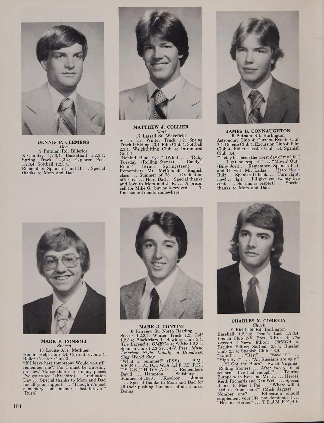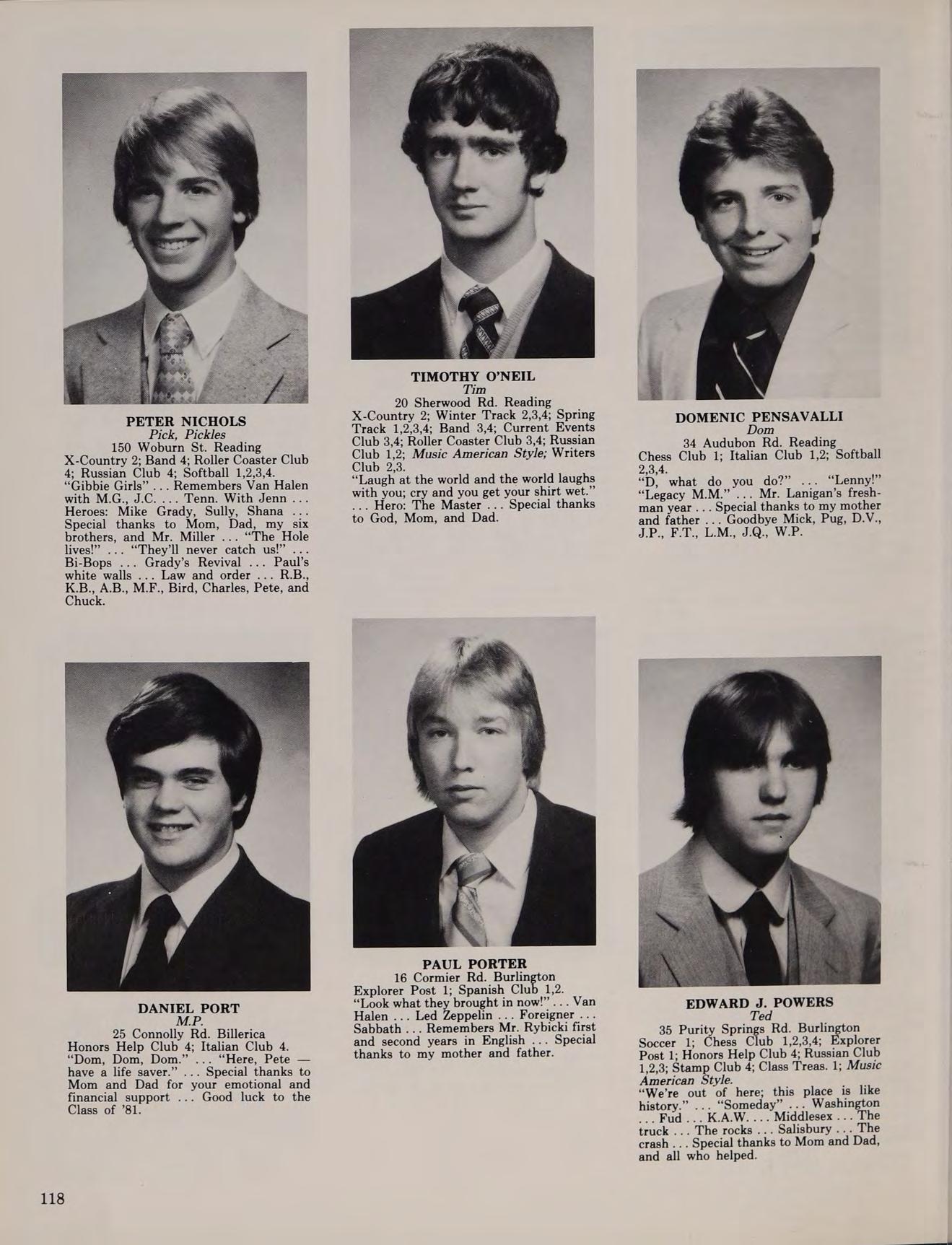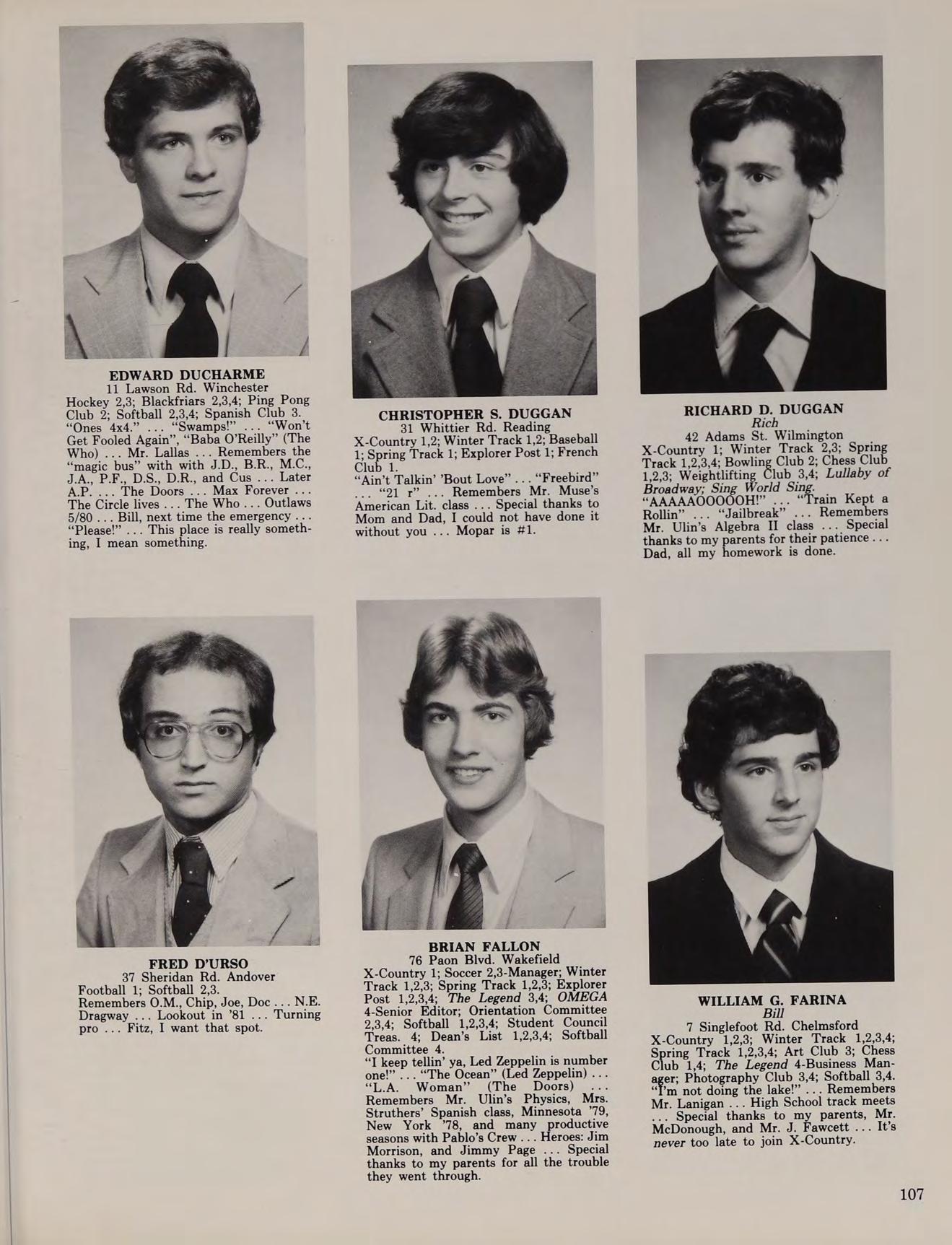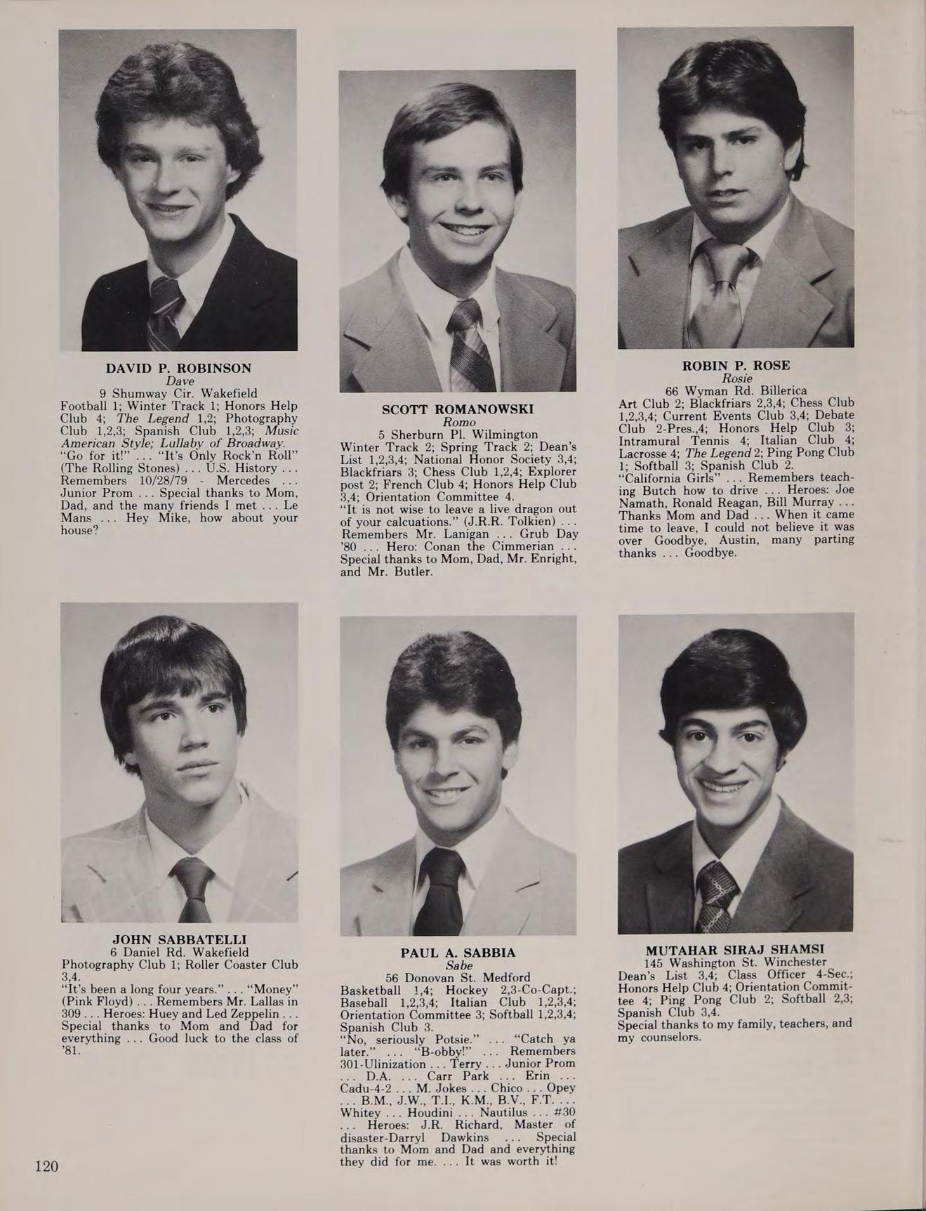 5 Lantern Ln. Wakefield Golf 1,2,3-Co-Capt., 4-Co-Capt. “Wanna go in_ hate?” “Reading period!” “See ya in the funnies!” ... “Play some cards!” “Born To Be Wild” ... “Turn the Page” ... Remembers the States ’78,80 ... Hero: Superman ... Special thanks to Mom, Dad, and Mr. Enfanto-I couldn’t have made it without you ... “I’ve been Ulinized!” ... Disco Dom ... Bob Seger was unreal ... I’m on the five year plan ... Smoke show .. Bob 79... John ’80 ... “I still think about you D. F.”... Mick .,. “I want four white ones.” ... Later-much.