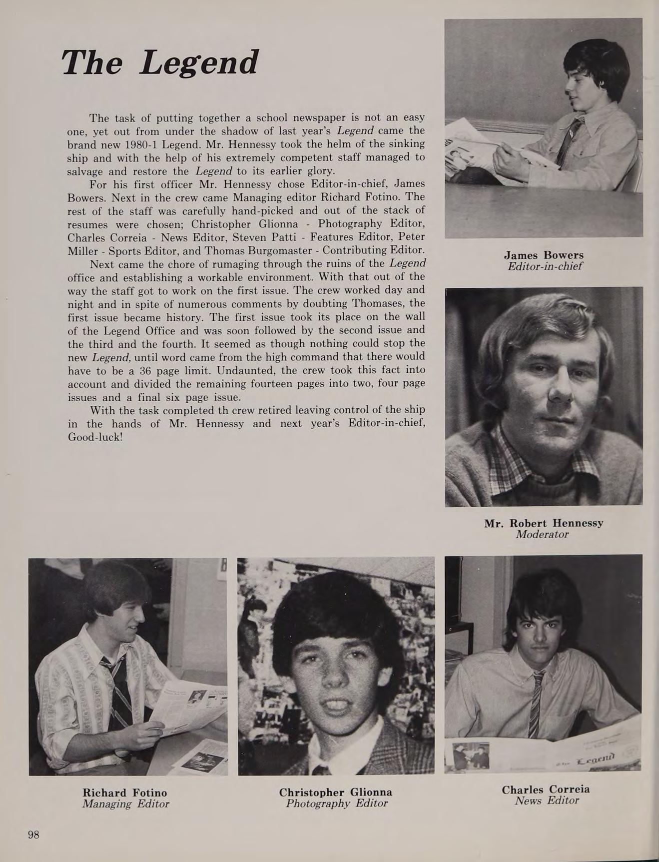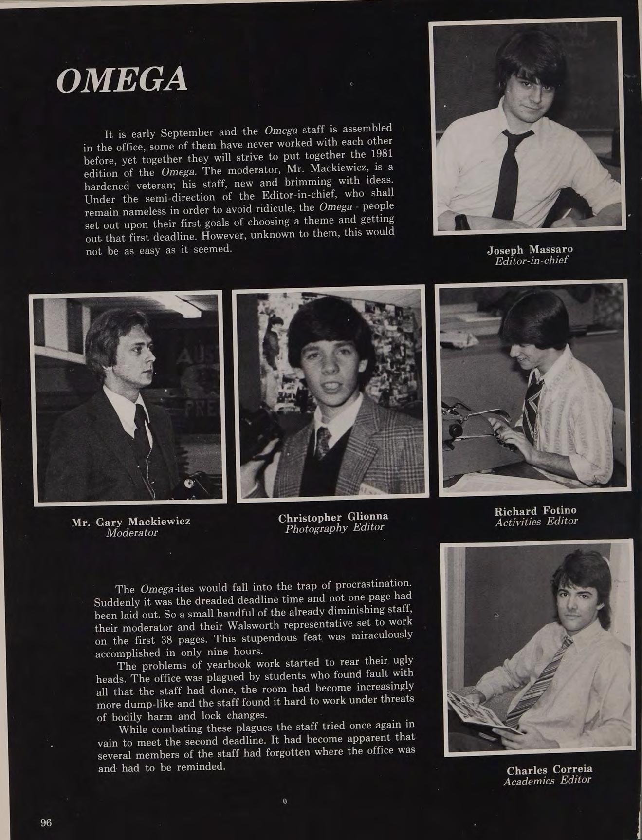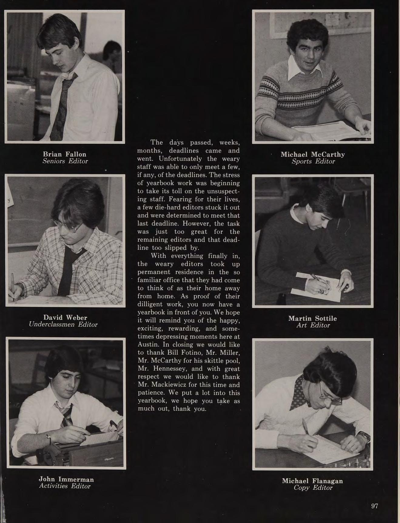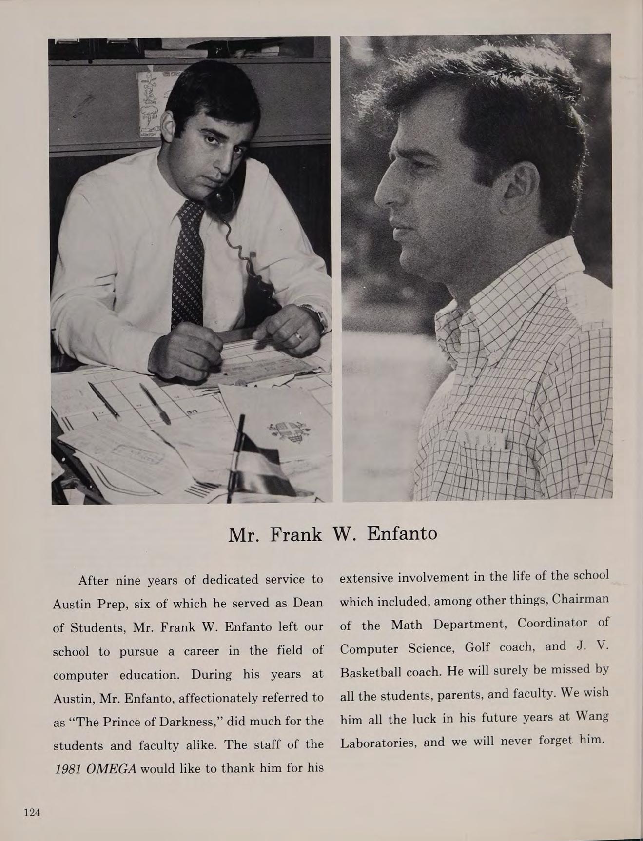 After nine years of dedicated service to Austin Prep, six of which he served as Dean of Students, Mr. Frank W. Enfanto left our school to pursue a career in the field of computer education. During his years at Austin, Mr. Enfanto, affectionately referred to as “The Prince of Darkness,” did much for the students and faculty alike. The staff of the 1981 OMEGA would like to thank him for his