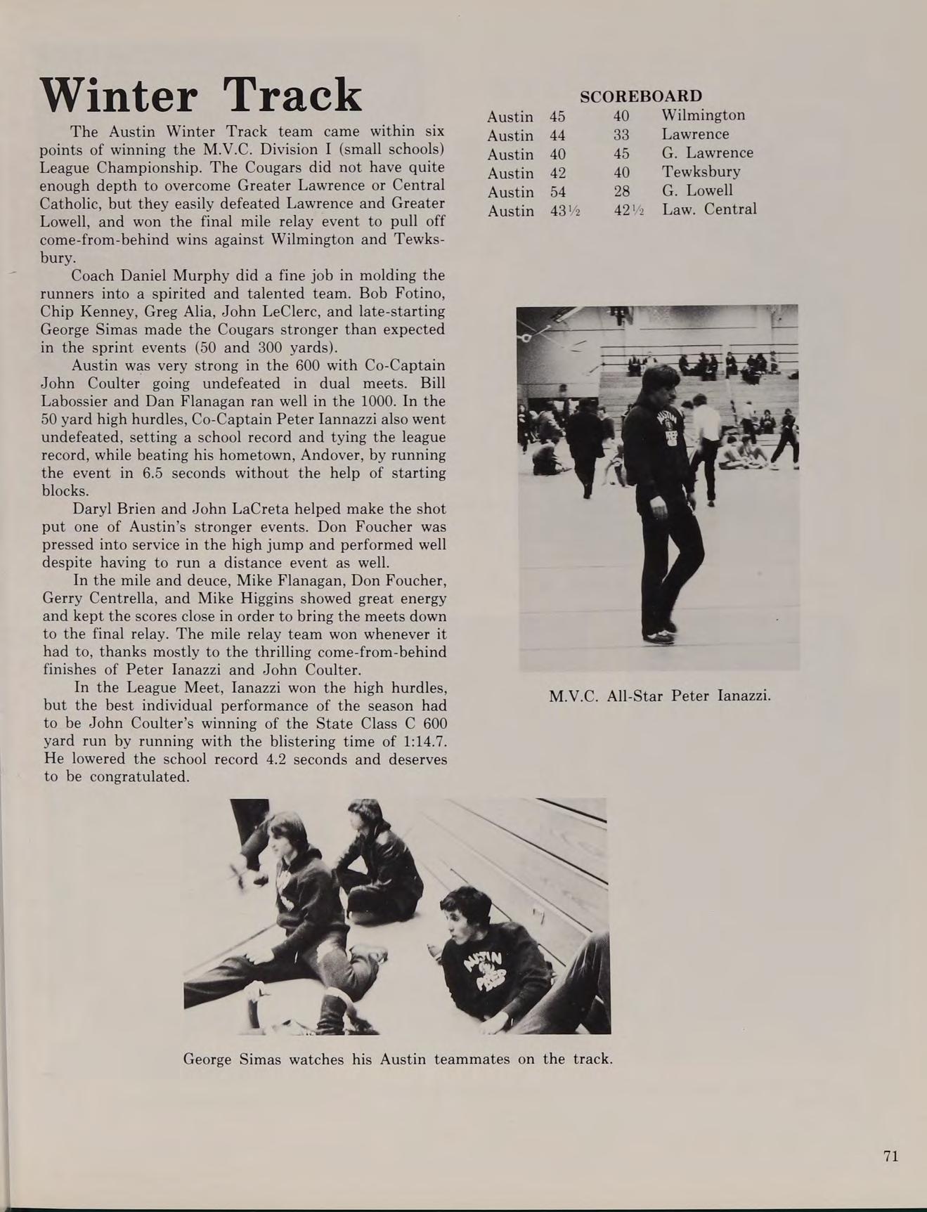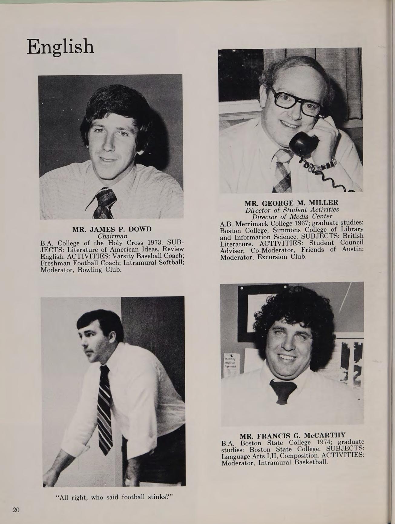 MR. eae DONE Been College, eae te os peed and Information Science. SUBJECTS: Britis B.A. College of the Holy Cross 1973. SUB- Literature. ACTIVITIES: Student Council JECTS: Literature of American Ideas, Review Adviser: Co-Moderator, Friends of Austin; English. ACTIVITIES: Varsity Baseball Coach; Moderator, Excursion Club. Freshman Football Coach; Intramural Softball; Moderator, Bowling Club.
