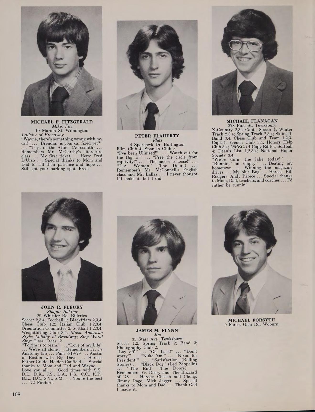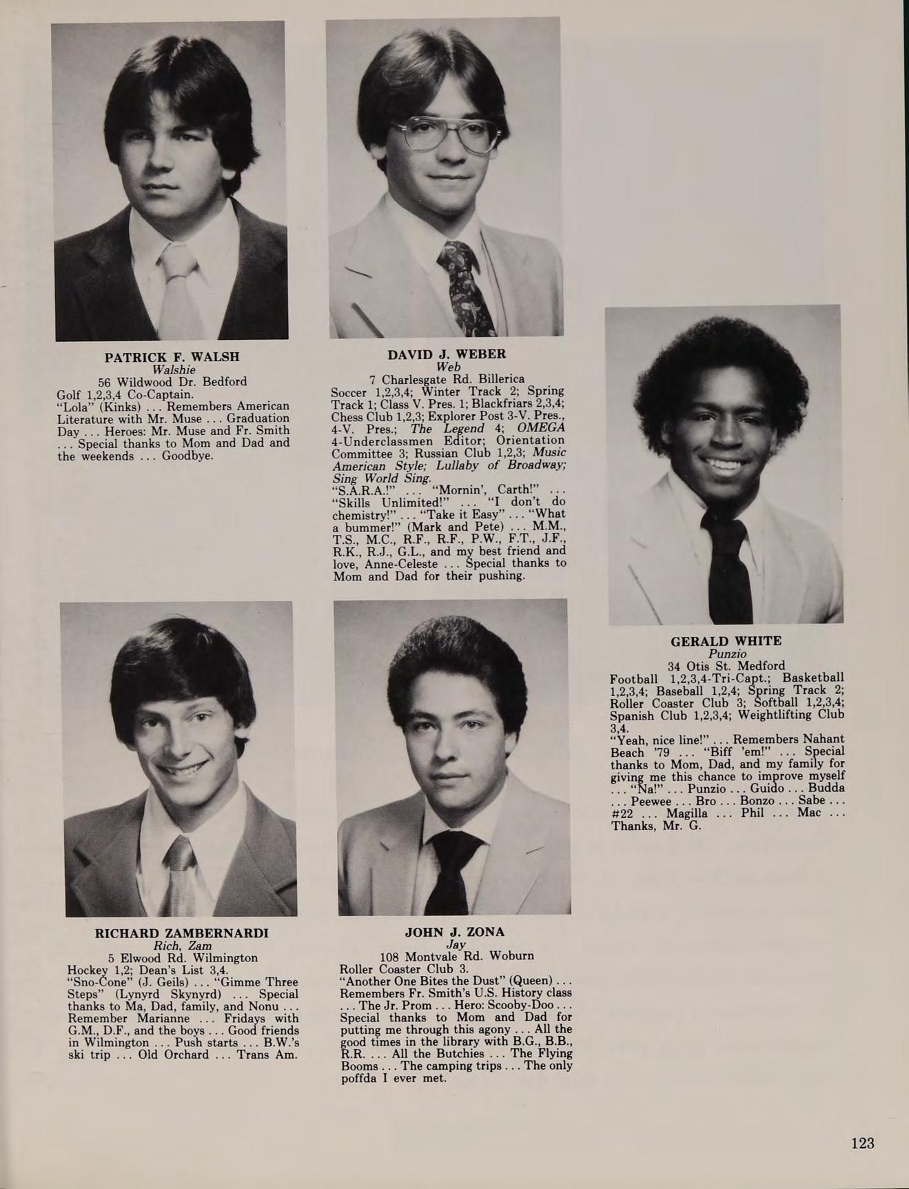 56 Wildwood Dr. Bedford Golf 1,2,3,4 Co-Captain. “Lola” (Kinks) ... Remembers American Literature with Mr. Muse ... Graduation Day ... Heroes: Mr. Muse and Fr. Smith ... Special thanks to Mom and Dad and the weekends ... Goodbye.