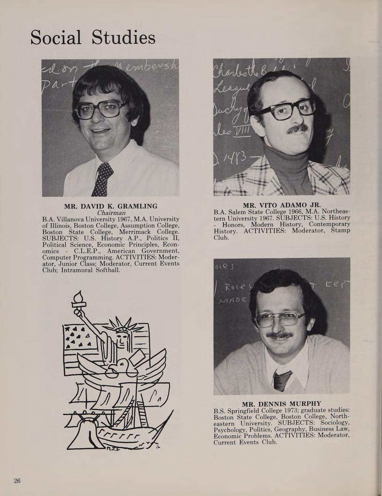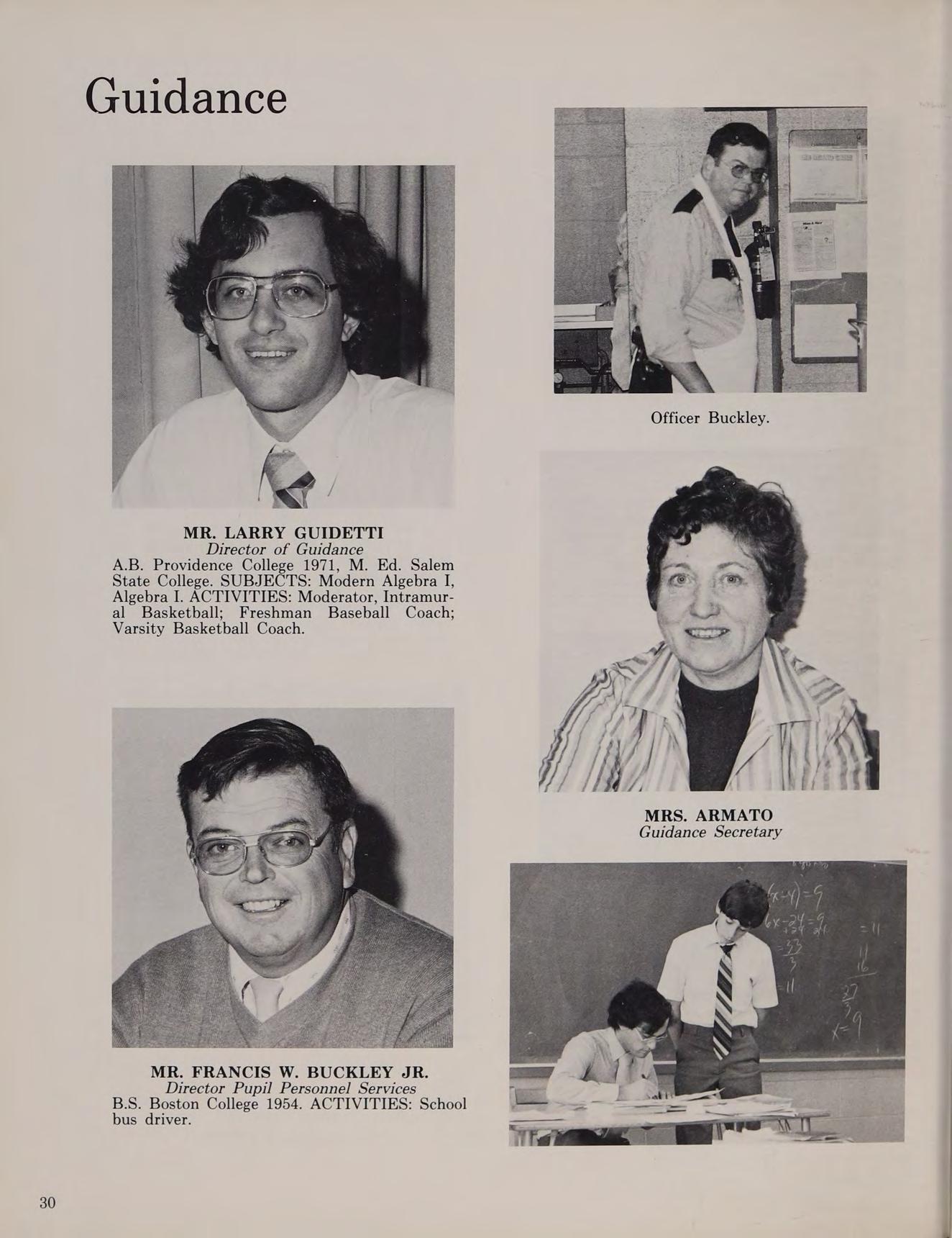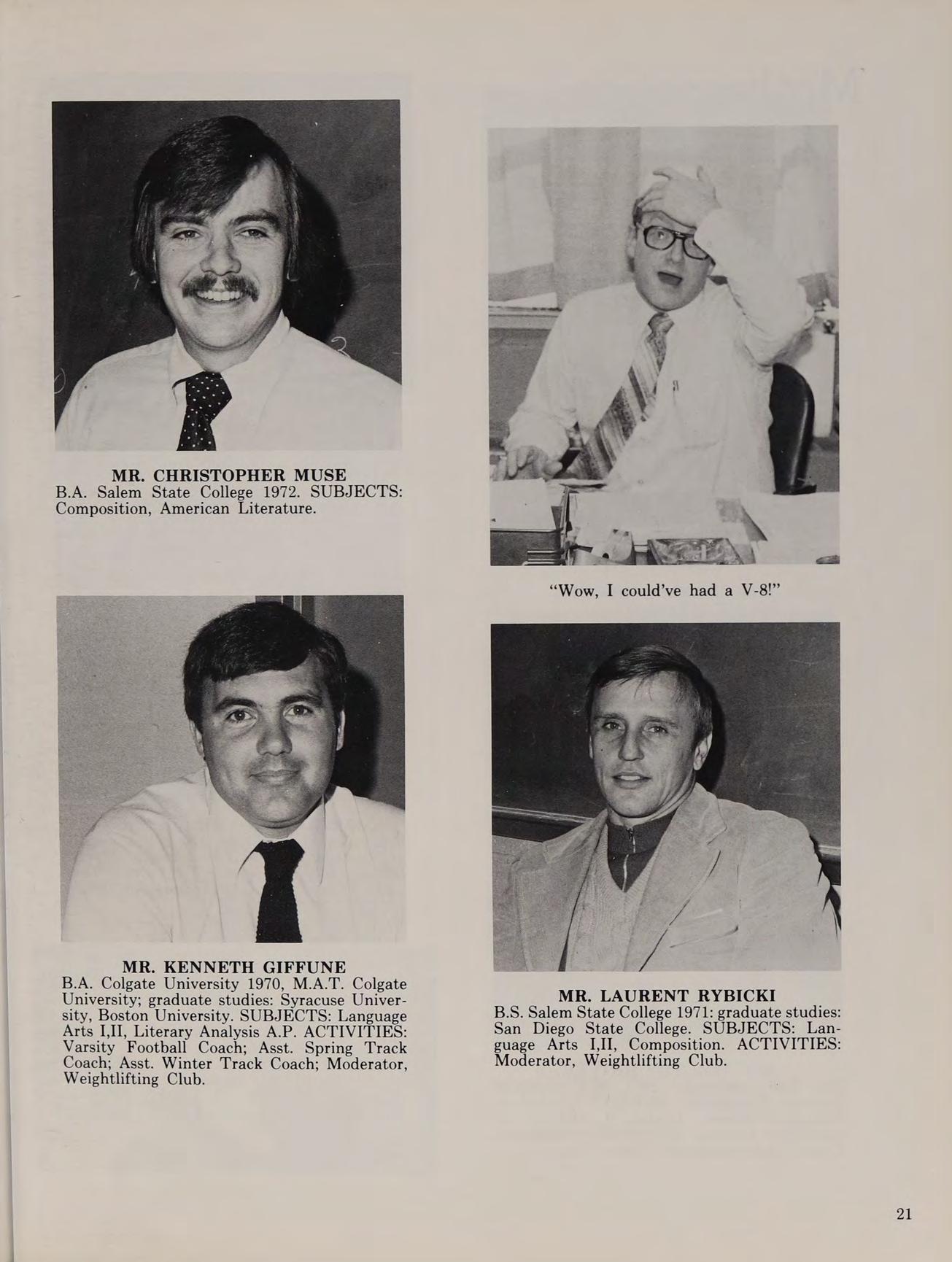 B.S. Salem State College 1971: graduate studies: San Diego State College. SUBJECTS: Language Arts I,IIJ, Composition. ACTIVITIES: Moderator, Weightlifting Club.
