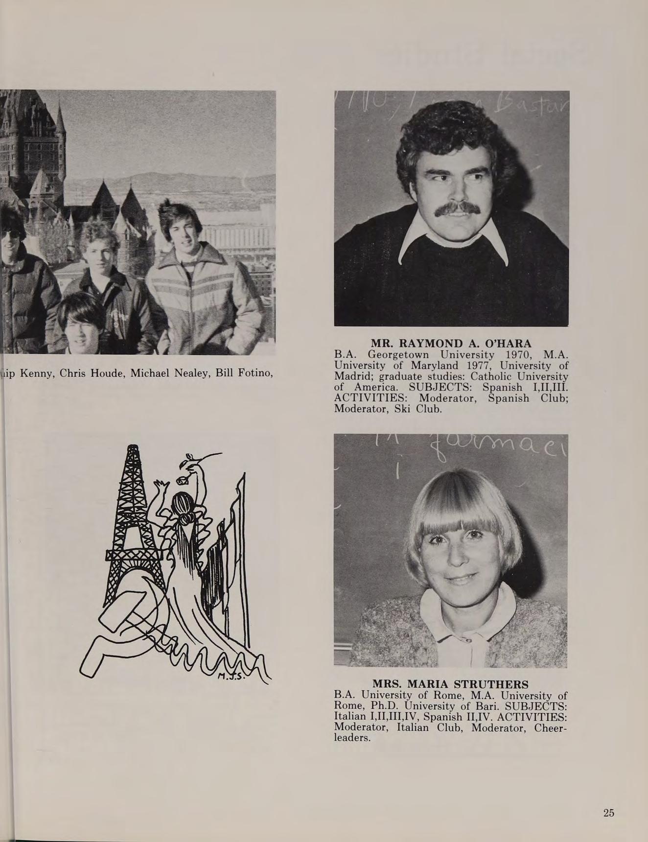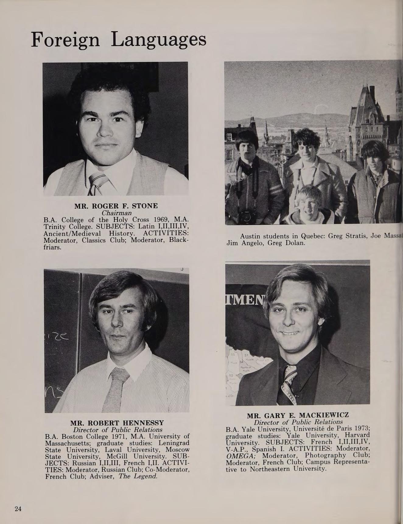B.A. Boston College 1971, M.A. University of Massachusetts; graduate studies: Leningrad State University, Laval University, Moscow State University, McGill University. SUBJECTS: Russian [,II,III, French I,J. ACTIVITIES: Moderator, Russian Club; Co-Moderator, French Club; Adviser, The Legend.