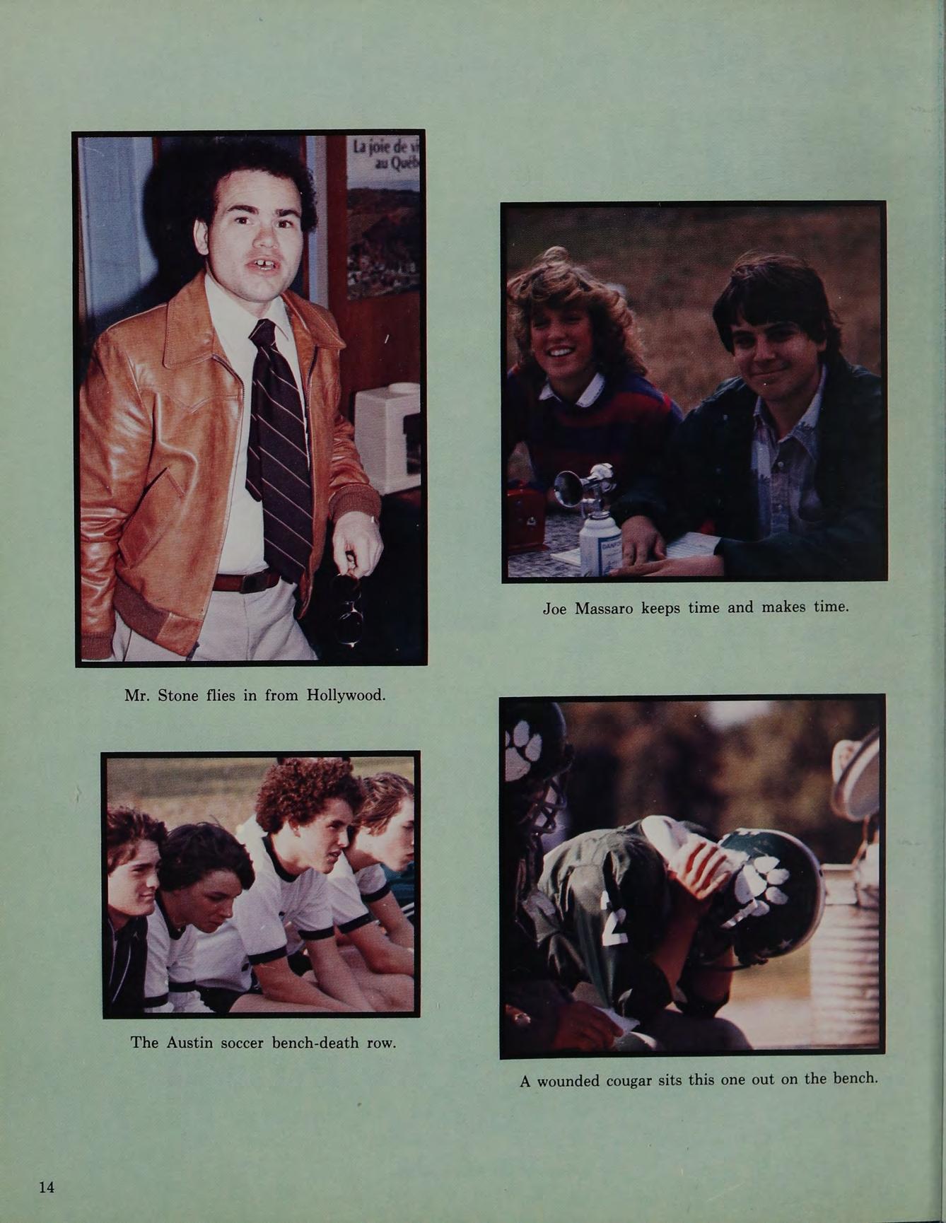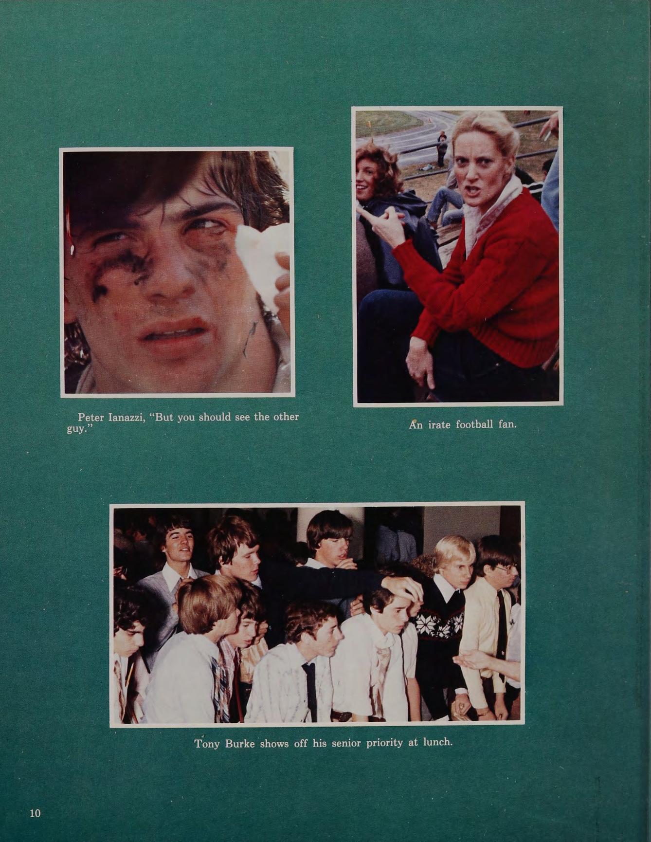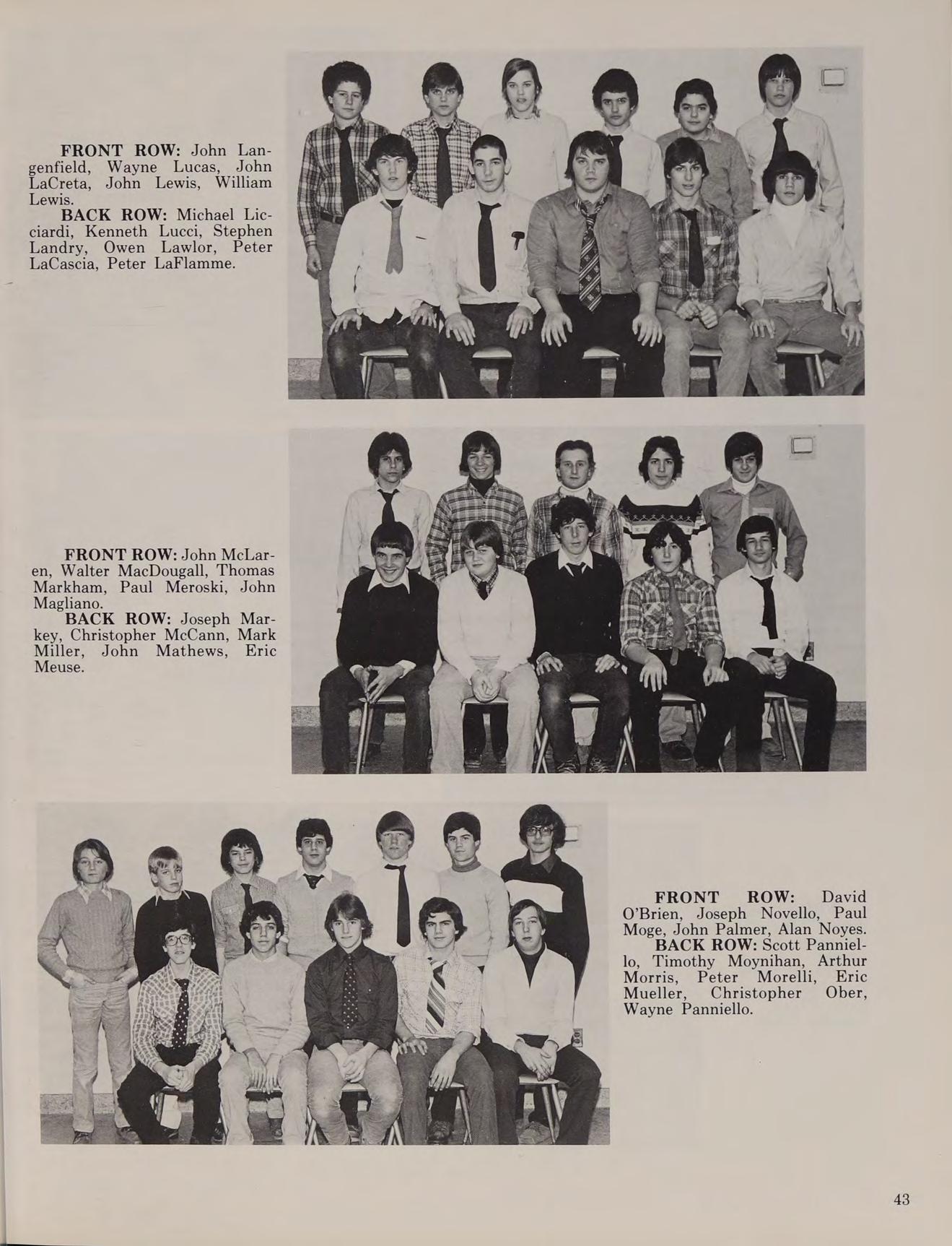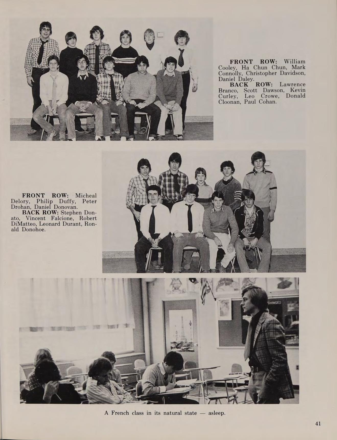 “Hey Quinno, how’s your car?” ... “Not another detention!” ... I’m going nutso!” ... “T.S.G.Q., I’m gone” ... “Take the Long Way Home” (Supertramp) ... Remembers 4/10/80 Fort Hill ... Porter’s Car ... Heroes: Monty Python and Benny Hill ... Special thanks to Mom and Dad ... Member of the Hole ... 426 hemi... N.H.R.D., blonde, blue-eyed Rachelle.