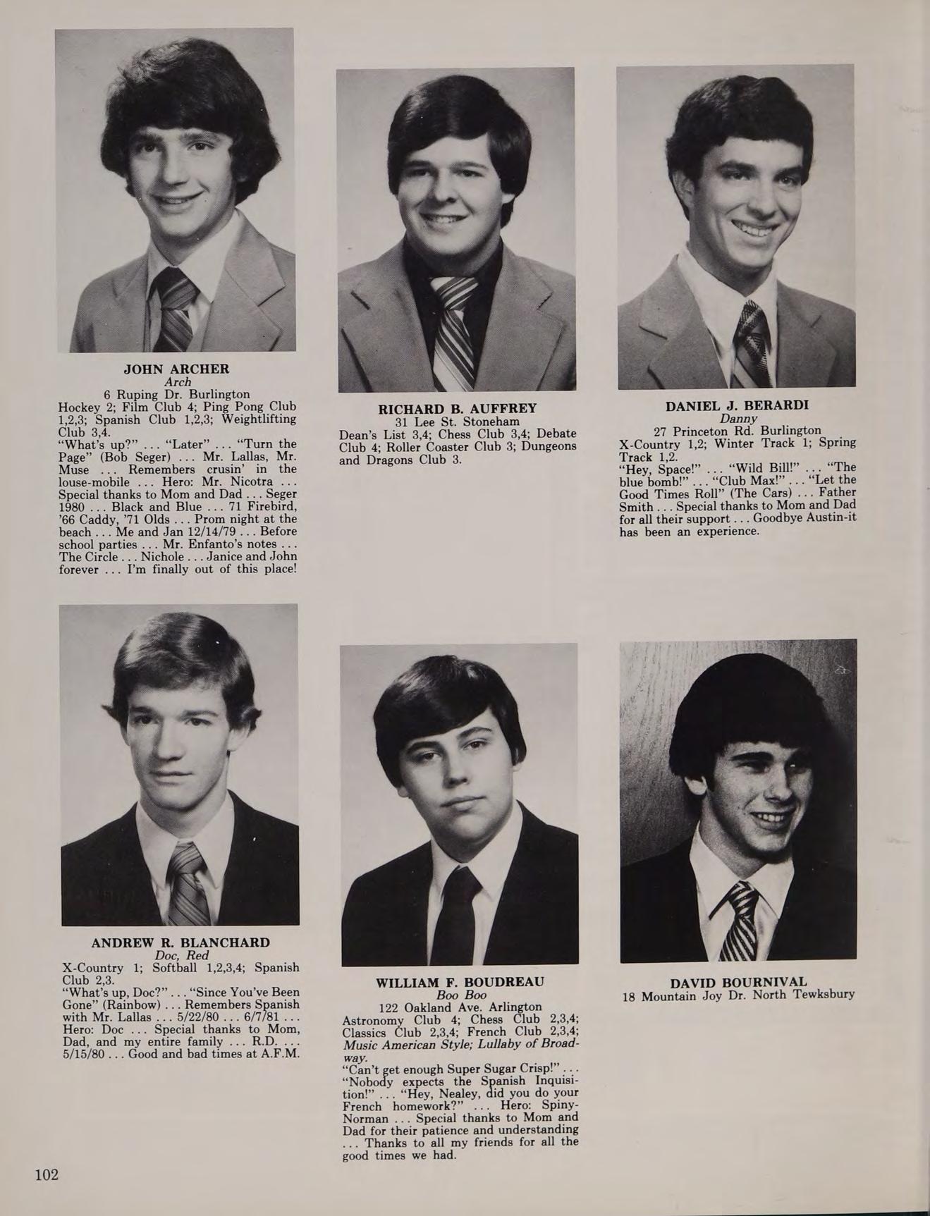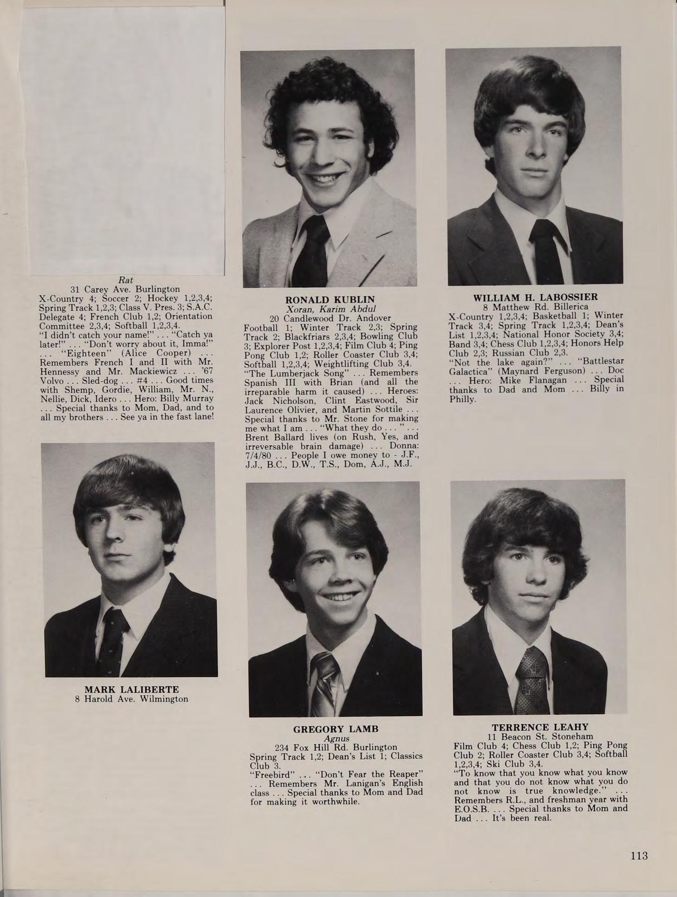 1 Moss St. Burlington Blackfriars 2,3; Classics Club 2,3,4; Current Events Club 3,4; Writers Club 1,2. “What do you think this is anyway?” ... “Cherish” (Association) ... Remembers Mr. Adamo’s history class Sir Thomas Moore, and Constantine - they never gave in ... Special thanks to my parents, my money, and my teachers ... Camping ... The library ... Flying Booms forever ... Cruising in the Pumpkinmobile ... “It’s all within yourself, no one else can make you change.” George Harrison).