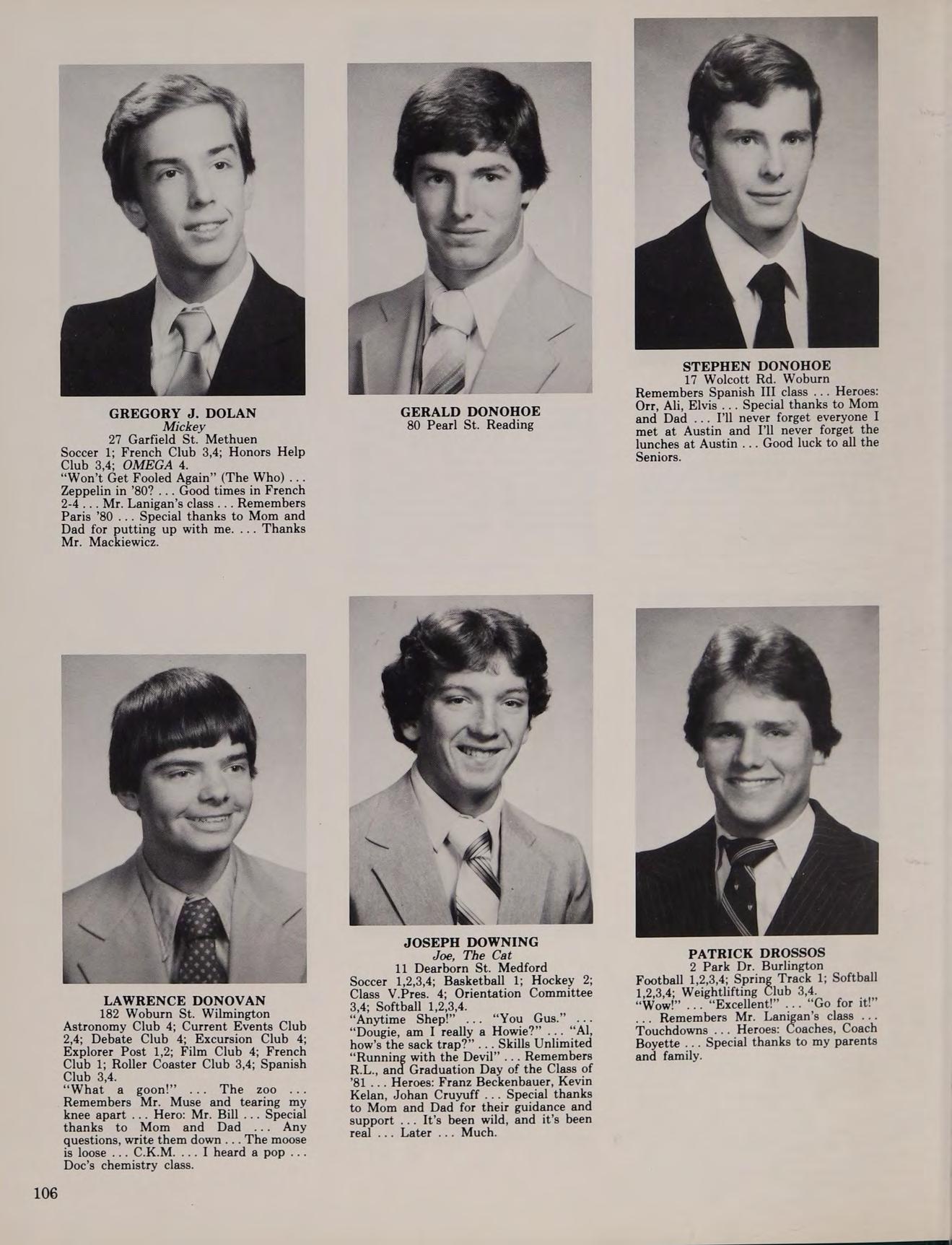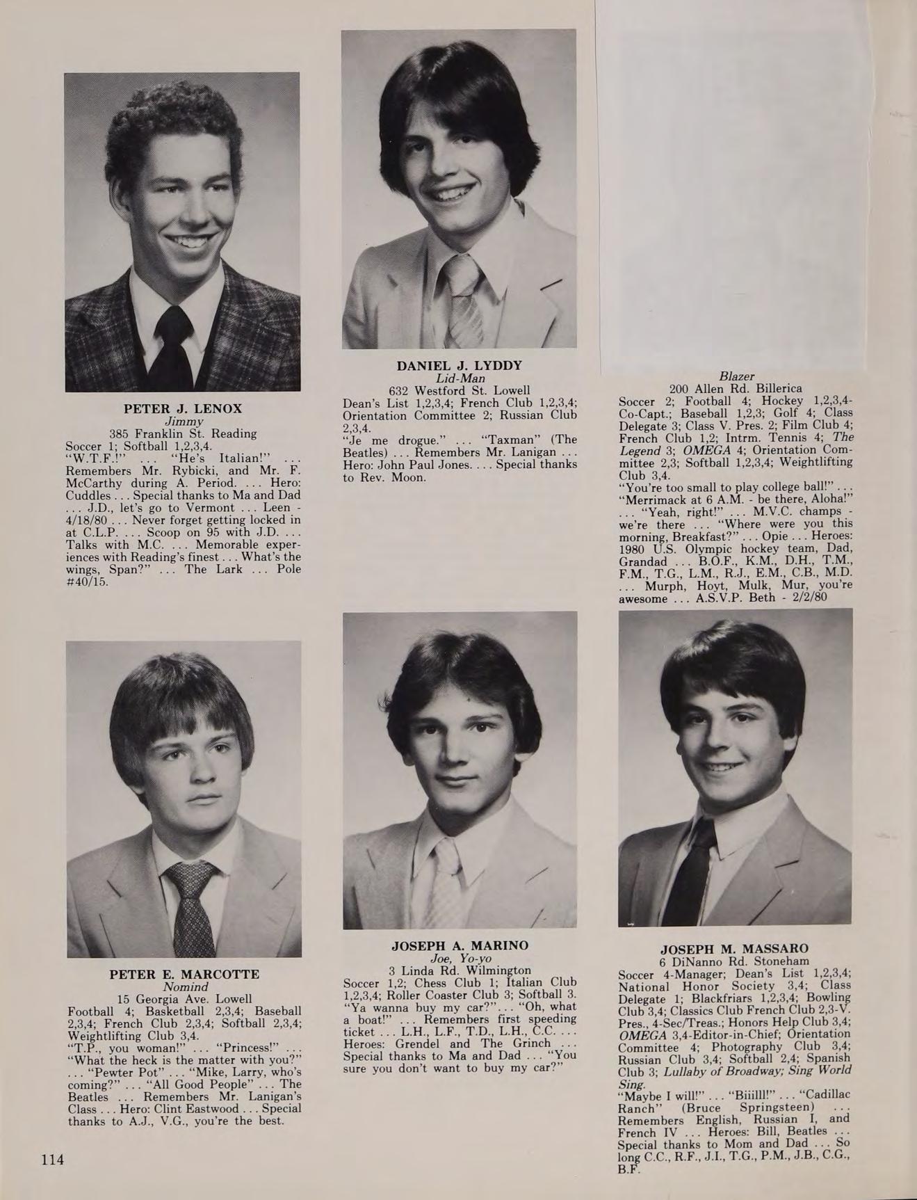 56 Donovan St. Medford Basketball 1,4; Hockey 2,3-Co-Capt.; Baseball 1,2,3,4; Italian Club 1,2,3,4; Orientation Committee 3; Softball 1,2,3,4; Spanish Club 3. “No, seriously Potsie.” ... “Catch ya later.” “B-obby!”’ Remembers 301-Ulinization ... Terry ... Junior Prom Se DAG) Carr Park 77> rine. Cadu-4-2 ... M. Jokes ... Chico... Opey eB Me SW KEM BiVe Whitey ... Houdini ... Nautilus ... #30 Heroes: J.R. Richard, Master of disaster-Darryl Dawkins Special thanks to Mom and Dad and everything they did for me. ... It was worth it!