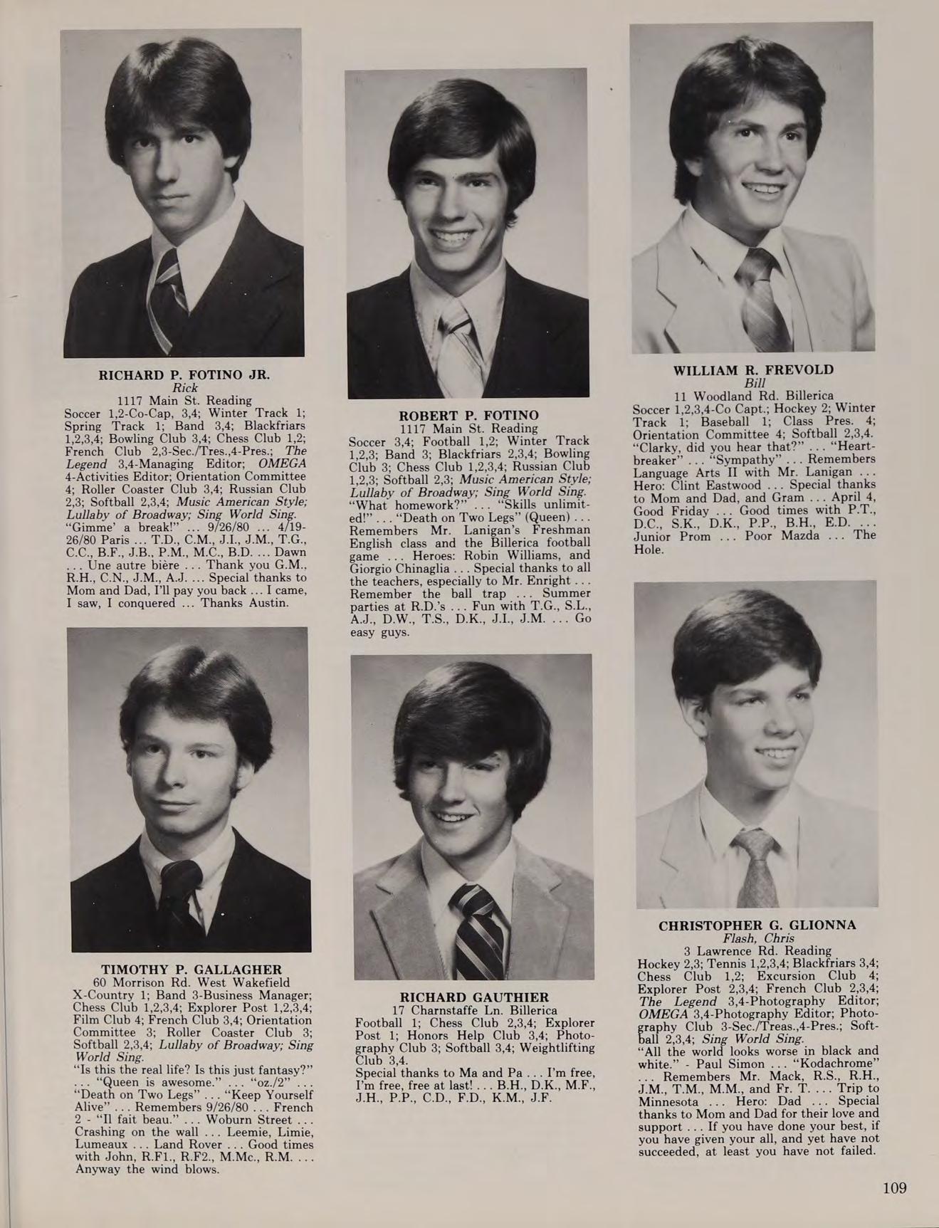 7 Charlesgate Rd. Billerica Soccer 1,2,3,4; Winter Track 2; Spring Track 1; Class V. Pres. 1; Blackfriars 2,3,4; Chess Club 1,2,3; Explorer Post 3-V. Pres., 4-V. Pres.; The Legend 4; OMEGA 4-Underclassmen Editor; Orientation Committee 3; Russian Club 1,2,3; Music American Style; Lullaby of Broadway; Sing World Sing.