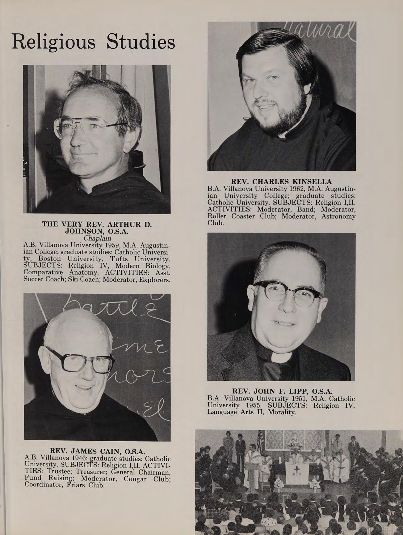 B.A. Villanova University 1962, M.A. Augustinian University College; graduate studies: Catholic University. SUBJECTS: Religion I,II. ACTIVITIES: Moderator, Band; Moderator, Roller Coaster Club; Moderator, Astronomy