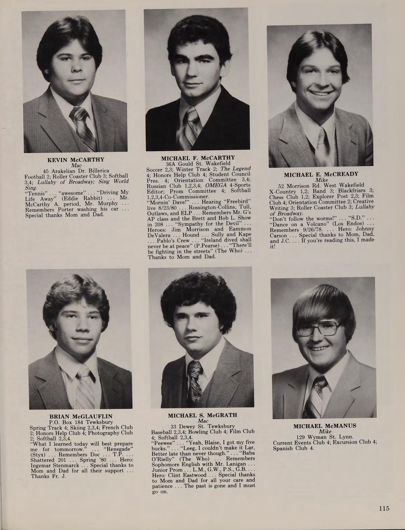 “Erin Go Braugh!” ... “Long Live Rock” (The Who) ... Van Halen ... Black Sabbath ... Aerosmith... WCOZ... The Beatles ... Ted Nugent Doc’s D period chemistry class ... Mr. Lanigan’s class ... Remembers “The Enforcer” ... “Magic Bus” ... Hooty ... Army surplus clothes .. Heroes: Clint Eastwood, John Glenn ... Special thanks to Mom, Dad, T.I., and MSS. ... Free at last ... It’s been a long and winding road, yet there is a lot to be discovered in the roads ahead.
