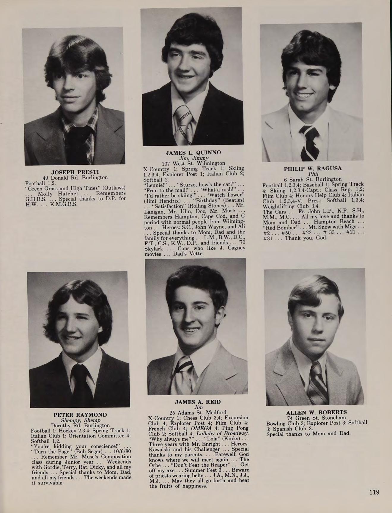 6 Sarah St. Burlington Football 1,2,3,4; Baseball 1; Spring Track 4: Skiing 1,2,3,4-Capt.; Class Rep. 1,2; Film Club 4; Honors Help Club 4; Italian Club 1,2,3,4-V. Pres.; Softball 1,3,4; Weightlifting Club 3,4. MhesCarsie Br John labs BRebseorde, M.M., M.C. ... All my love and thanks to Mom and Dad ... Hampton Beach ... “Red Bomber”... Mt. Snow with Migs... 49). | HAO. HOD ee oo ee ele, #31... Thank you, God.
