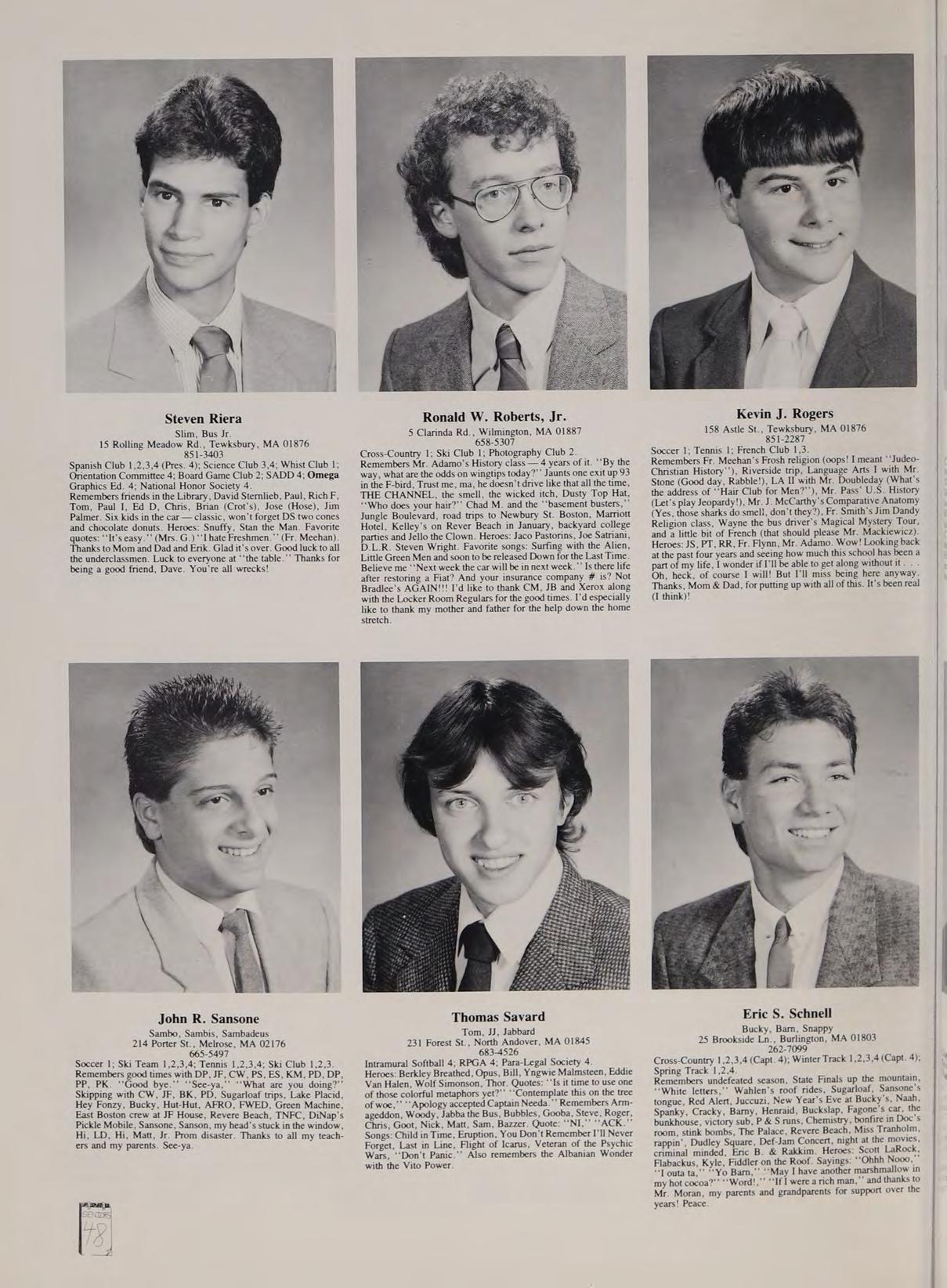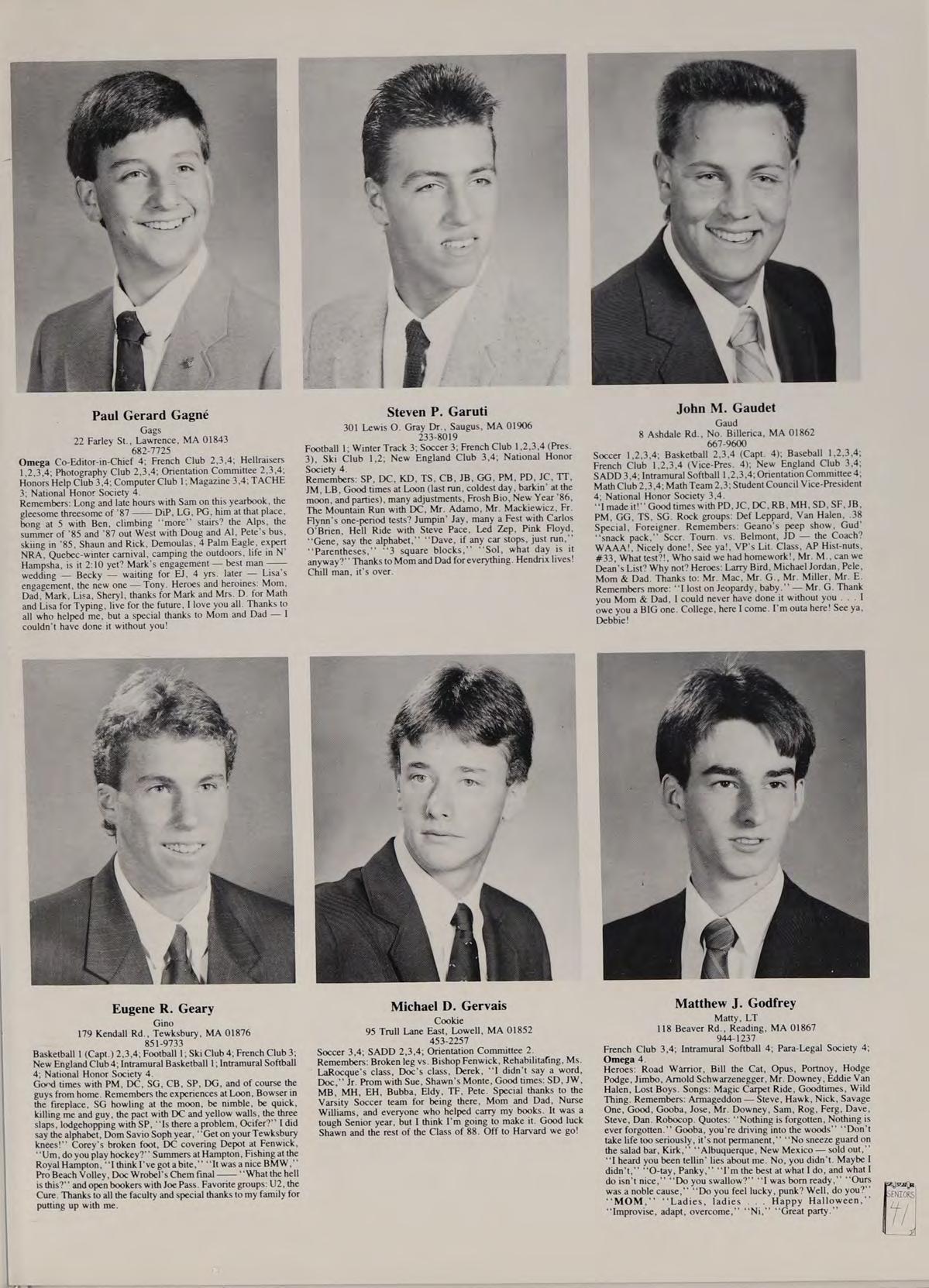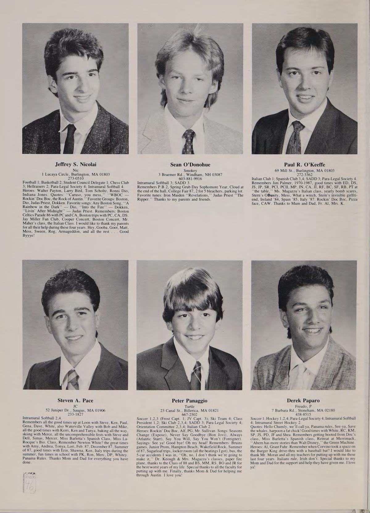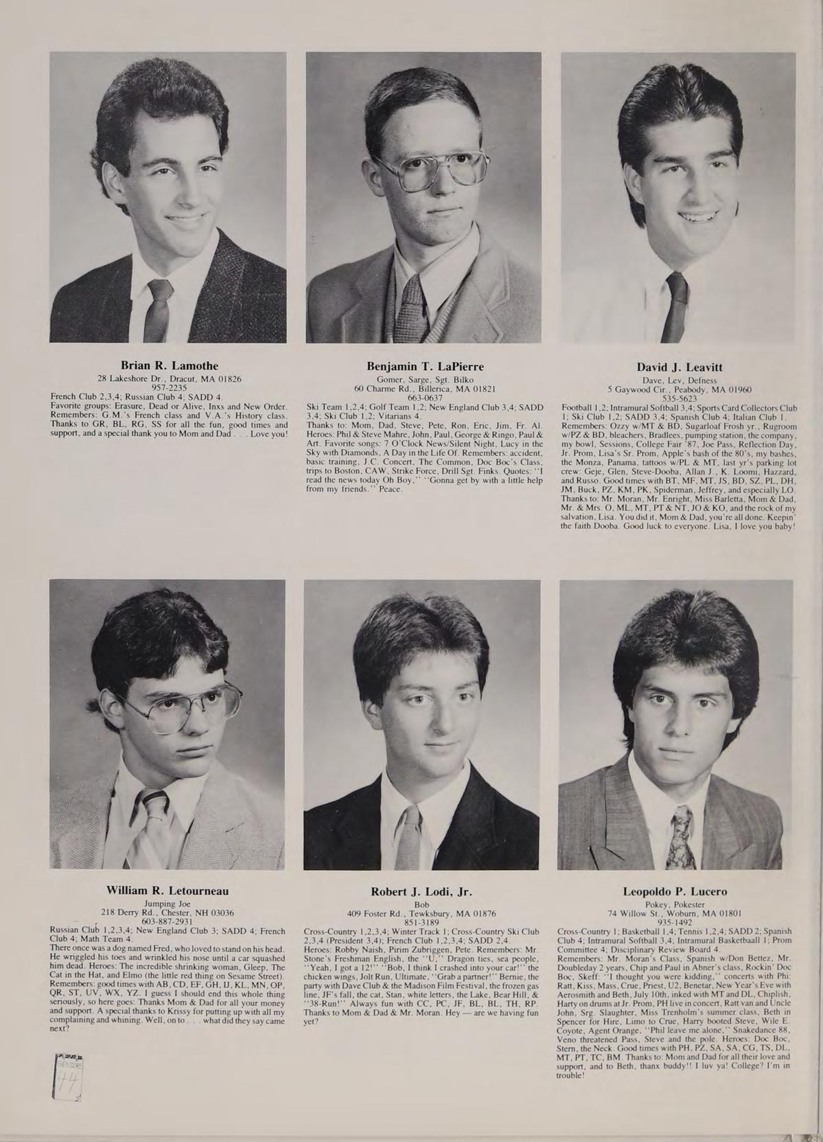 Soccer 2; Spanish Club 2,3,4 (Treasurer 4); French Club ,2,3,4; New England Club 3,4; Para-Legal Society 3,4; Russian Club 3; SADD 3,4. Remembers: ‘‘That’s a nice car,’’ Miss Trenholm’s class, football game; Eugene intense, sign stealers stopped, Quebec assault, pool party, firework war, Salisbury Beach, Hockey game over Russians, Cruisin’ with Rich, Barbeque, Halloween breakfast, slush, bombings, Ms. LaRocque’s class, four years with Mr. Adamo, Cop stopages, Jim Palmer, Friendly’s frolics, hoop with Goodrow, look at that chick, Orson. Phrases: See-ya, Good kid, Hero, Nice! neither here nor there, you mess, wreck, follow them messes, get a life. Heroes: Rockin Doc Boc, Stan the Man, Eugene, Samantha Fox. Favorite songs: Is this Love, Jump, Shake Your Love, Touch Me, Peter Gunn. Good times with: Goodrow, Ed, BC, DS, SR, CR, CAA, PG, SF, MC. Special thanks to Mom.