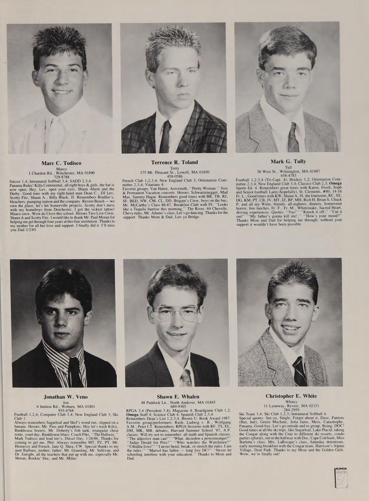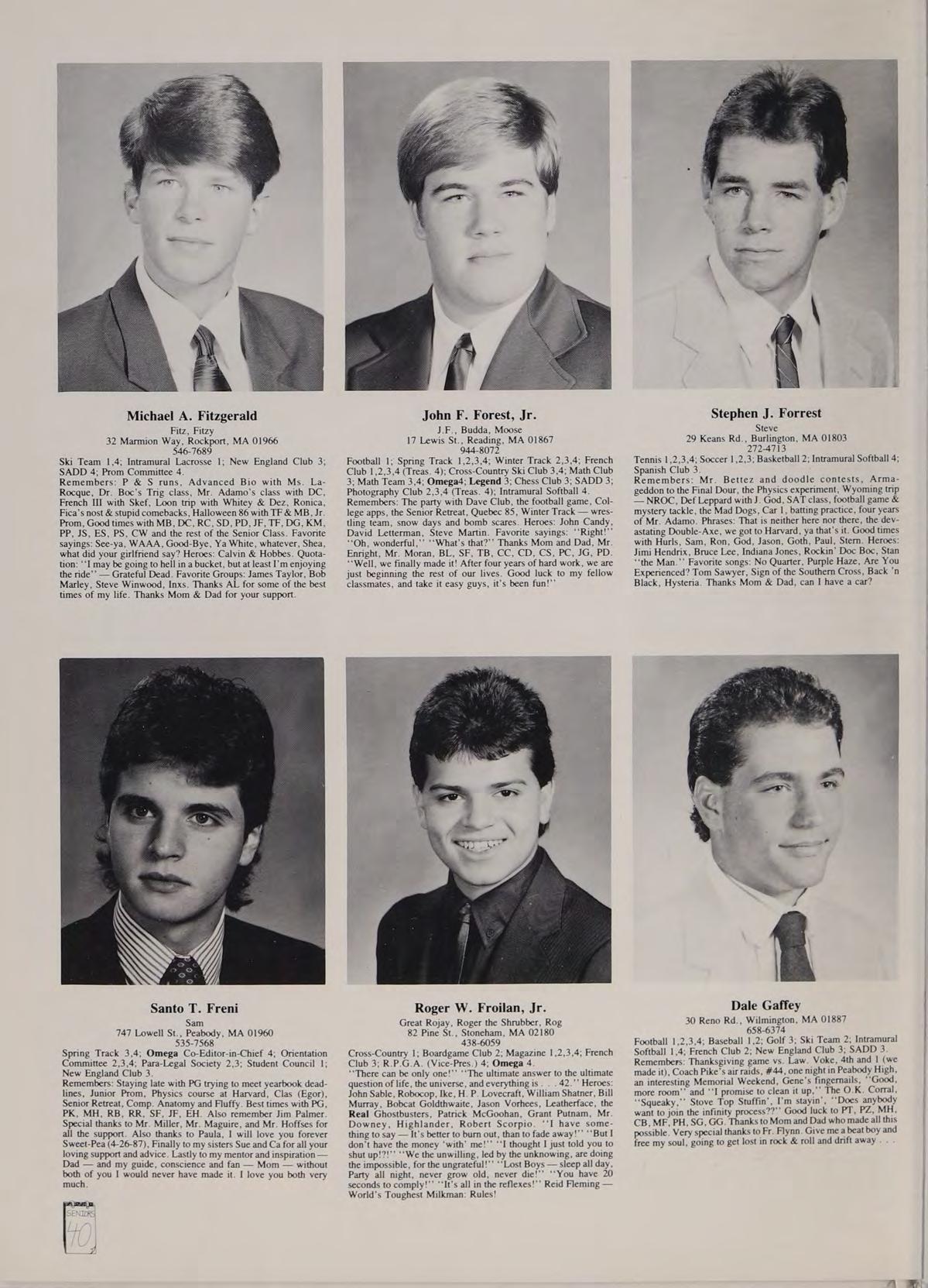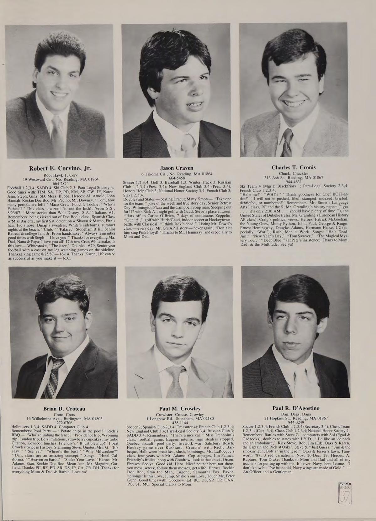 Soccer 2; Spanish Club 2,3,4 (Treasurer 4); French Club ,2,3,4; New England Club 3,4; Para-Legal Society 3,4; Russian Club 3; SADD 3,4. Remembers: ‘‘That’s a nice car,’’ Miss Trenholm’s class, football game; Eugene intense, sign stealers stopped, Quebec assault, pool party, firework war, Salisbury Beach, Hockey game over Russians, Cruisin’ with Rich, Barbeque, Halloween breakfast, slush, bombings, Ms. LaRocque’s class, four years with Mr. Adamo, Cop stopages, Jim Palmer, Friendly’s frolics, hoop with Goodrow, look at that chick, Orson. Phrases: See-ya, Good kid, Hero, Nice! neither here nor there, you mess, wreck, follow them messes, get a life. Heroes: Rockin Doc Boc, Stan the Man, Eugene, Samantha Fox. Favorite songs: Is this Love, Jump, Shake Your Love, Touch Me, Peter Gunn. Good times with: Goodrow, Ed, BC, DS, SR, CR, CAA, PG, SF, MC. Special thanks to Mom.