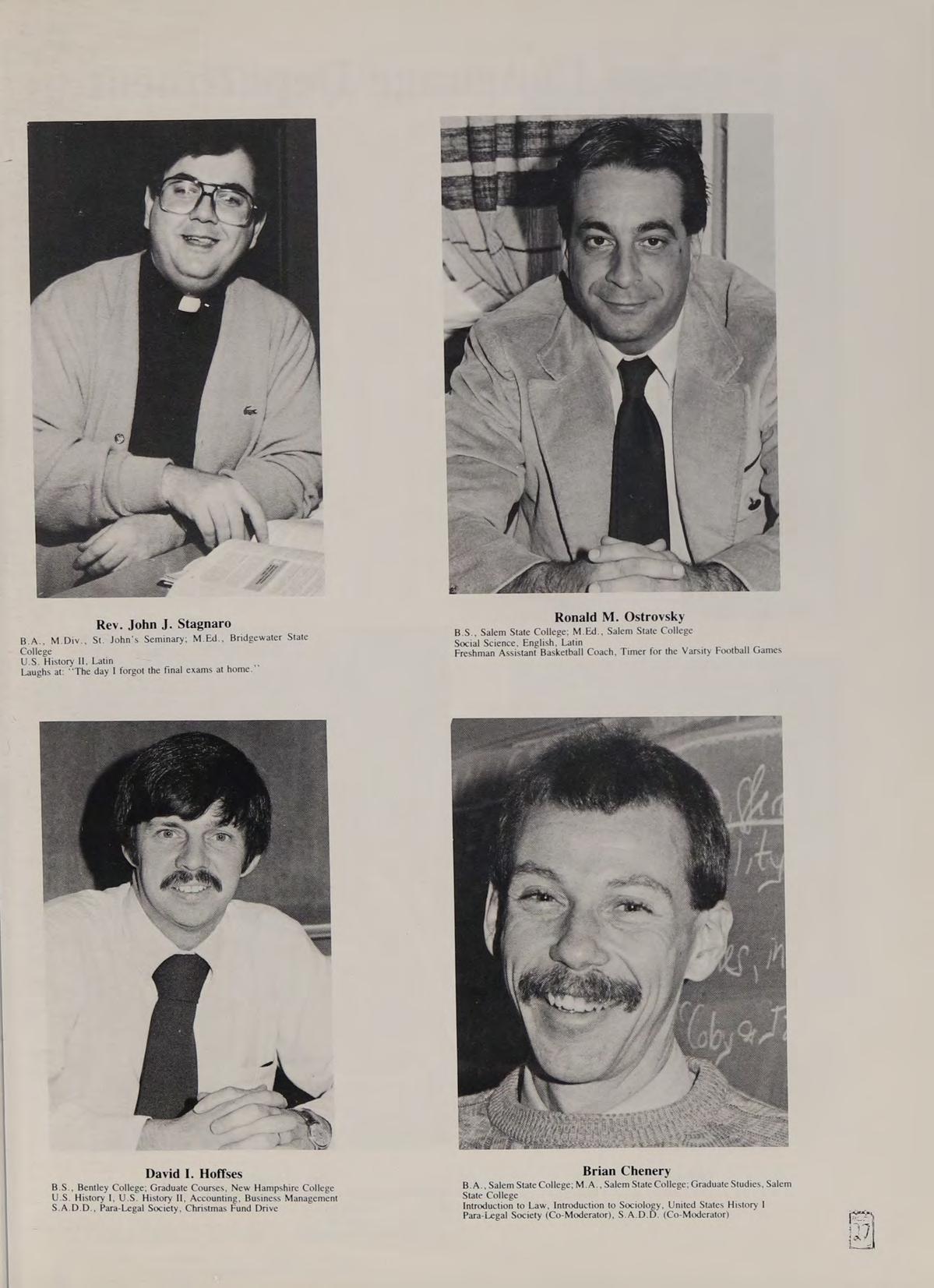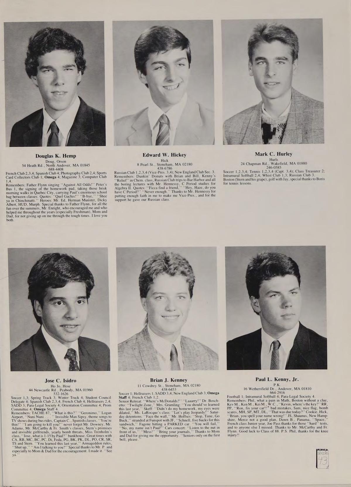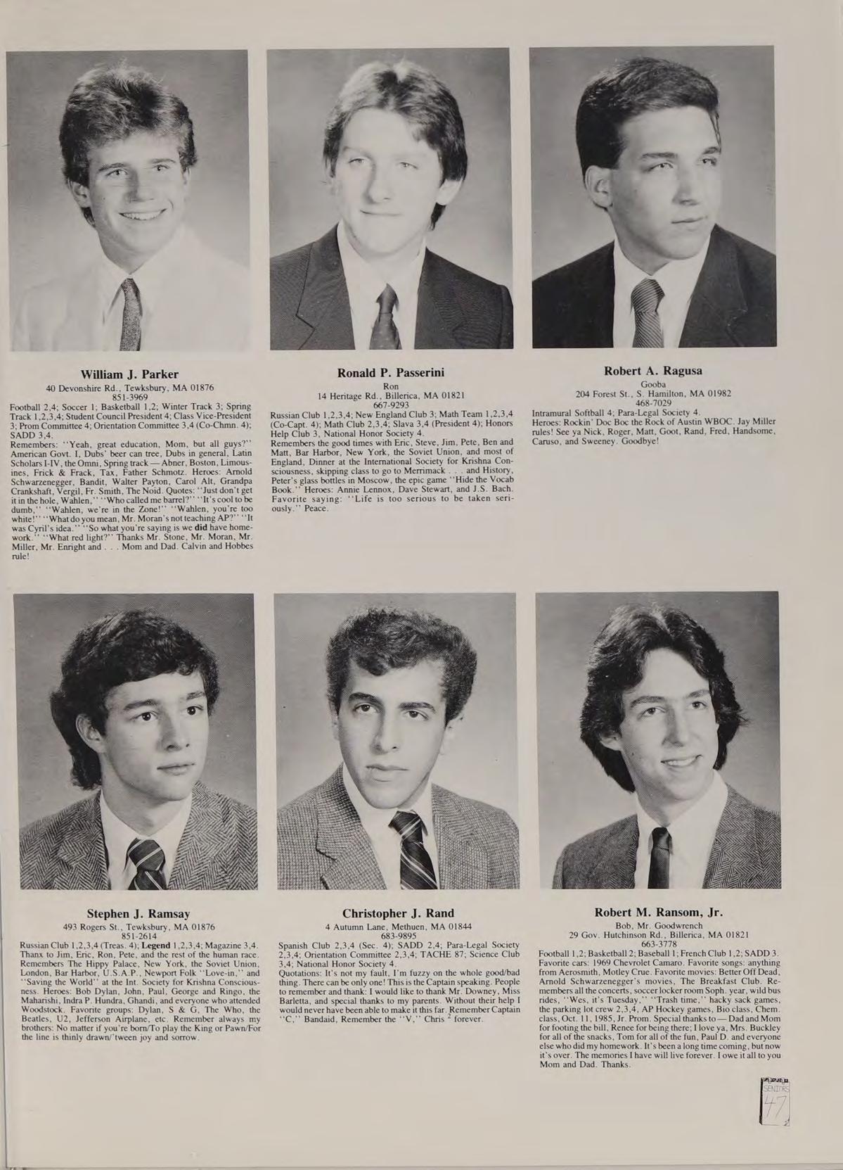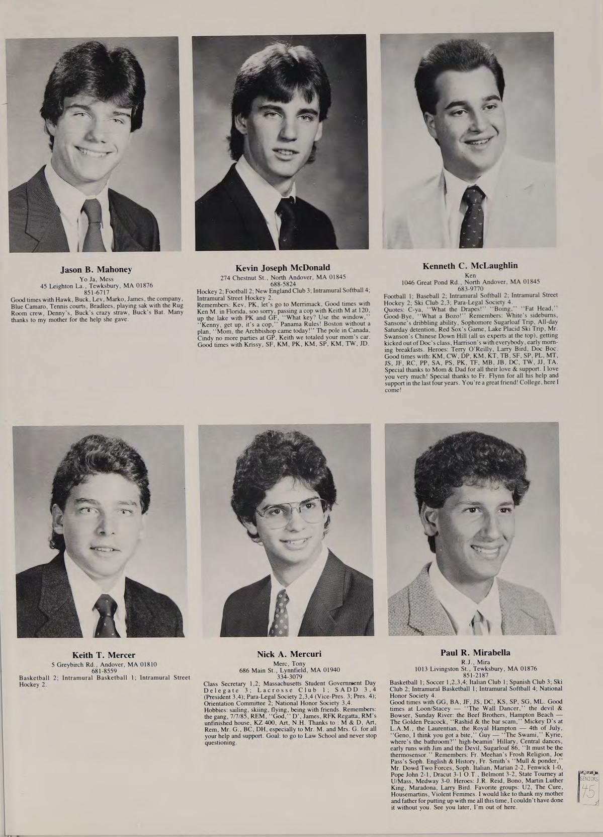 Soccer 2; Spanish Club 2,3,4 (Treasurer 4); French Club ,2,3,4; New England Club 3,4; Para-Legal Society 3,4; Russian Club 3; SADD 3,4. Remembers: ‘‘That’s a nice car,’’ Miss Trenholm’s class, football game; Eugene intense, sign stealers stopped, Quebec assault, pool party, firework war, Salisbury Beach, Hockey game over Russians, Cruisin’ with Rich, Barbeque, Halloween breakfast, slush, bombings, Ms. LaRocque’s class, four years with Mr. Adamo, Cop stopages, Jim Palmer, Friendly’s frolics, hoop with Goodrow, look at that chick, Orson. Phrases: See-ya, Good kid, Hero, Nice! neither here nor there, you mess, wreck, follow them messes, get a life. Heroes: Rockin Doc Boc, Stan the Man, Eugene, Samantha Fox. Favorite songs: Is this Love, Jump, Shake Your Love, Touch Me, Peter Gunn. Good times with: Goodrow, Ed, BC, DS, SR, CR, CAA, PG, SF, MC. Special thanks to Mom.