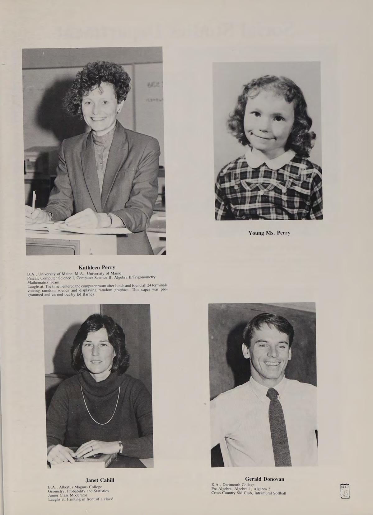 Remembers: ‘‘Y’know you have a beer holder on your head?”’ “*Yeah? Are there any left?’’ Newport Folk Festival with Steve, Jim and Mike, Ron’s ‘‘shampoo"’ in New York, the blurs we like to call England and Russia, Pete’s unending bottle launches via the windows, the immortal peace sign, crossing streets in Boston: ‘*We’re all gonna die!’’ the thing we call a party and saying the alphabet in three languages; *‘Don’t worry about it!’’ Jim’s everpopular contortionist impressions and beverage orders on planes, the fine art of Dean’s Listing by Steve, Ron’s Merrimack course in History?! Heroes: Those who work for peace, the Frugal Gourmet. Special thanks to Mum, Dad, Cindy and Certs. Peace, love and understanding.